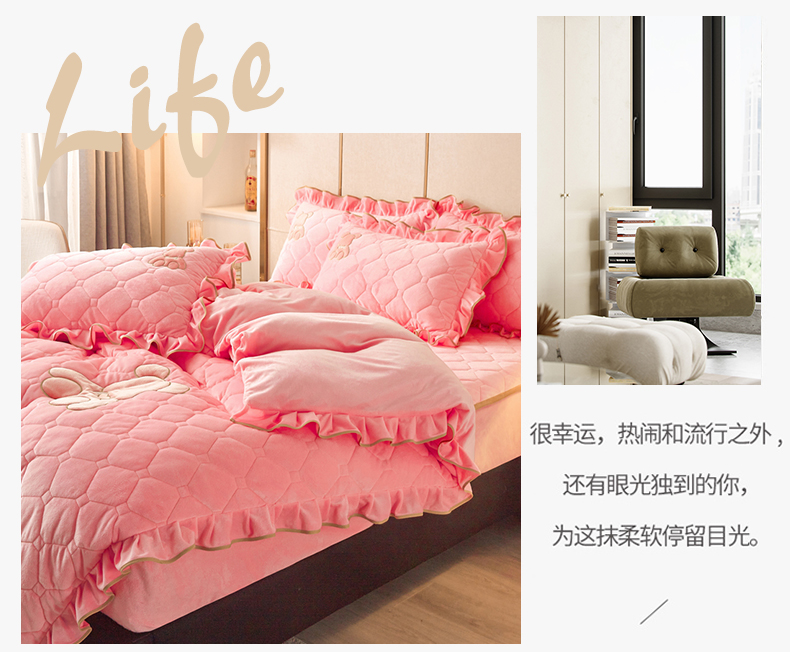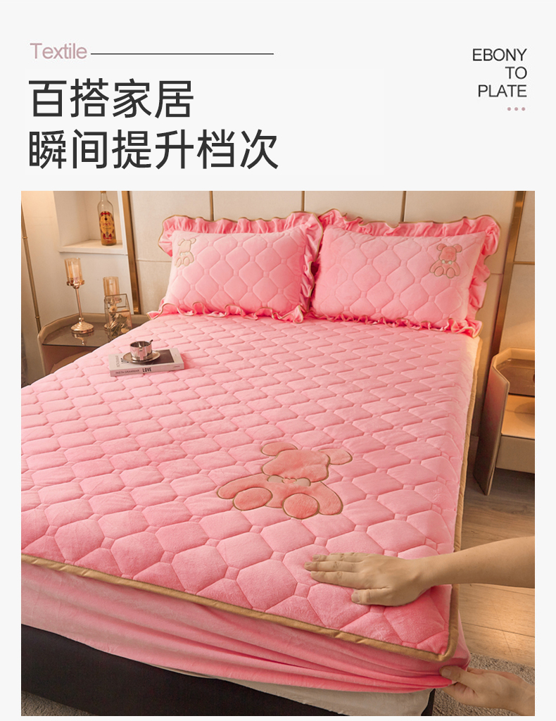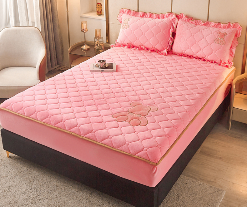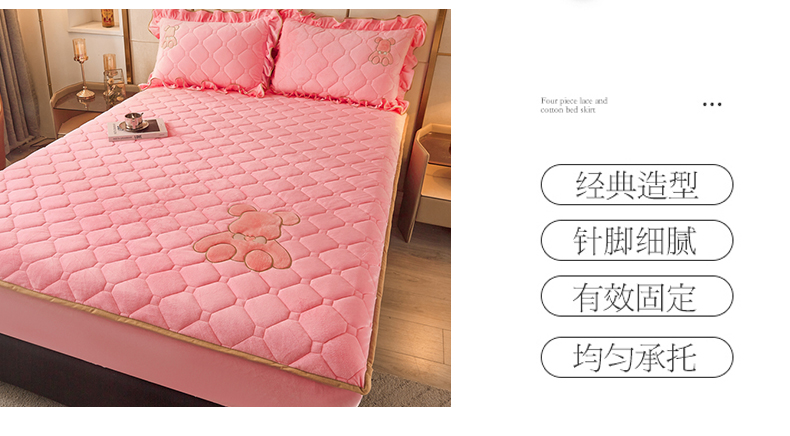 屹成 2024新款水晶绒夹棉床笠款四件套贴布绣款-小熊款 粉玉