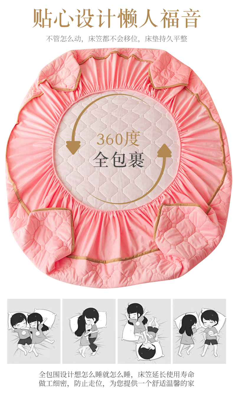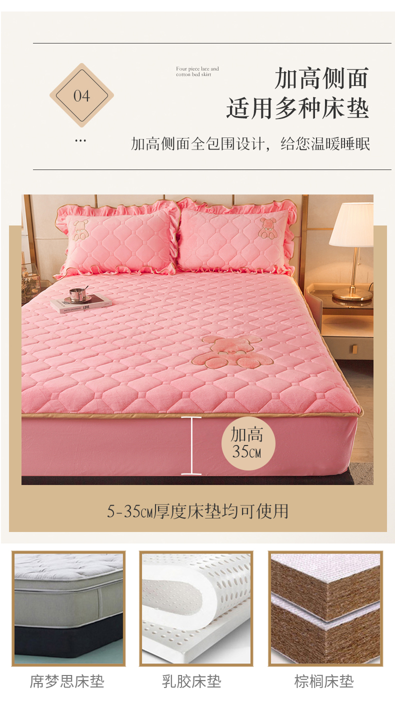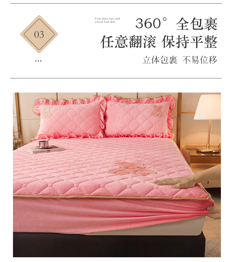 (总)屹成家纺2025新款水晶绒夹棉绗缝蕾丝床裙三件套(塞纳河畔)床裙单件起售价不低于105元,大红,豆沙,翡翠绿,粉玉,橄榄绿,蔚蓝,银灰