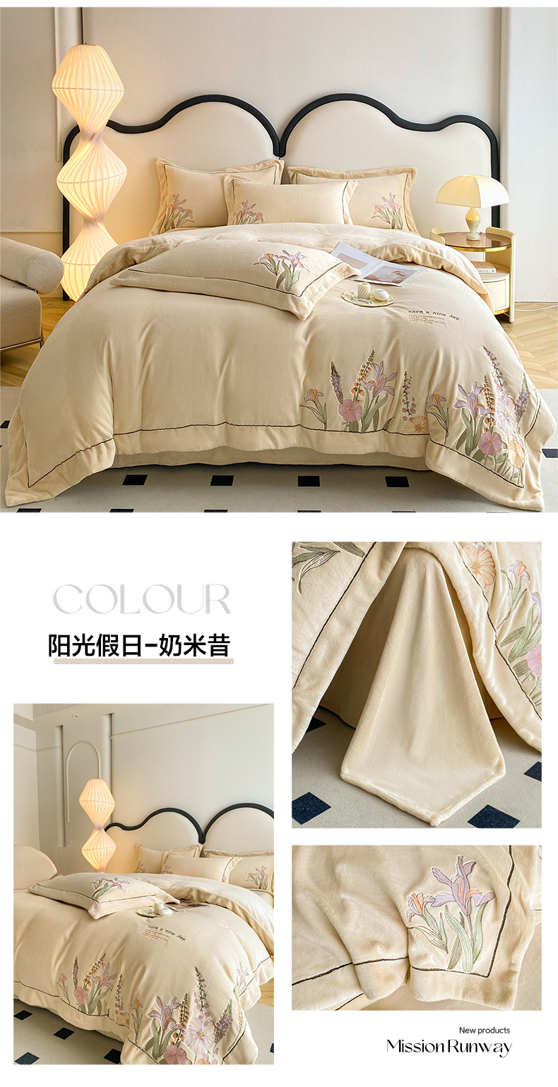 伊人居 2023新款250g高克重全消光牛奶绒刺绣四件套-阳光假日 阳光假日-奶米昔