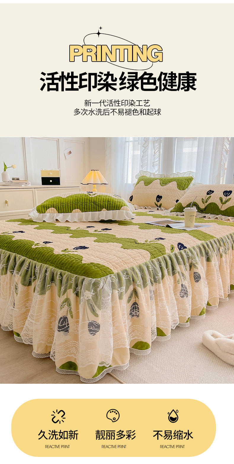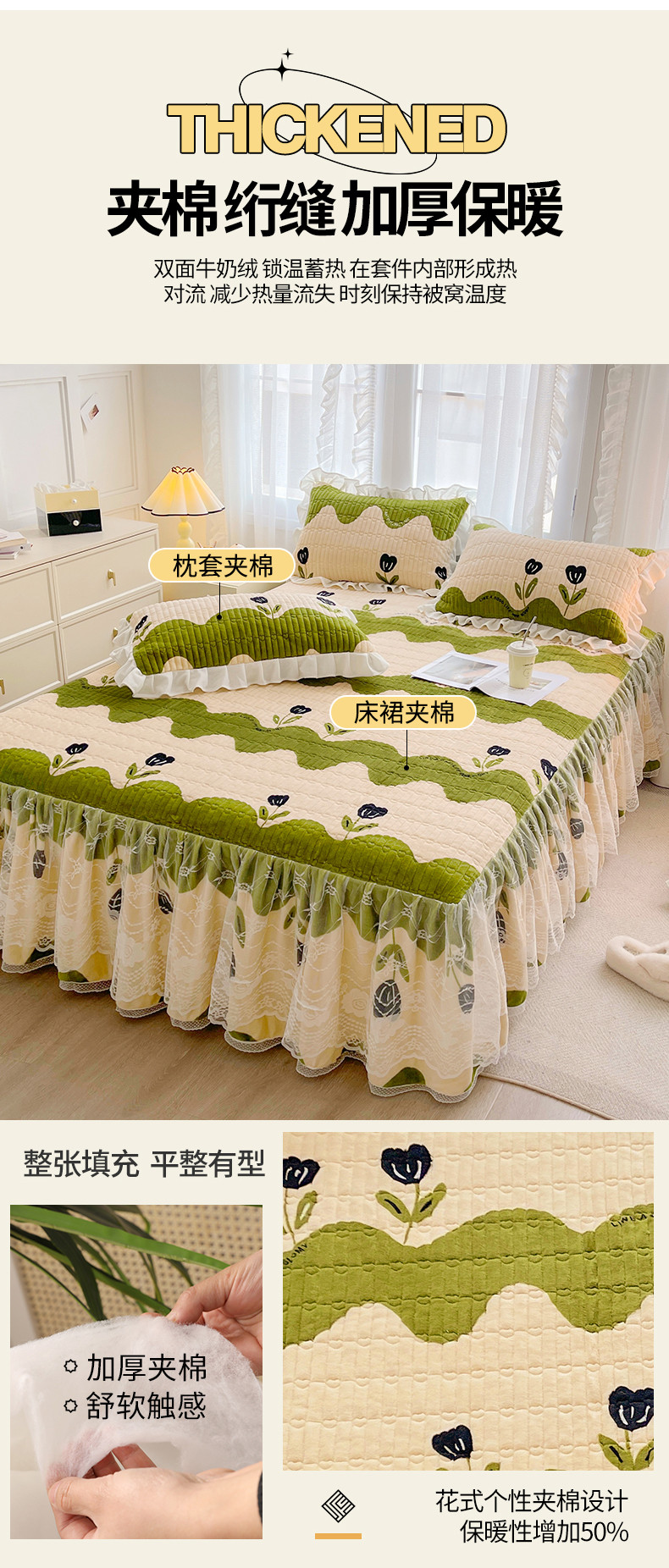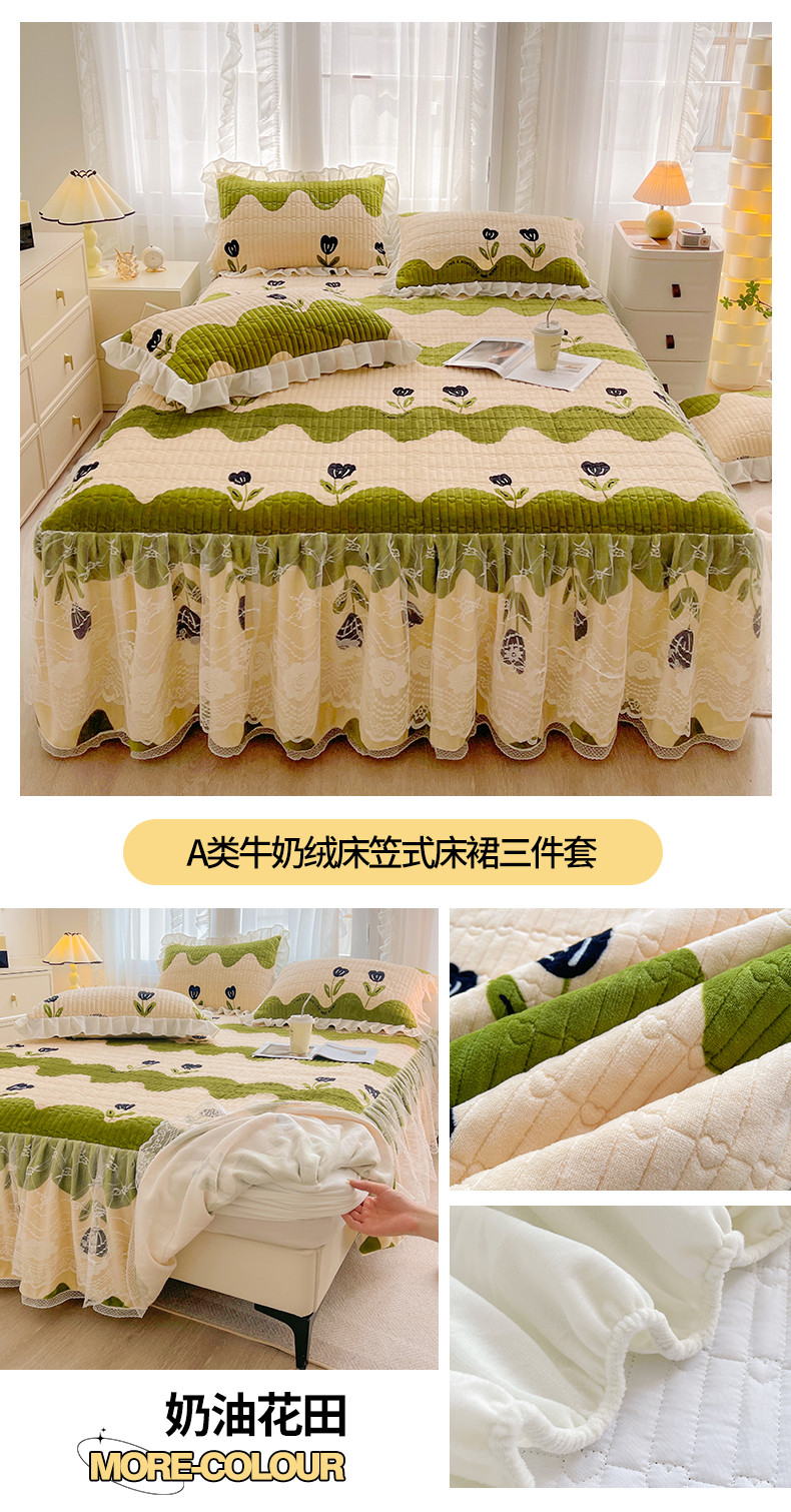 宜凡家纺 2023新款牛奶绒印花夹棉被套床笠式床裙三件套 奶油花田