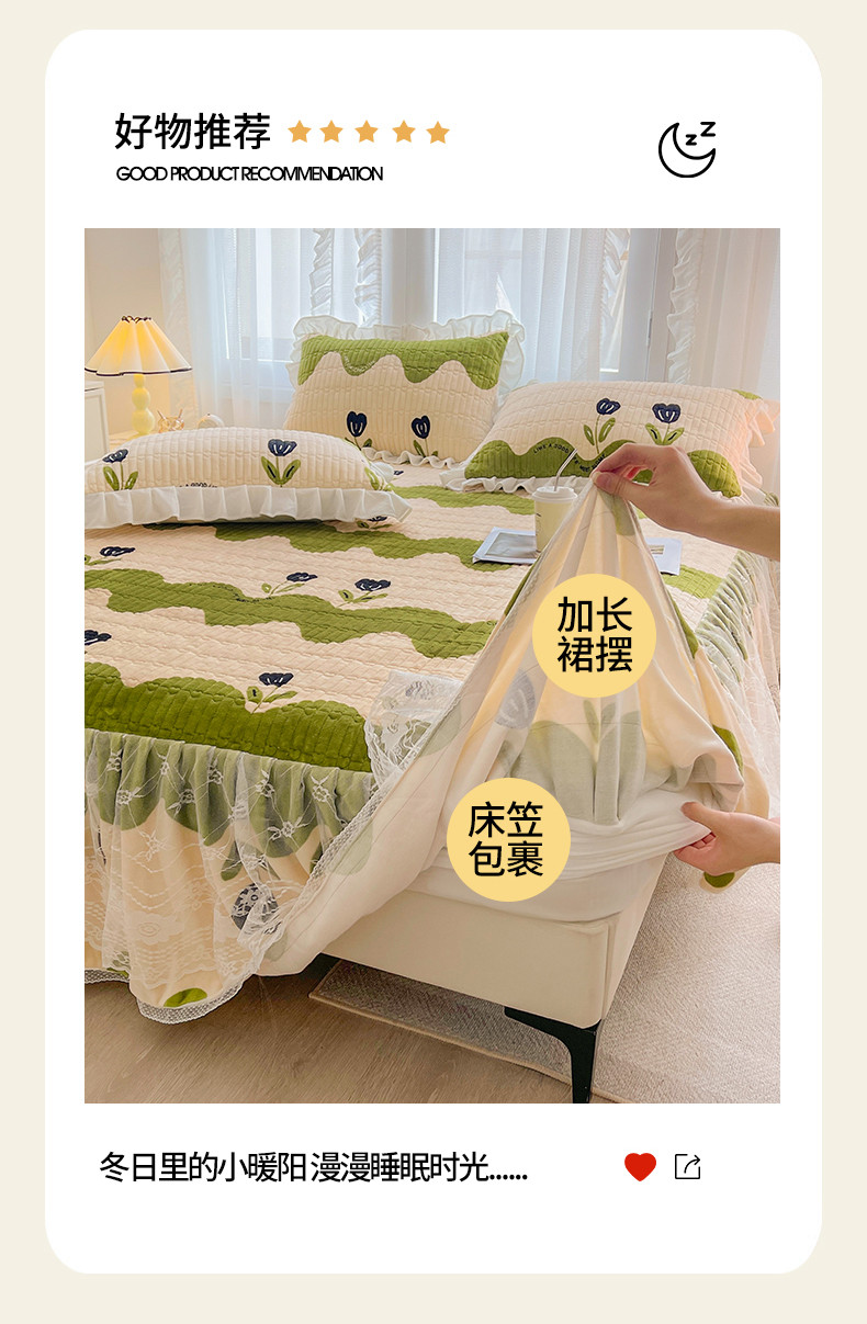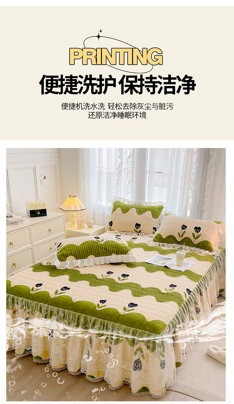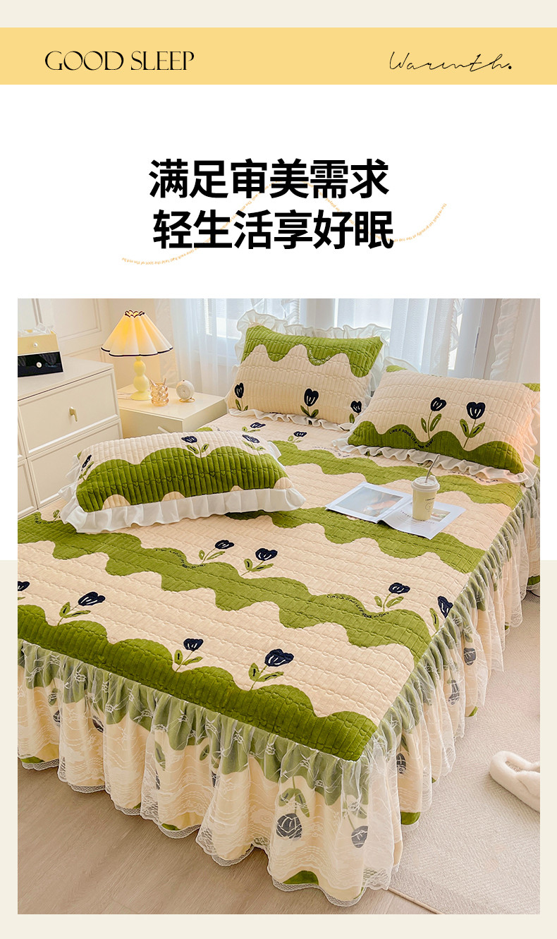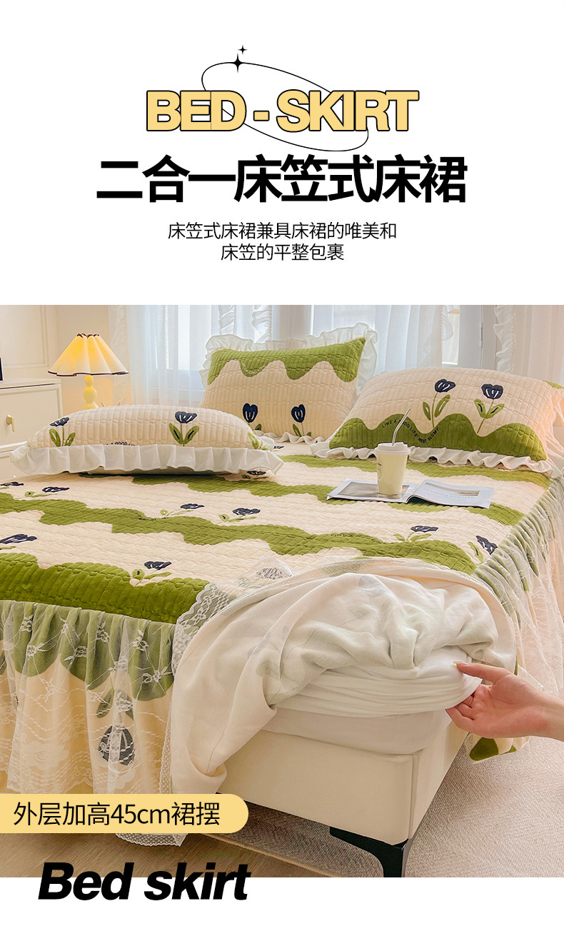 宜凡家纺 2023新款牛奶绒印花夹棉被套床笠式床裙三件套 奶油花田