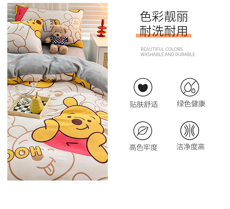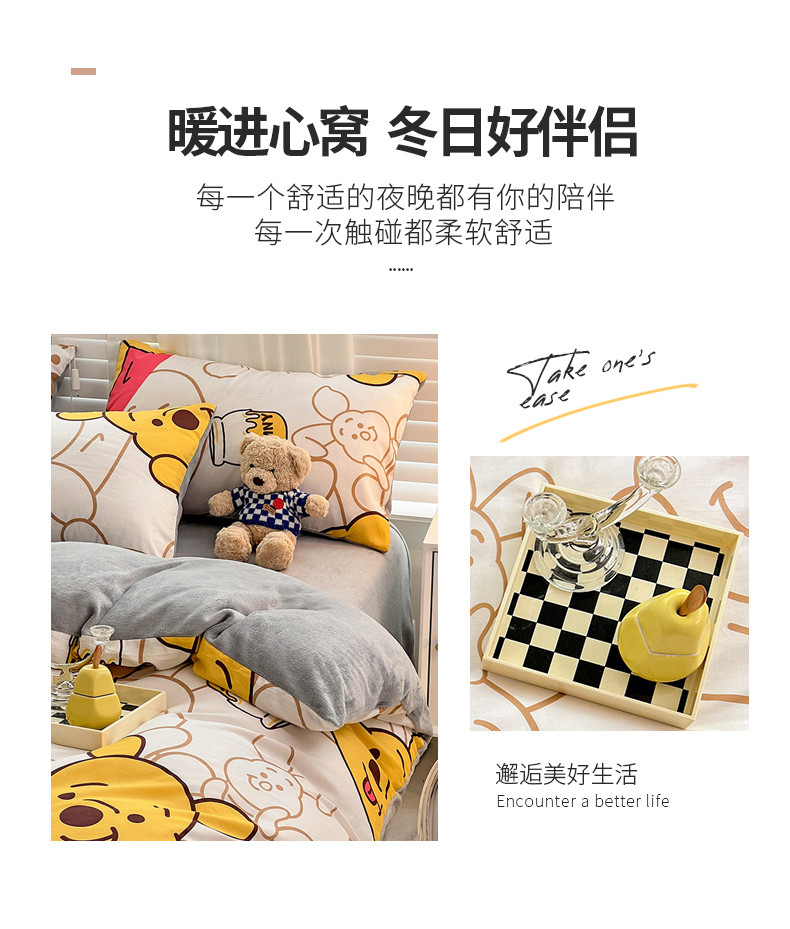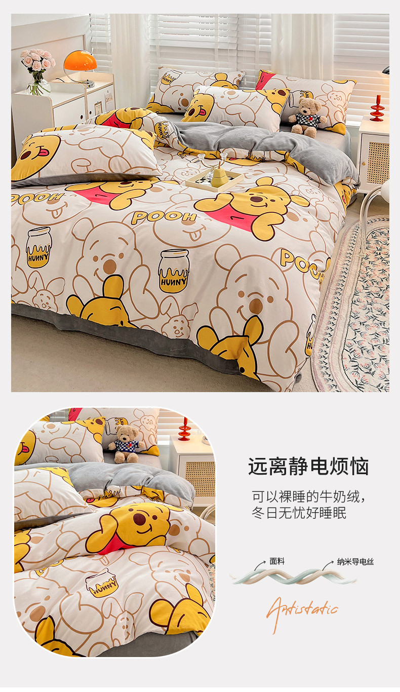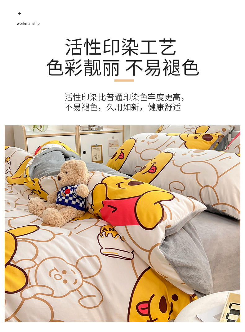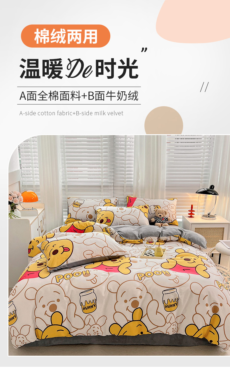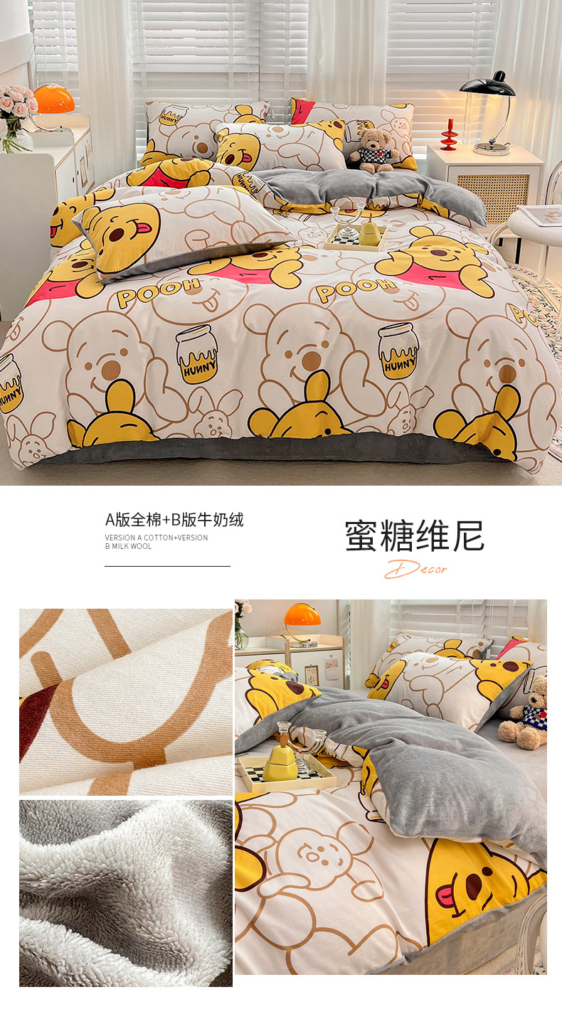 当前位置: 91家纺网 > 商品网购 > 床品套件 > 四件套 > 牛奶绒四件套 > 金丝鸟家纺 2023新款全棉印花加牛奶绒四件套 蜜糖维尼 a棉b牛奶绒