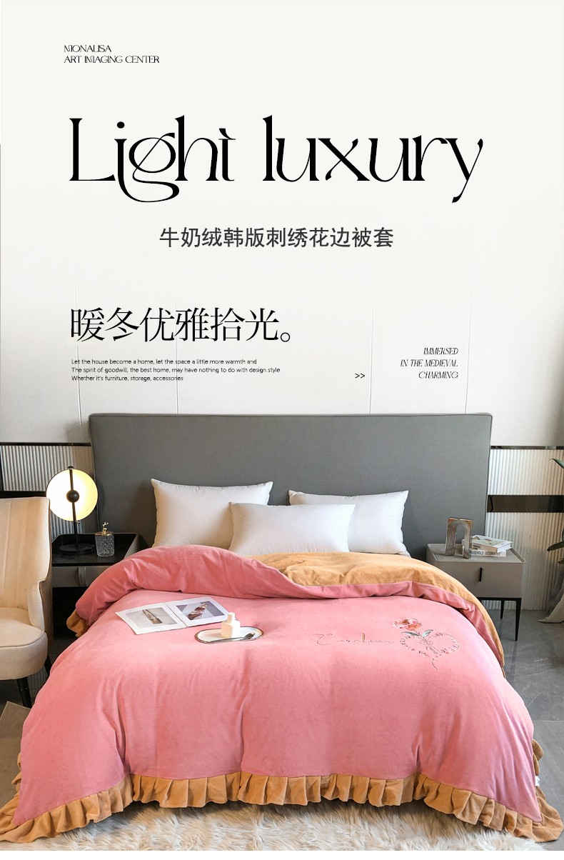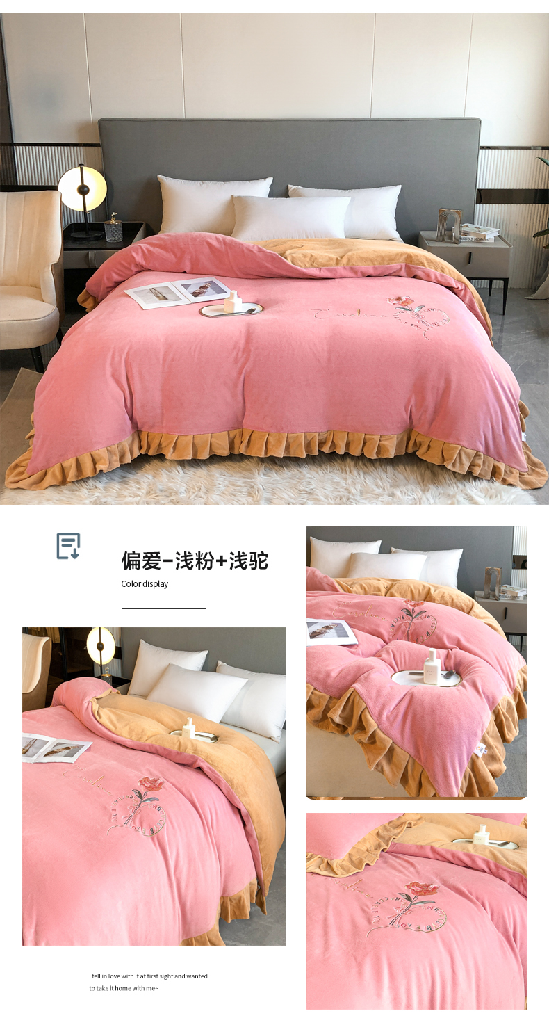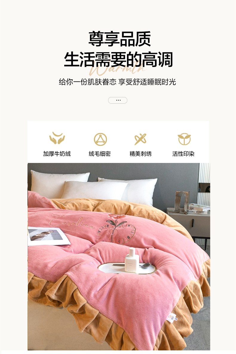 商品名称:7v 2023新款牛奶绒韩版花边刺绣被套法兰绒宝宝绒兔绒单被套 偏爱-浅粉+浅驼
