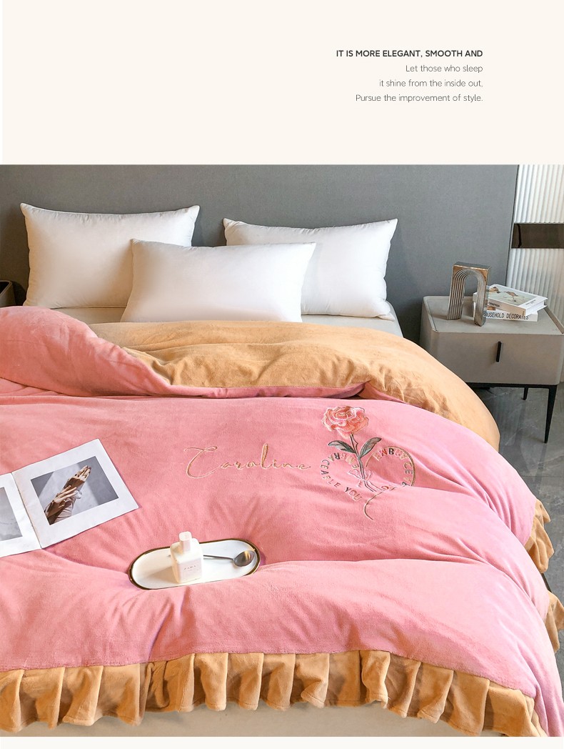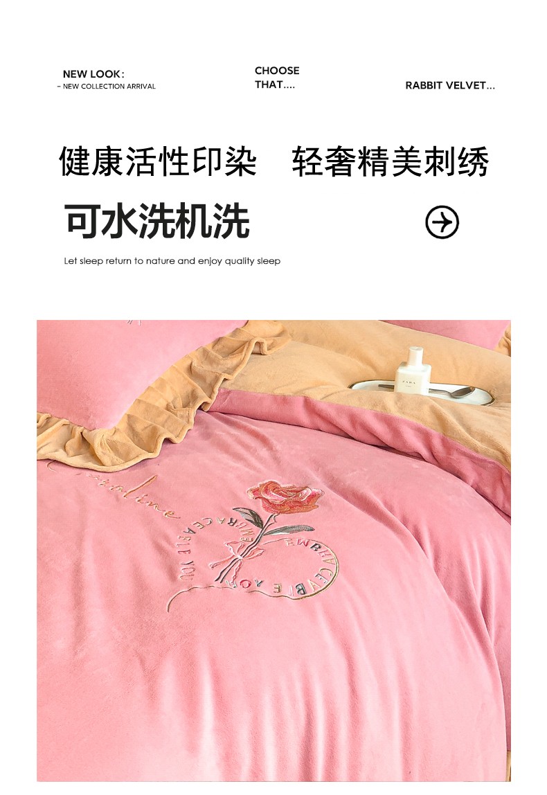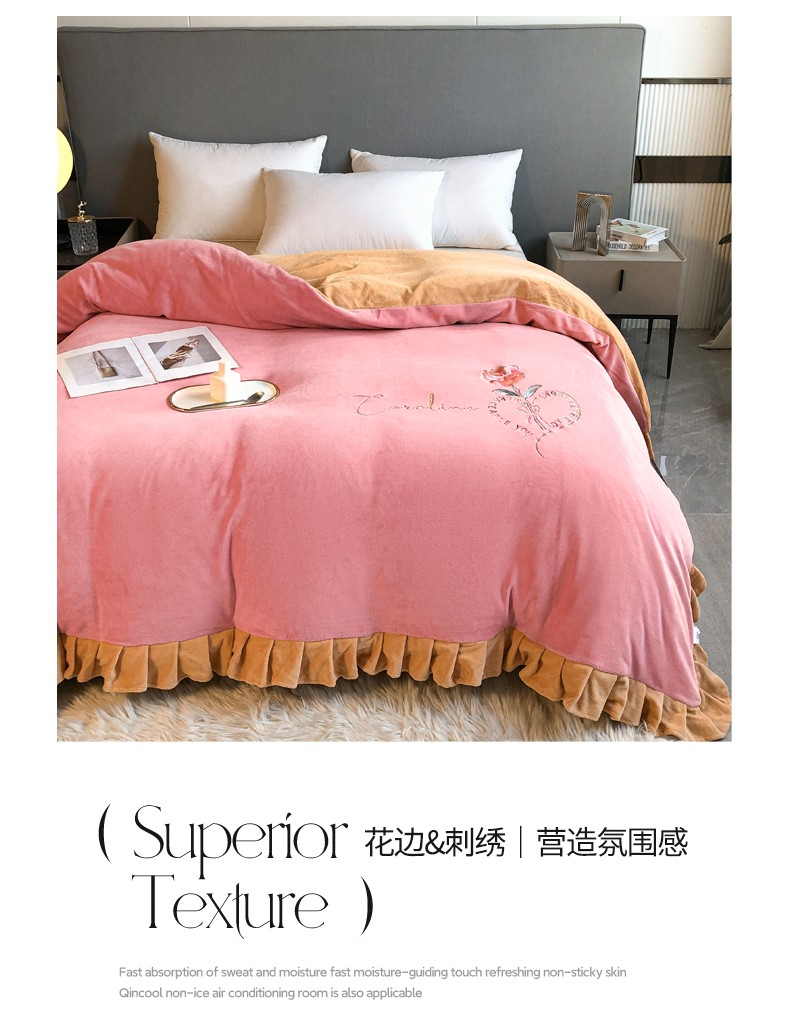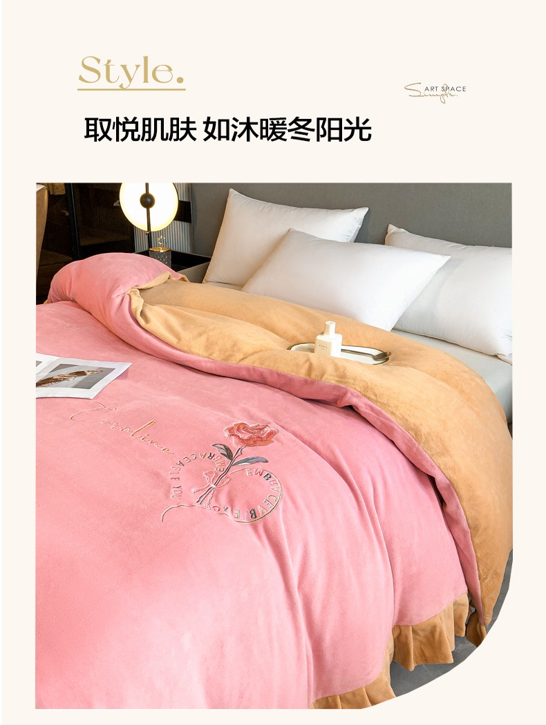 商品名称:7v 2023新款牛奶绒韩版花边刺绣被套法兰绒宝宝绒兔绒单被套 偏爱-浅粉+浅驼