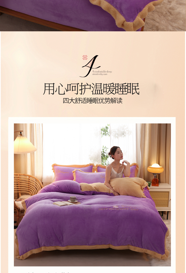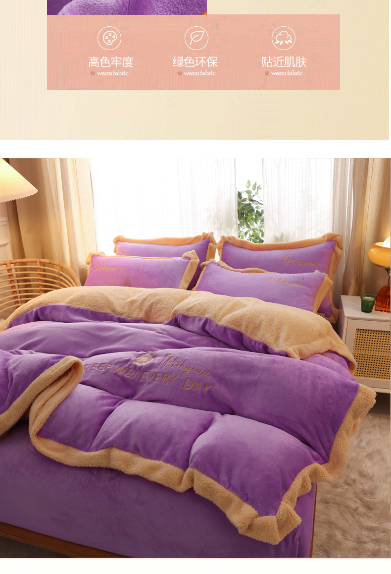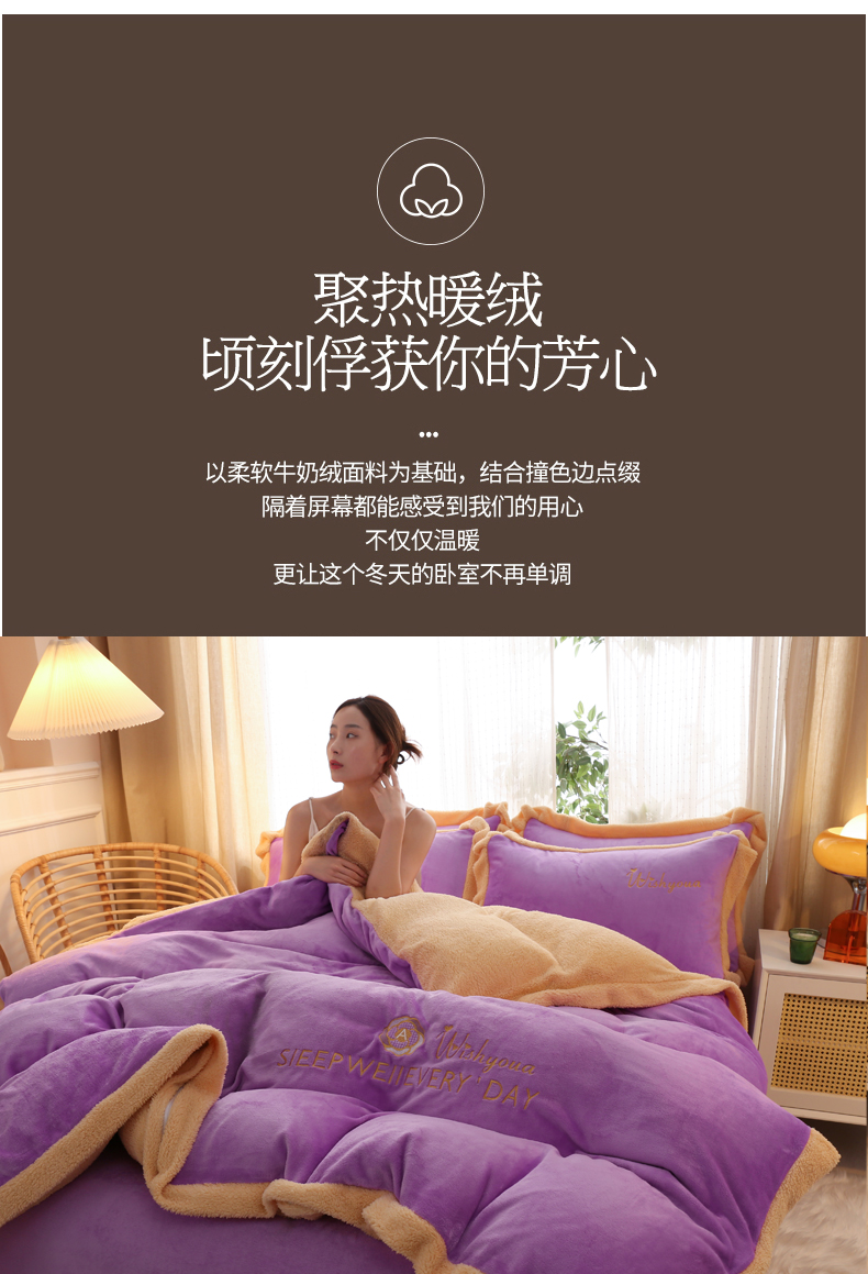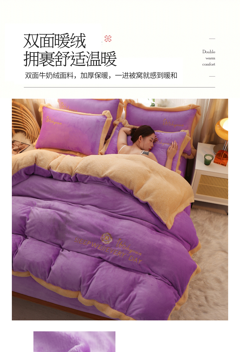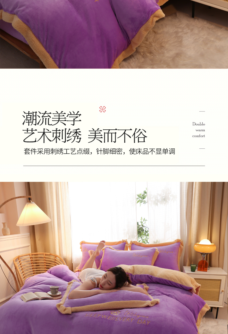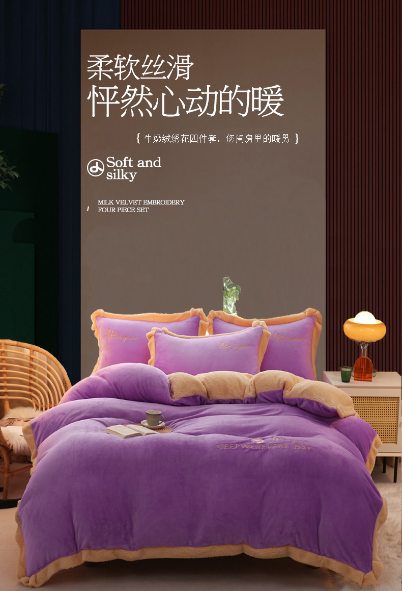 当前位置: 91家纺网 > 商品网购 > 床品套件 > 四件套 > 牛奶绒四件套 > 啊雅家居 2026新款绣花牛奶绒加羊羔绒四件套 紫色加米黄