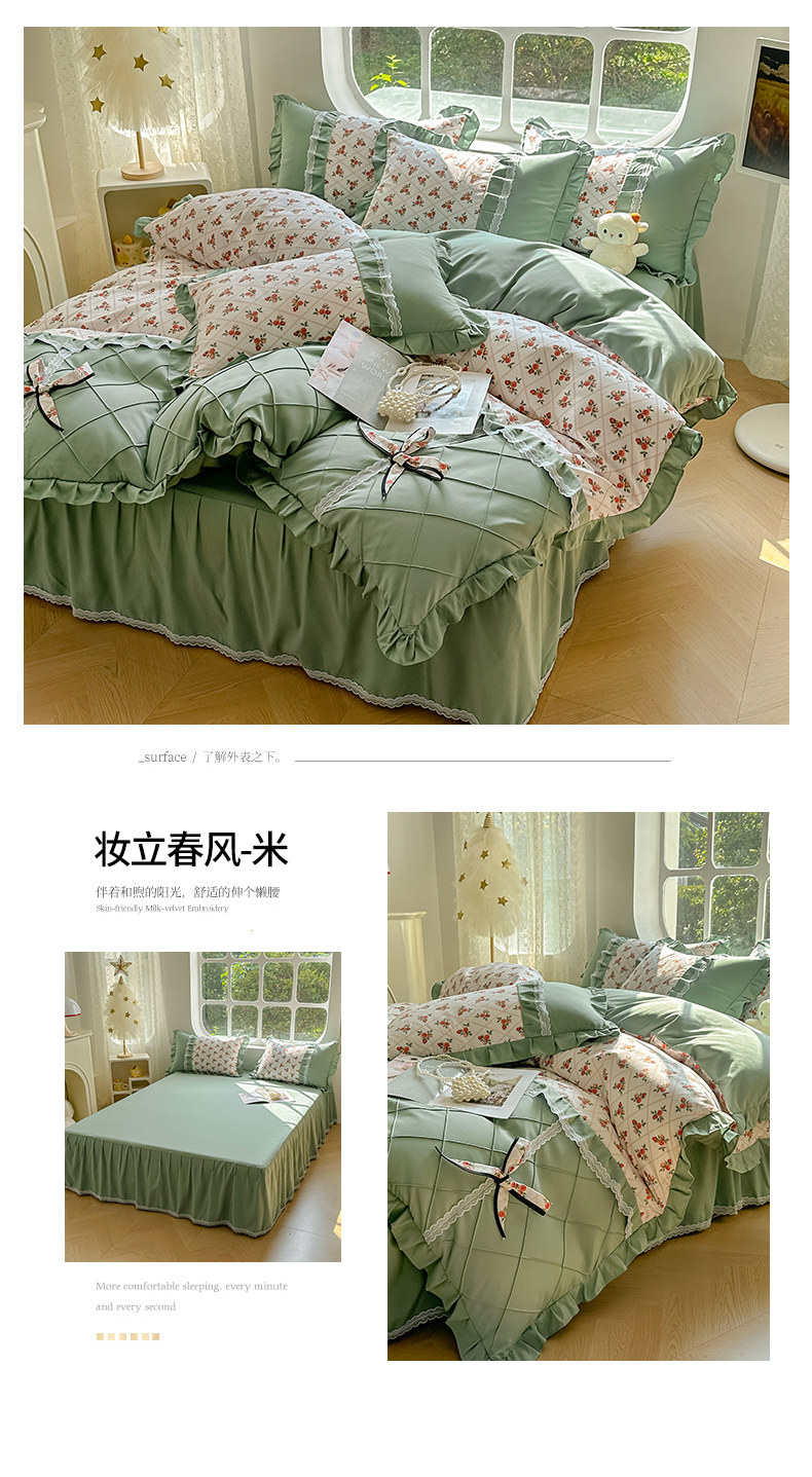 金米诺 新款韩版花边水洗棉泡泡纱四件套公主条四件套 褶皱-浅绿,褶皱-浅绿