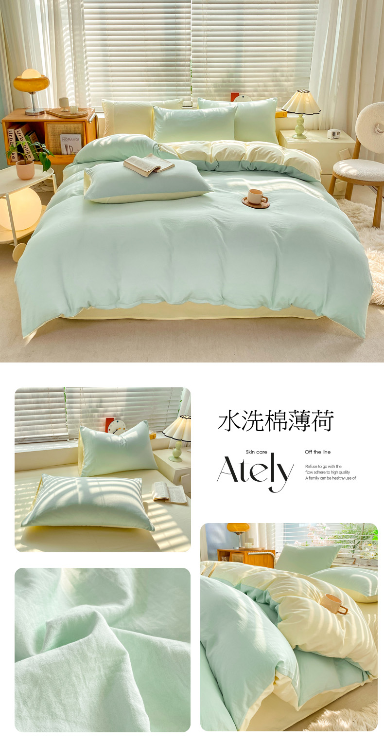 当前位置: 91家纺网 > 商品网购 > 床品套件 > 四件套 > 水洗棉四件套 > 雨帆家纺 2024新款简约亲肤水洗棉双拼四件套 水洗棉薄荷