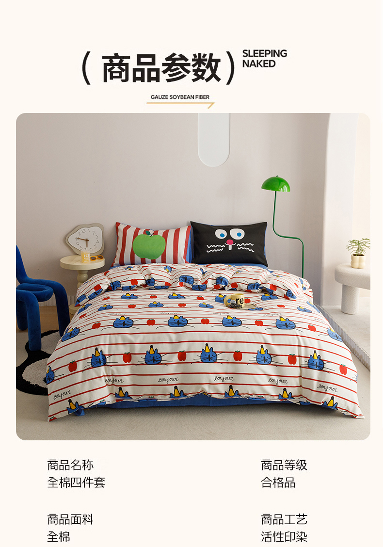 商品名称:珺柔家纺 2024年款13070全棉数码印花四件套 开心猫