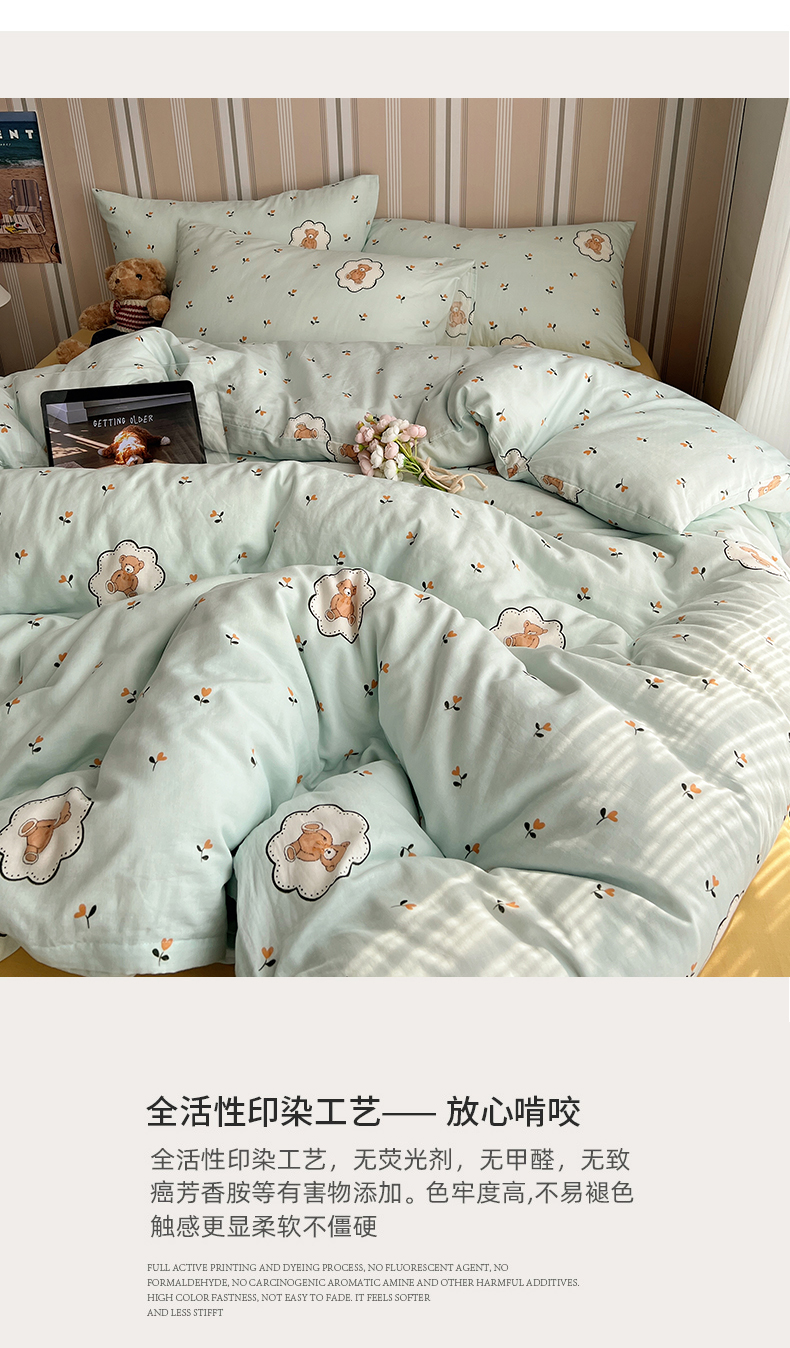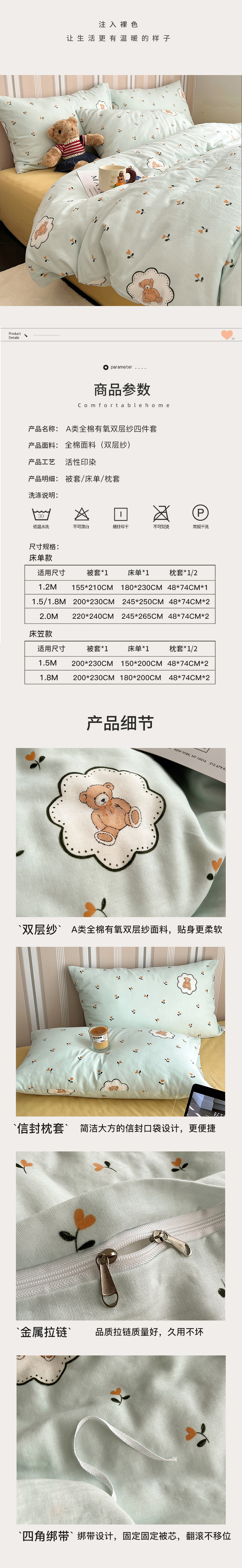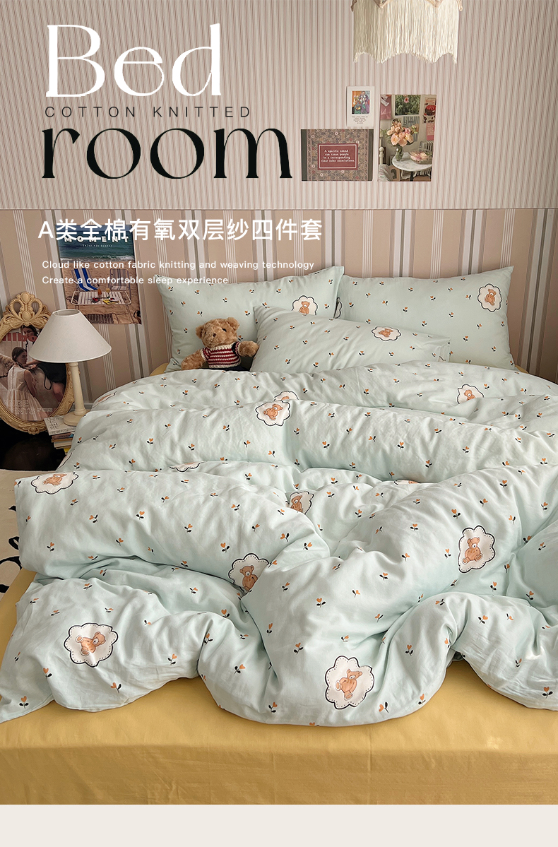 商品名称:卧趣2024新款A类全棉有氧双层纱四件套 甜美似梦蓝