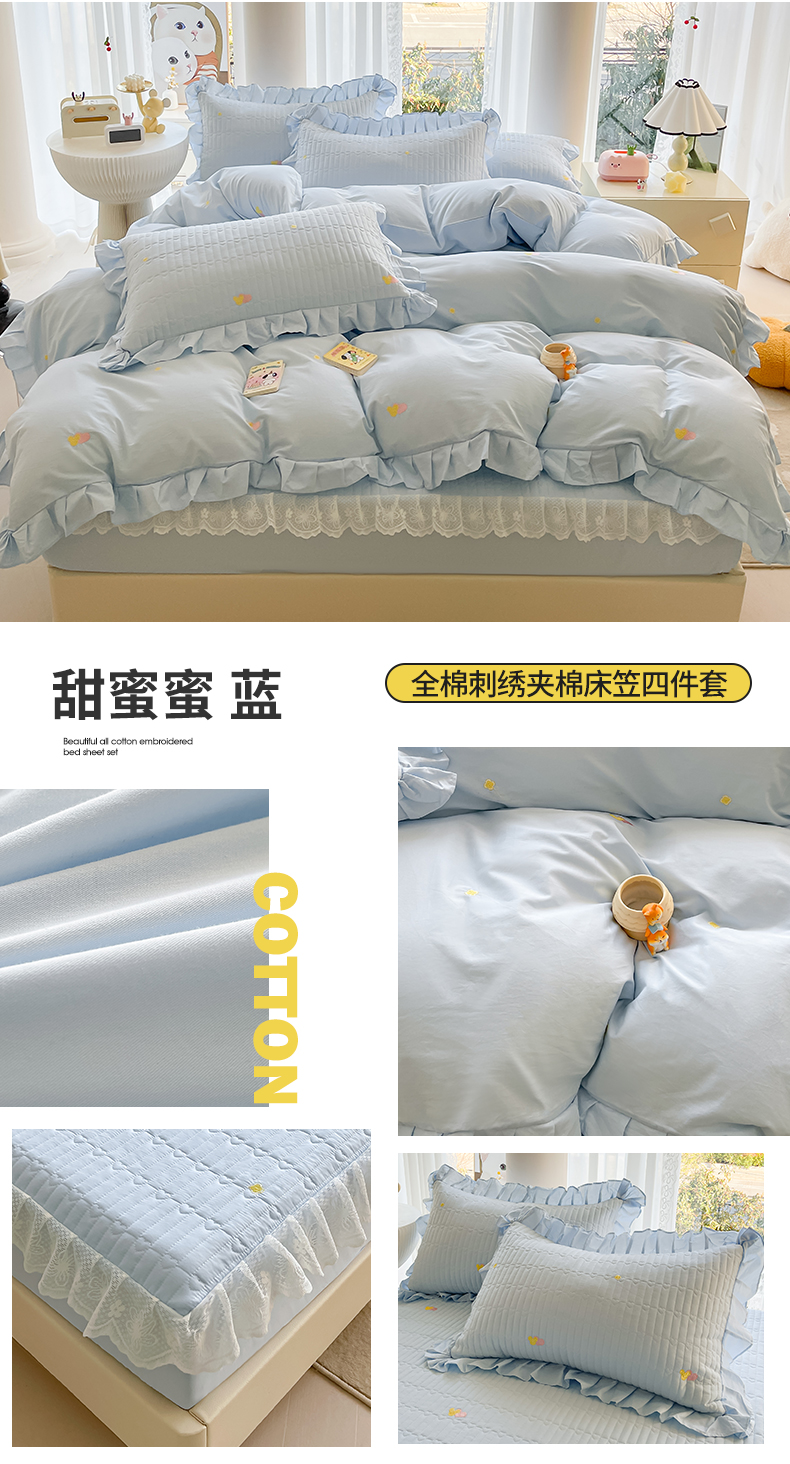 宜凡家纺 2024新款全棉夹棉绣花花边系列床笠四件套 甜蜜蜜 蓝
