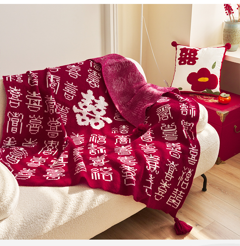 苏艺针织盖毯 2024新款针织中式风高端婚礼喜字毛毯沙发盖毯 百喜毯(繁)
