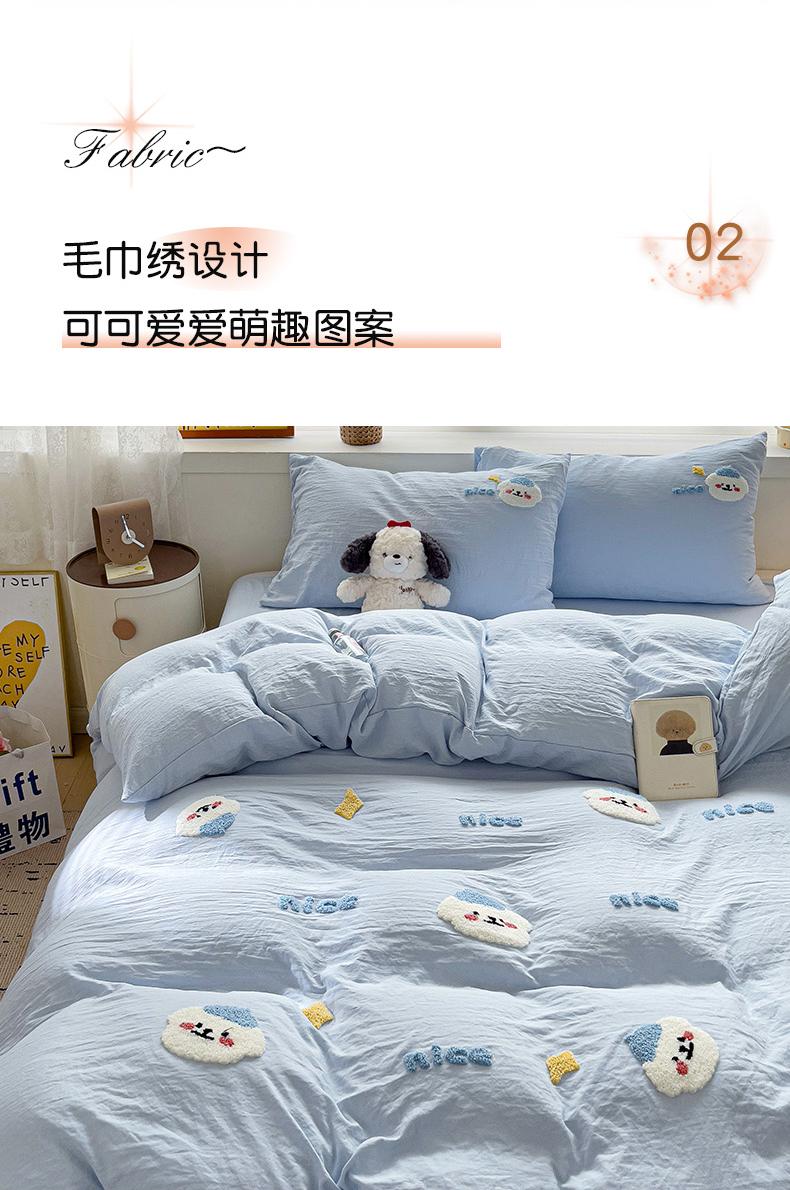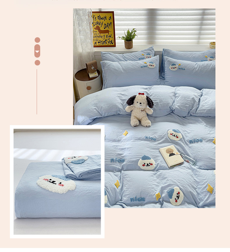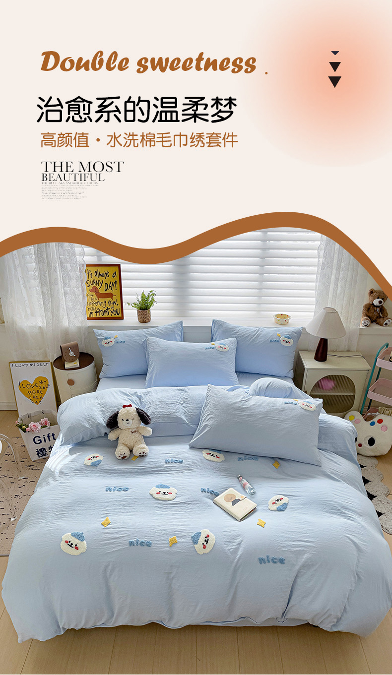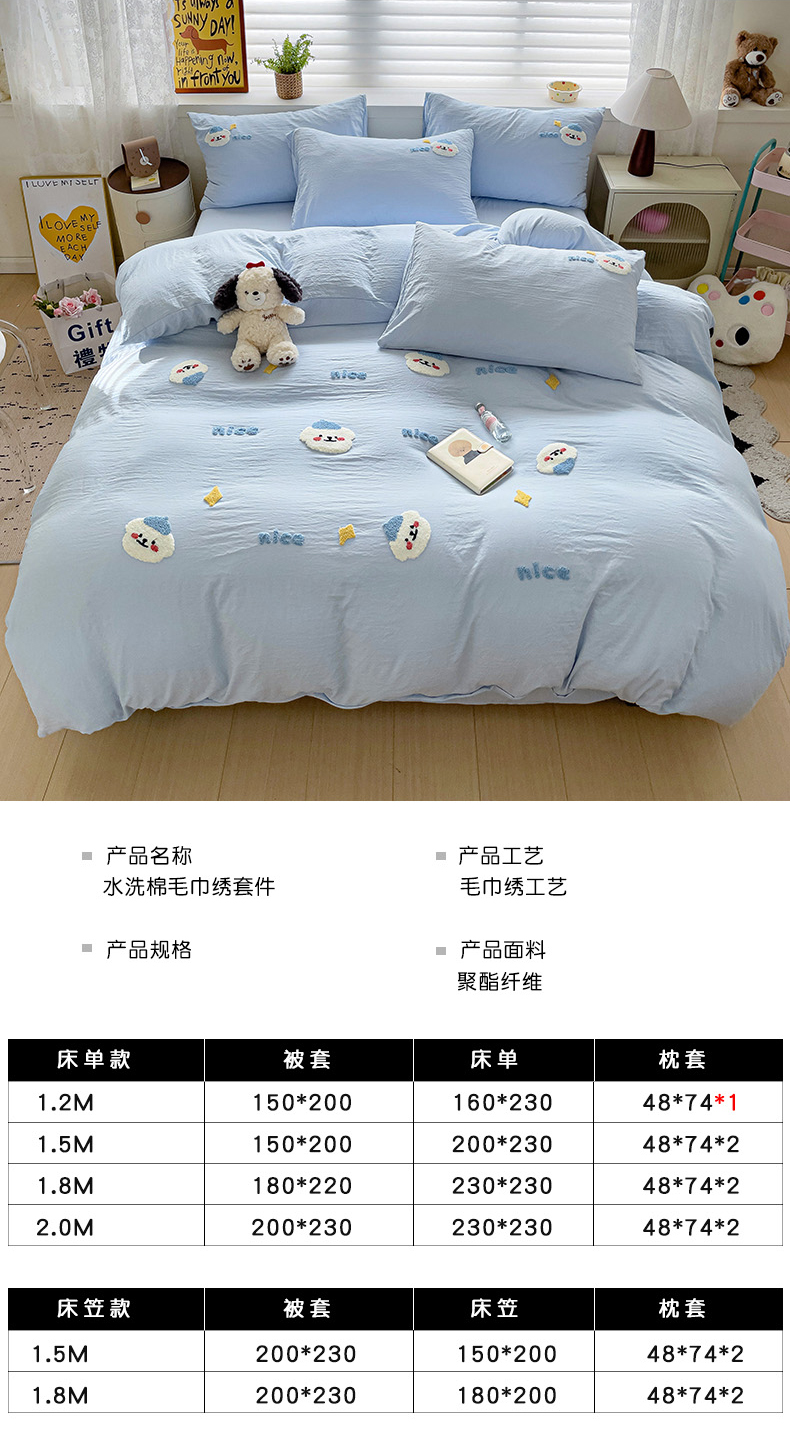 当前位置: 91家纺网 > 商品网购 > 床品套件 > 四件套 > 毛巾绣四件套 > 韩巢家纺 2024爆款四季通用超柔水洗棉毛巾绣四件套-哈哈狗系列(提供精美卖家秀) 哈哈狗浅蓝