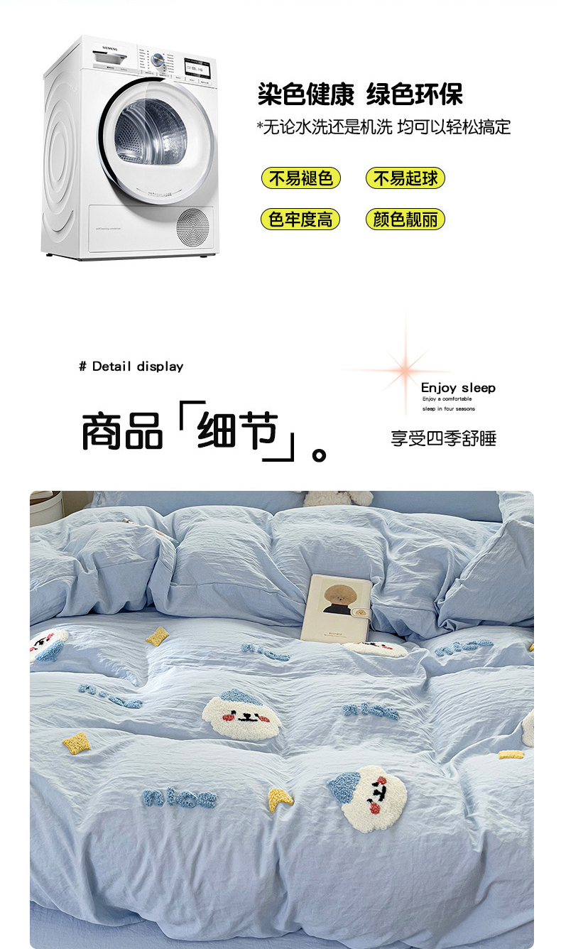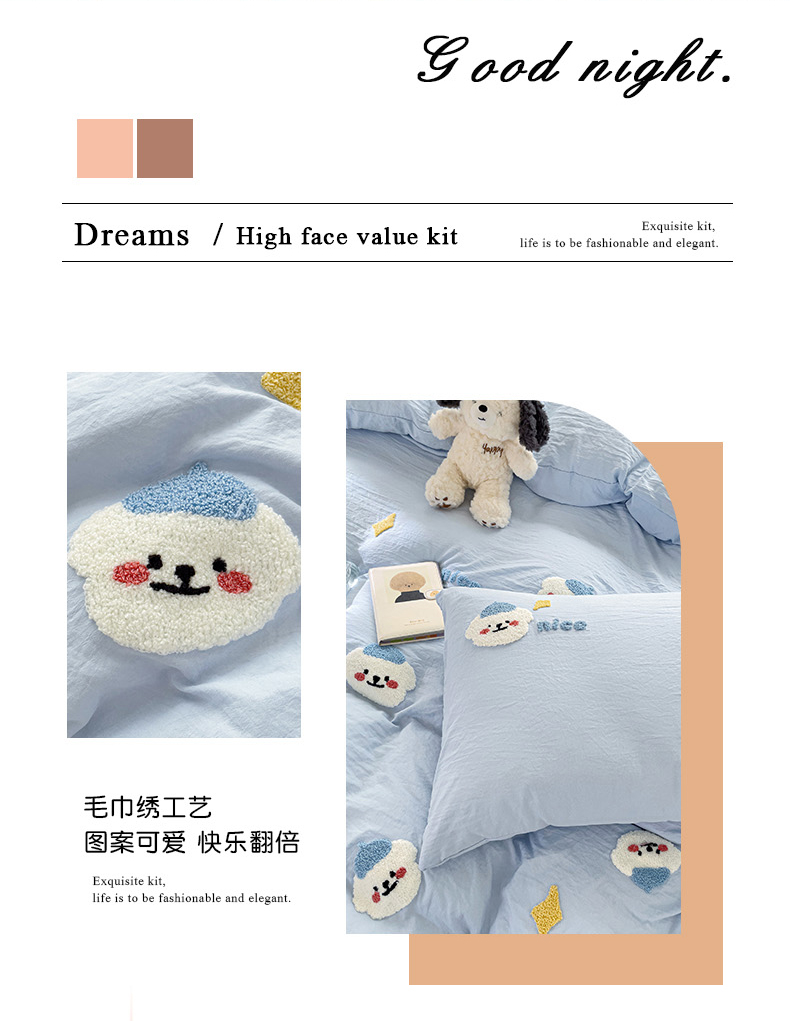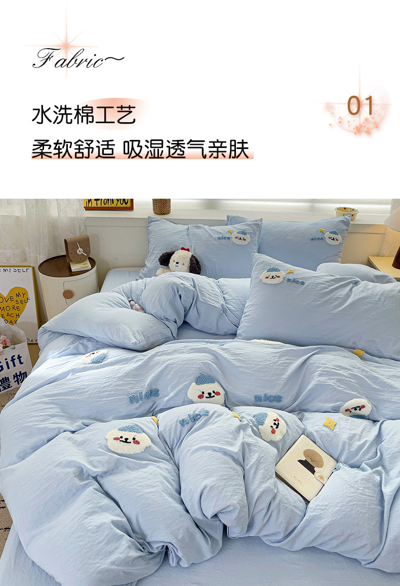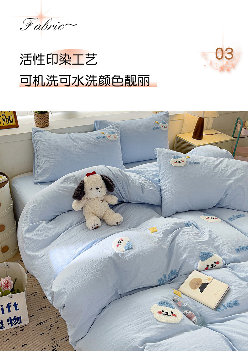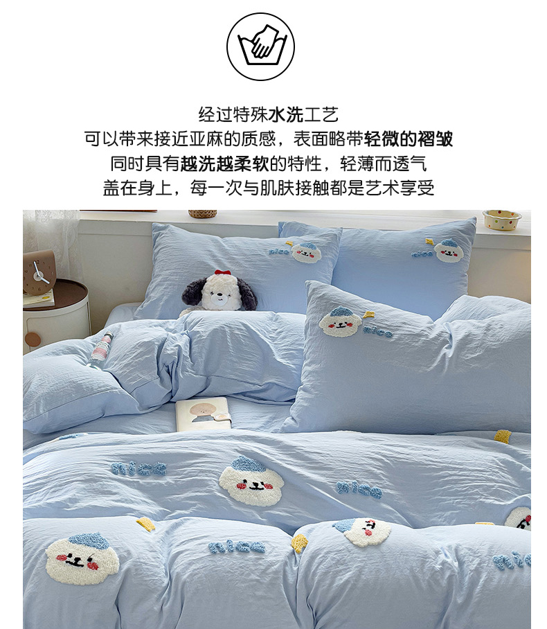 当前位置: 91家纺网 > 商品网购 > 床品套件 > 四件套 > 毛巾绣四件套 > 韩巢家纺 2024爆款四季通用超柔水洗棉毛巾绣四件套-哈哈狗系列(提供精美卖家秀) 哈哈狗浅蓝