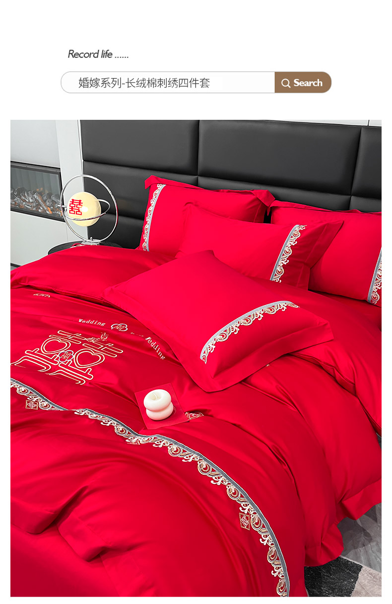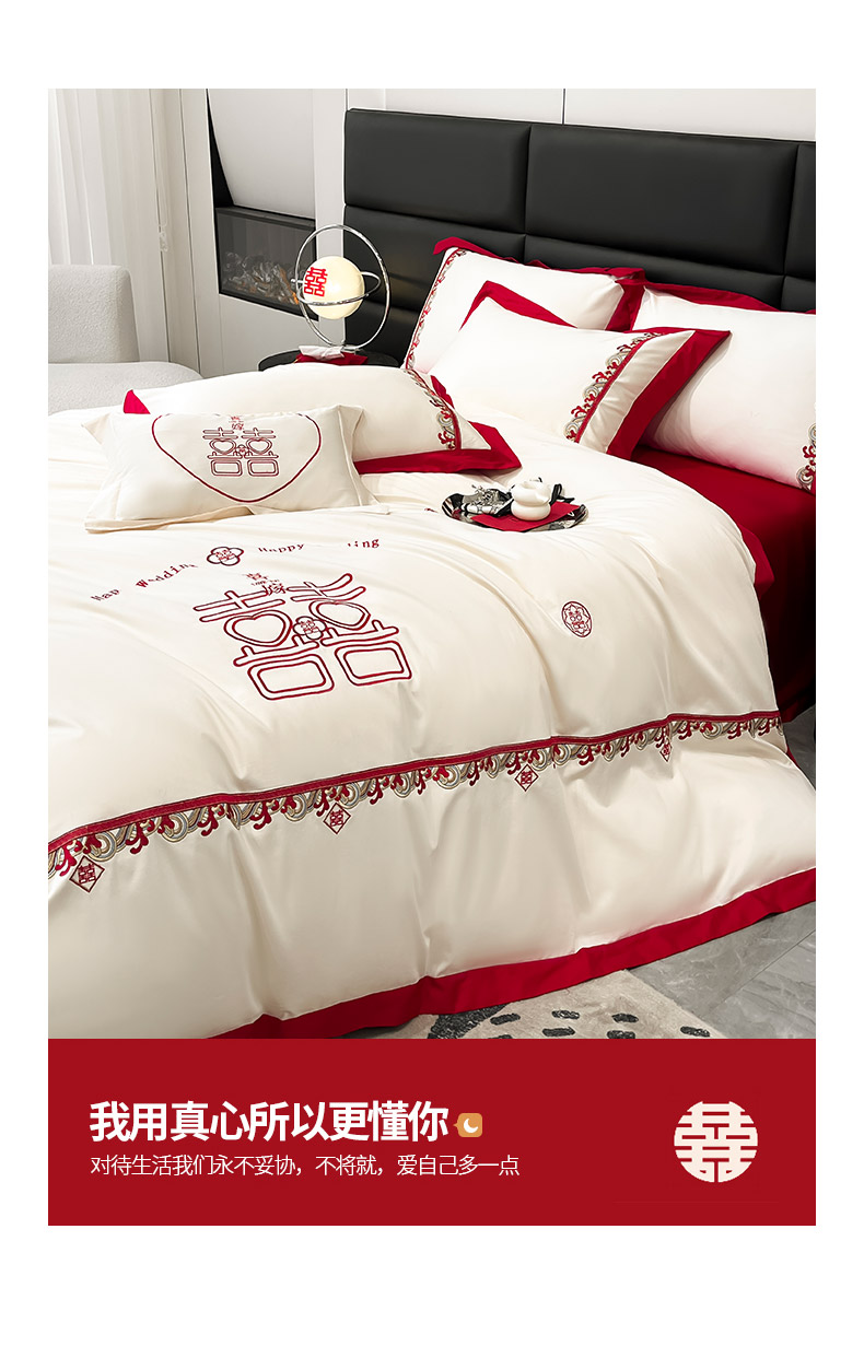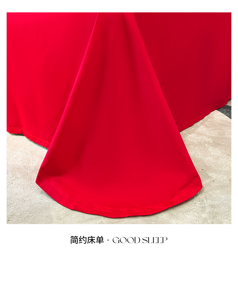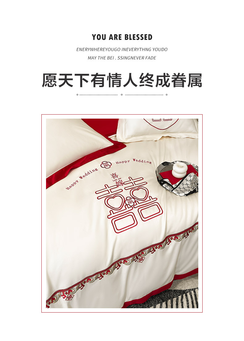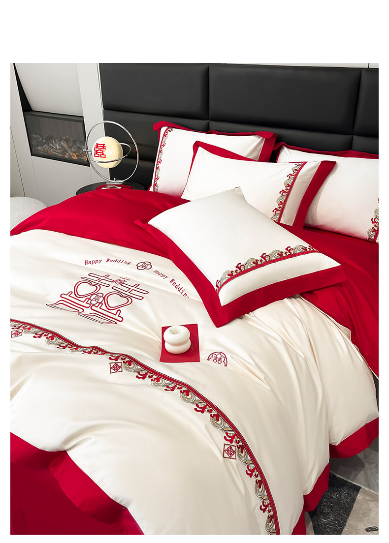 商品名称: 婚庆100支贡缎长绒棉四件套全棉纯棉刺绣结婚床单被套红色纯色床笠款床上用品 欢喜余生-新妍玉