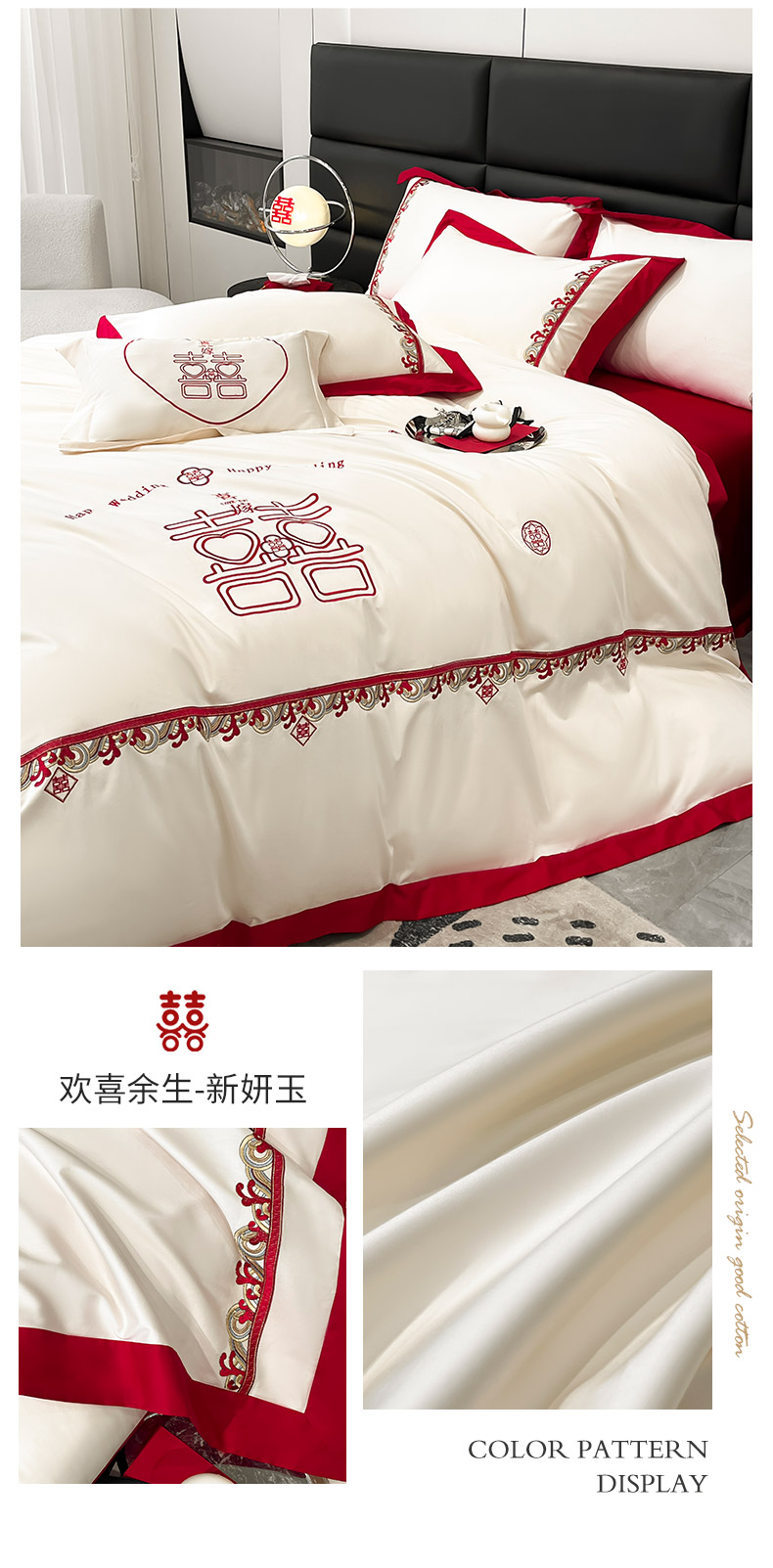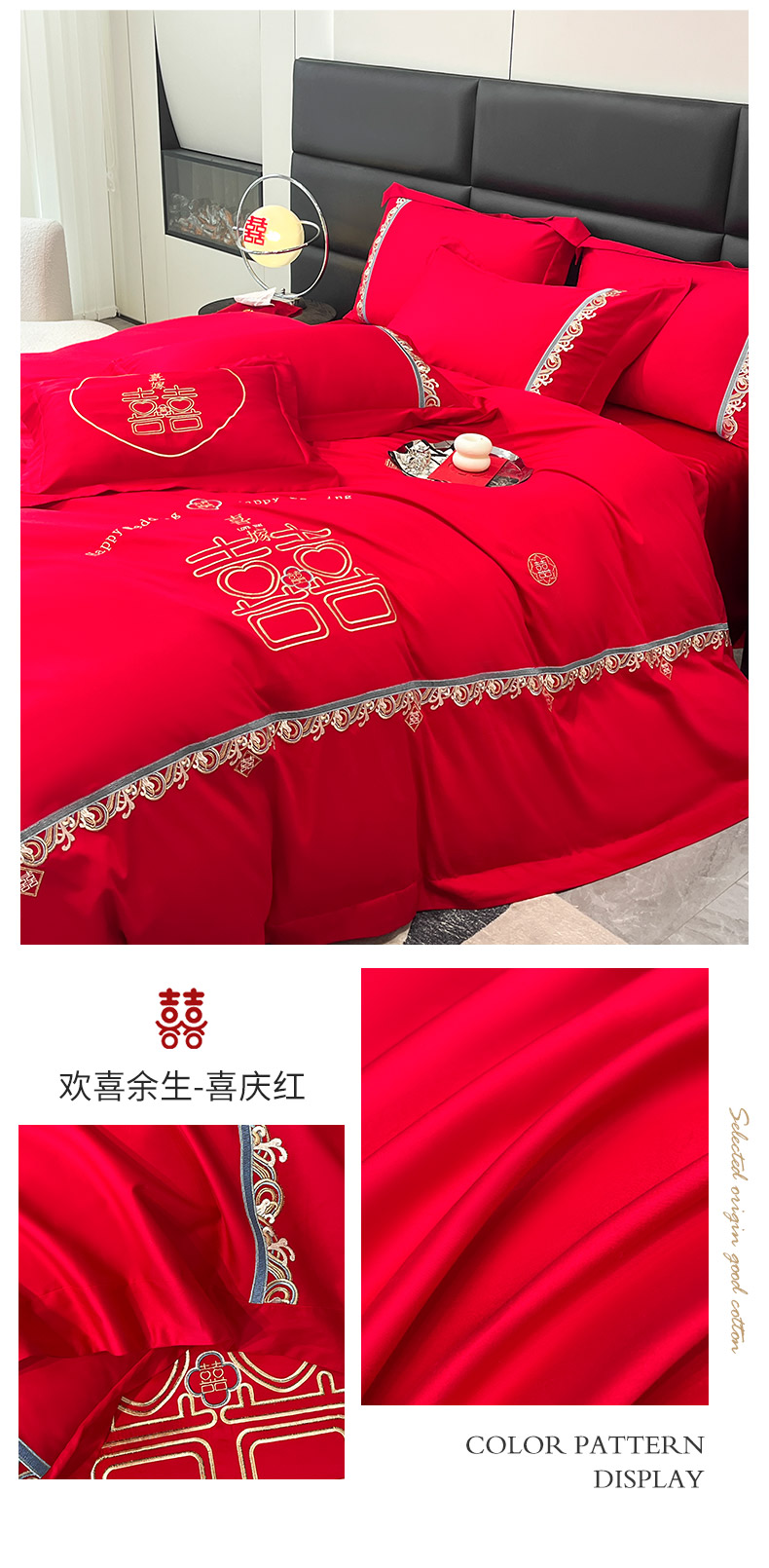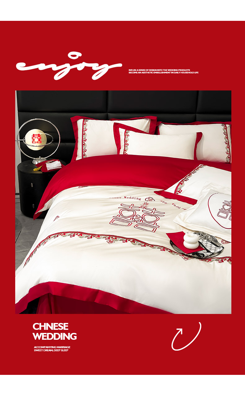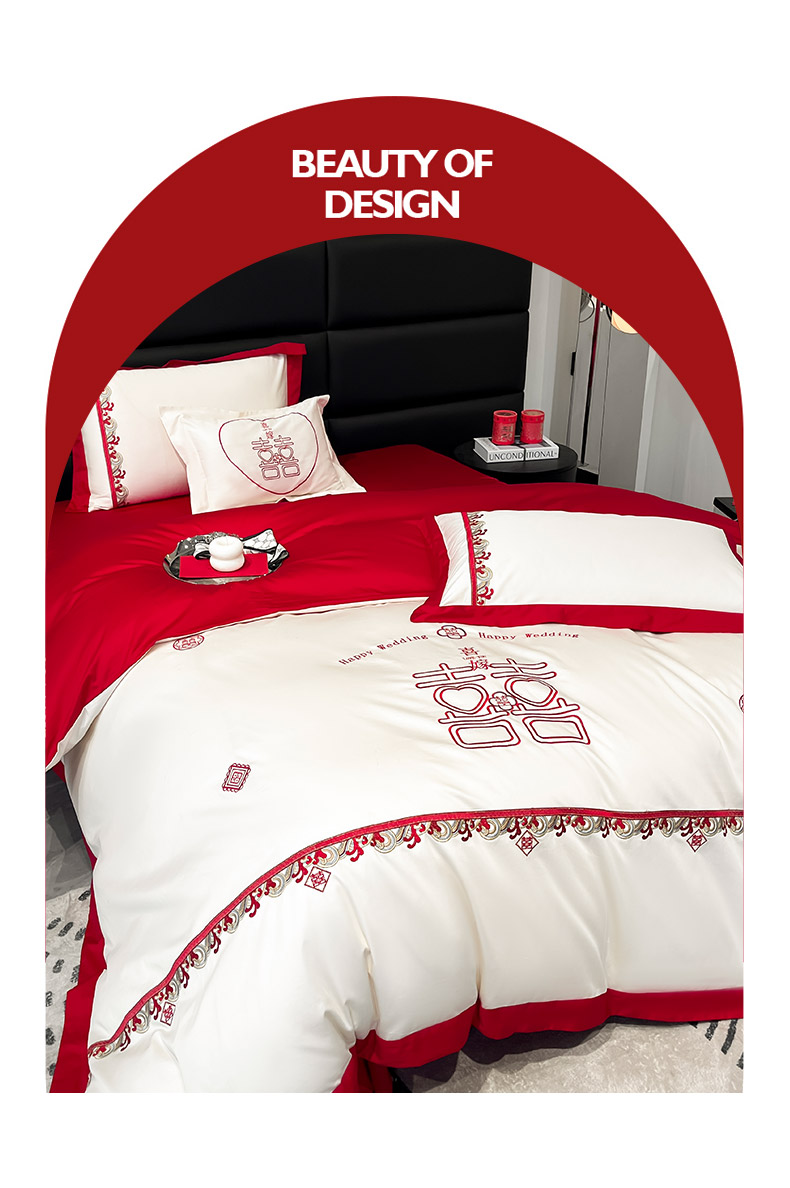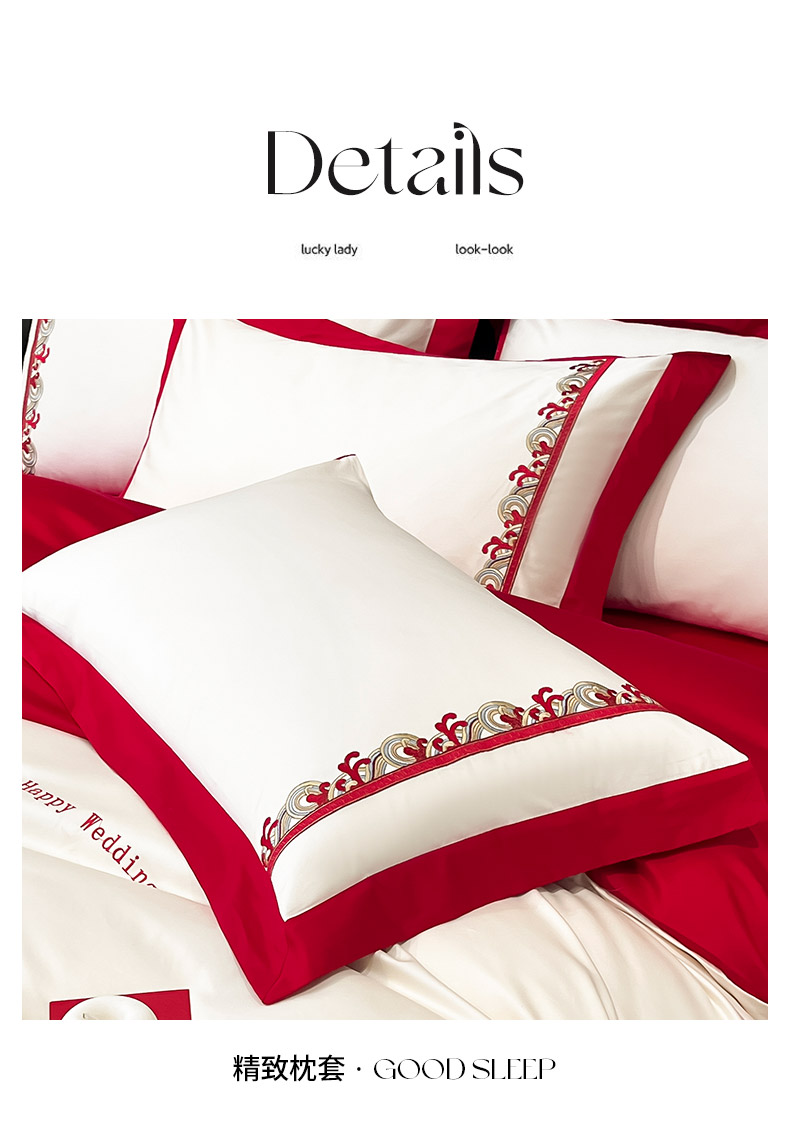 商品名称: 婚庆100支贡缎长绒棉四件套全棉纯棉刺绣结婚床单被套红色纯色床笠款床上用品 欢喜余生-新妍玉