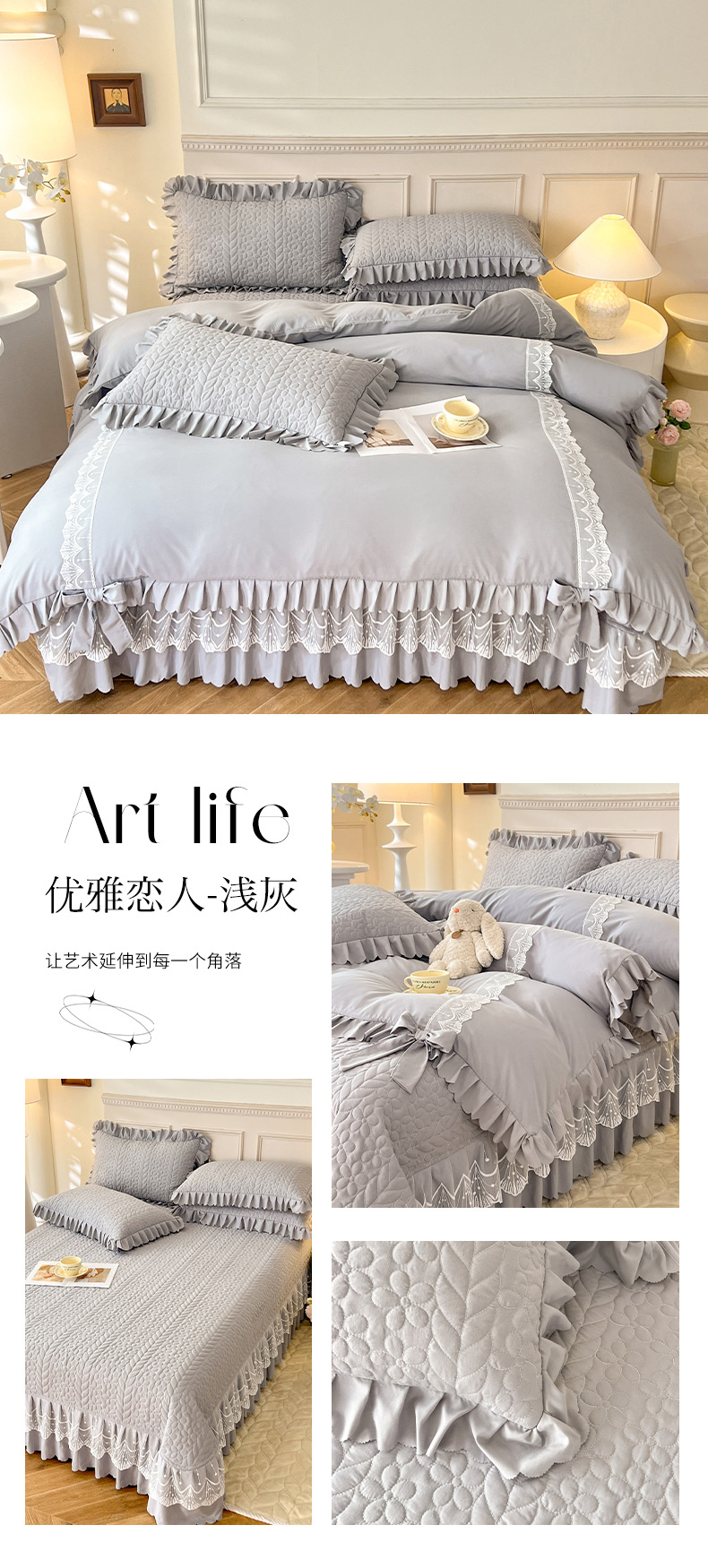 商品名称:唐人居 2025新款韩式花边蝴蝶结床盖四件套-优雅恋人 优雅恋人-浅灰