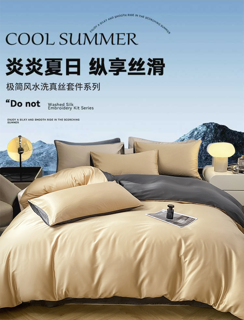 繁花 2024新款极简风水洗真丝单被套系列-风格一 奶驼深灰