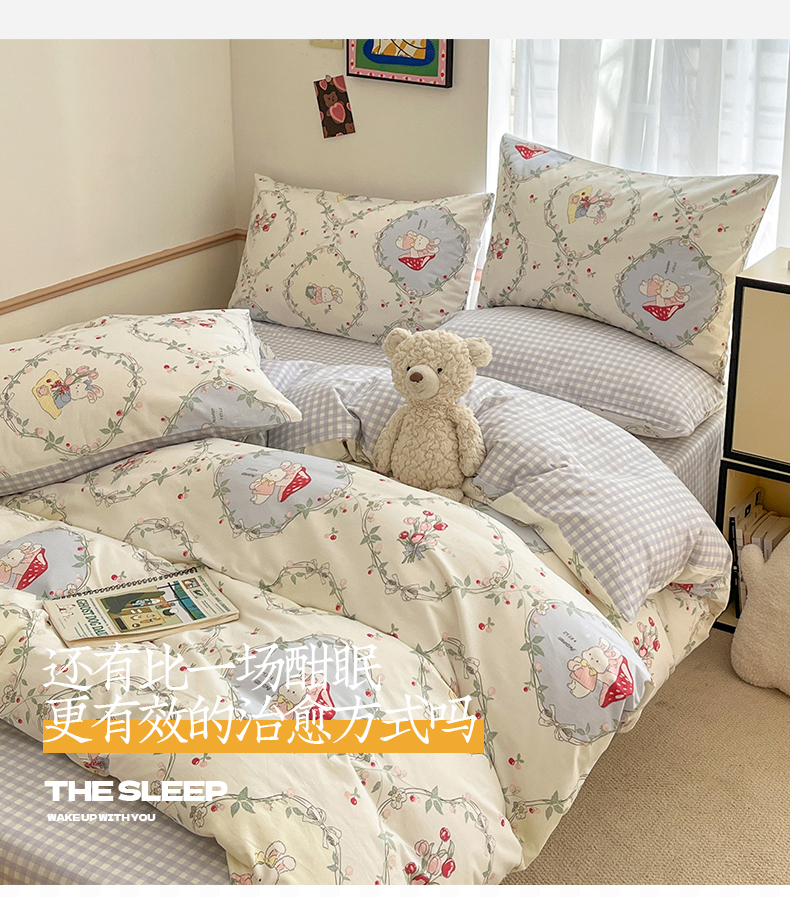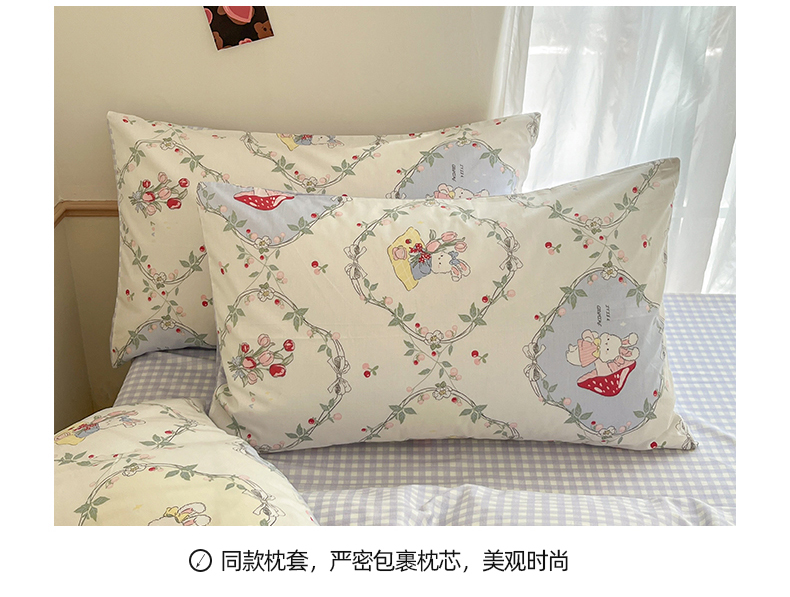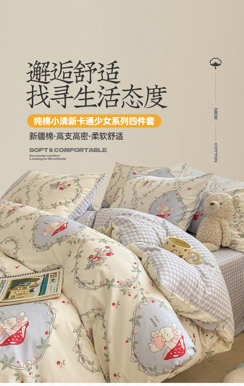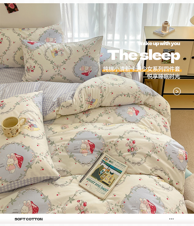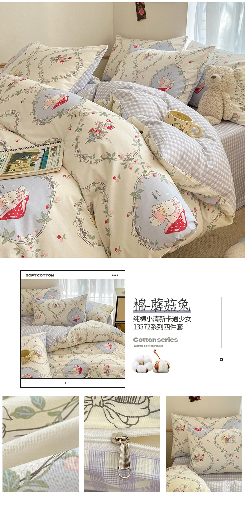 商品名称:桃子家居 2024新款纯棉小清新卡通少女13372系列四件套 棉-蘑菇兔