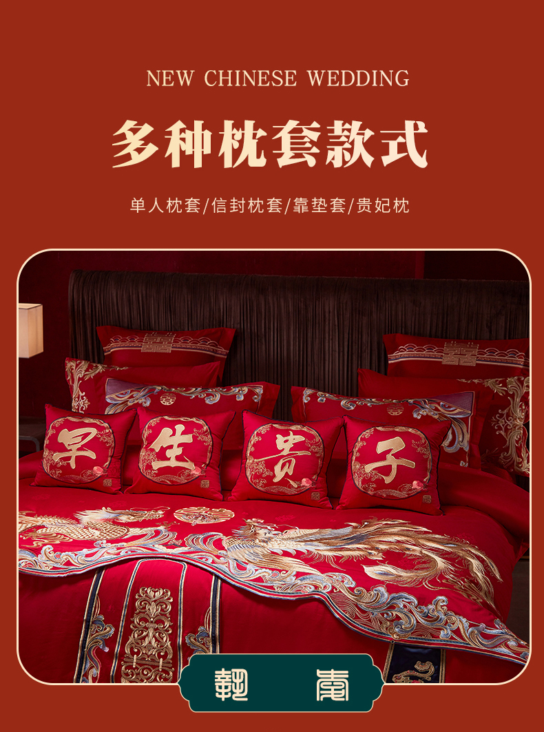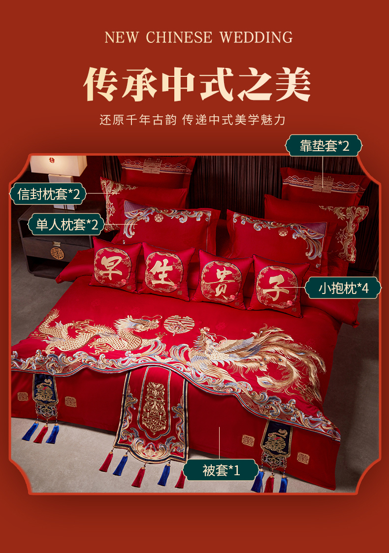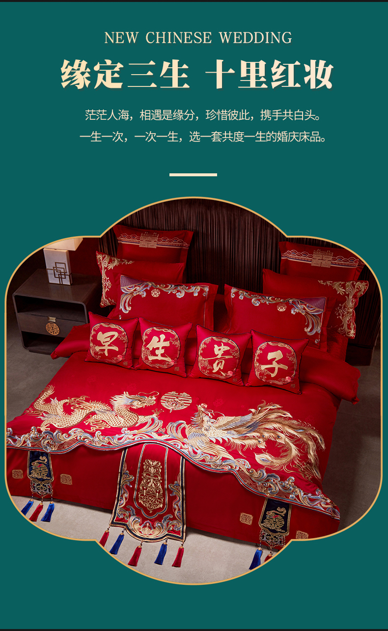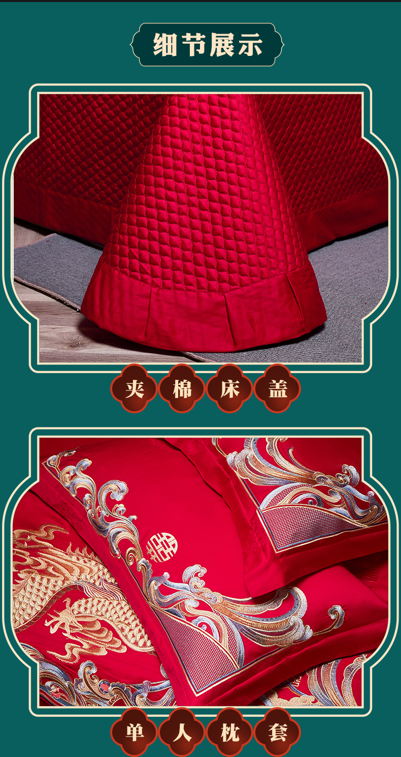 当前位置: 91家纺网 > 商品网购 > 床品套件 > 四件套 > 婚庆四件套 > 宏羽纺家纺 2024新款高支高密纯棉提花婚庆套件系列(控价680)百年龙凤