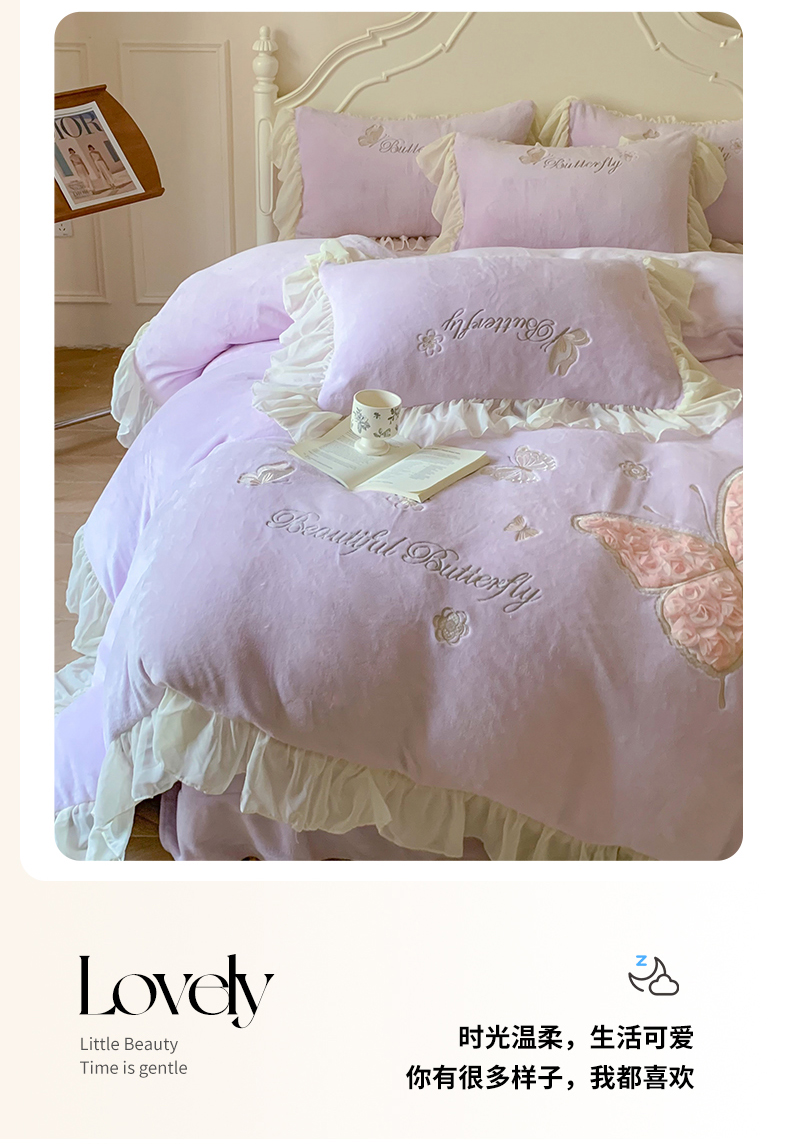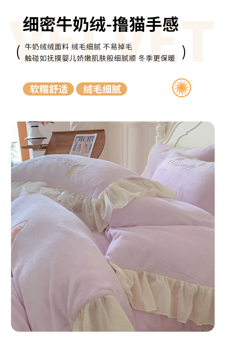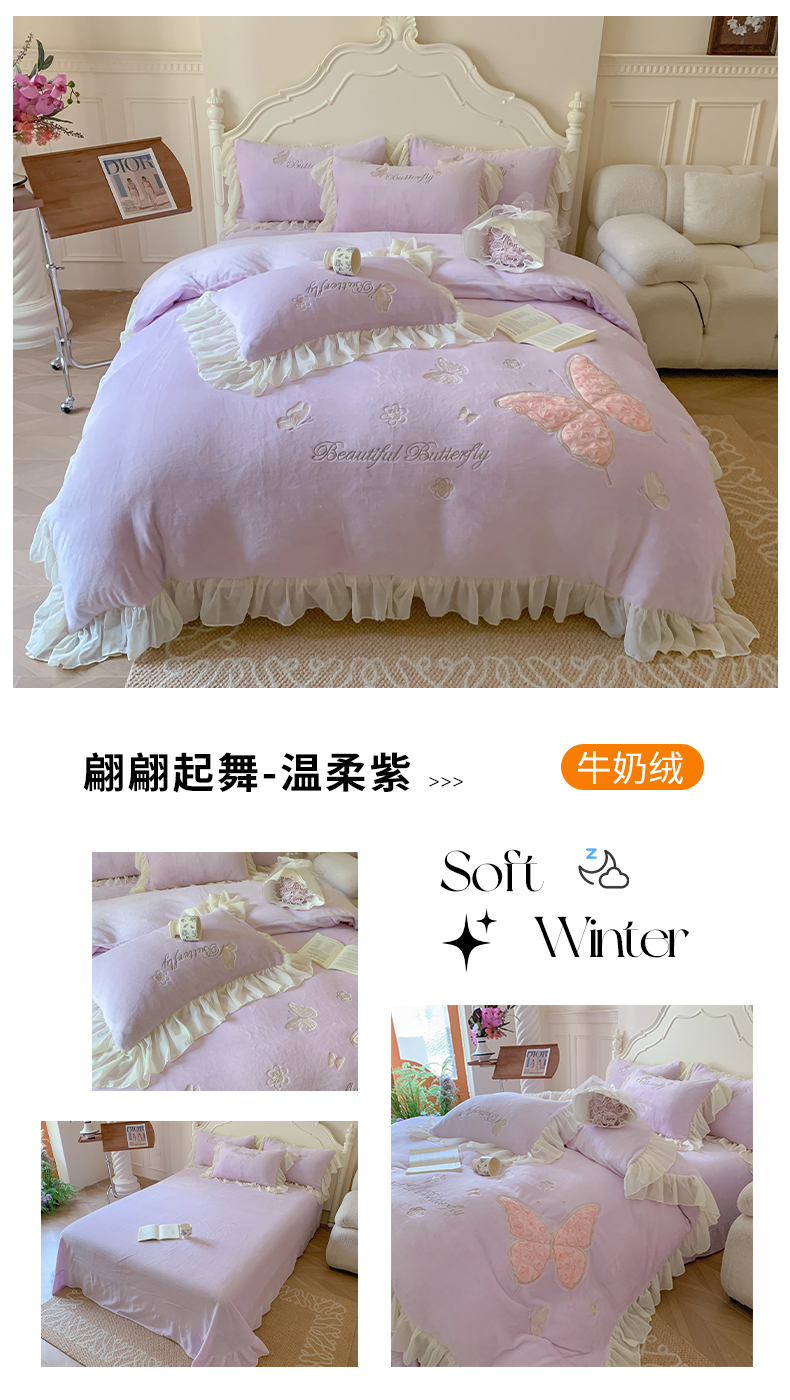 商品名称:富盛家纺 2024新款牛奶绒立体刺绣四件套韩版公主风四件套-翩翩起舞 4翩翩起舞—温柔紫