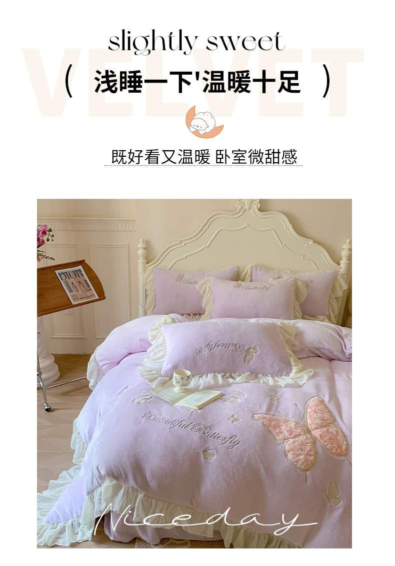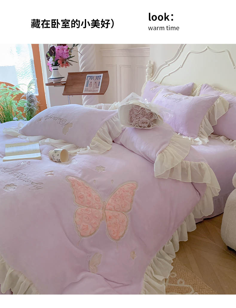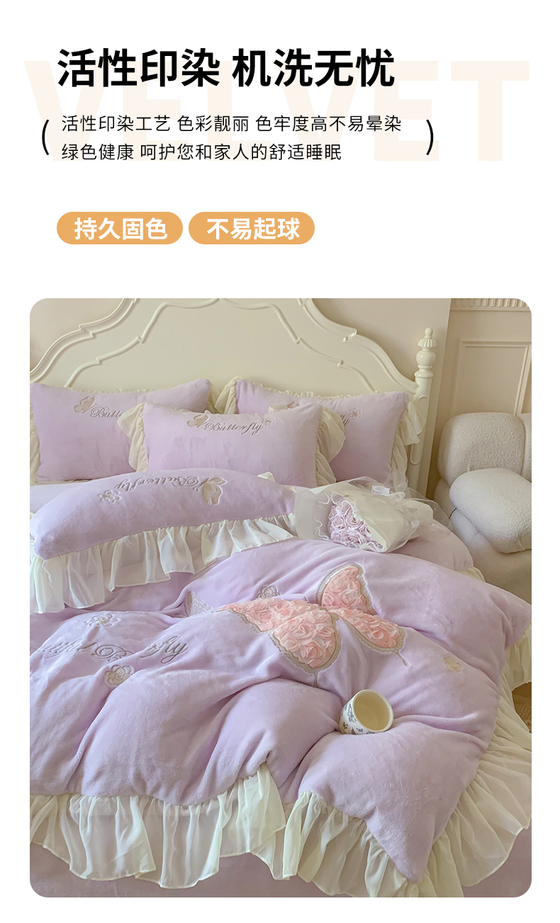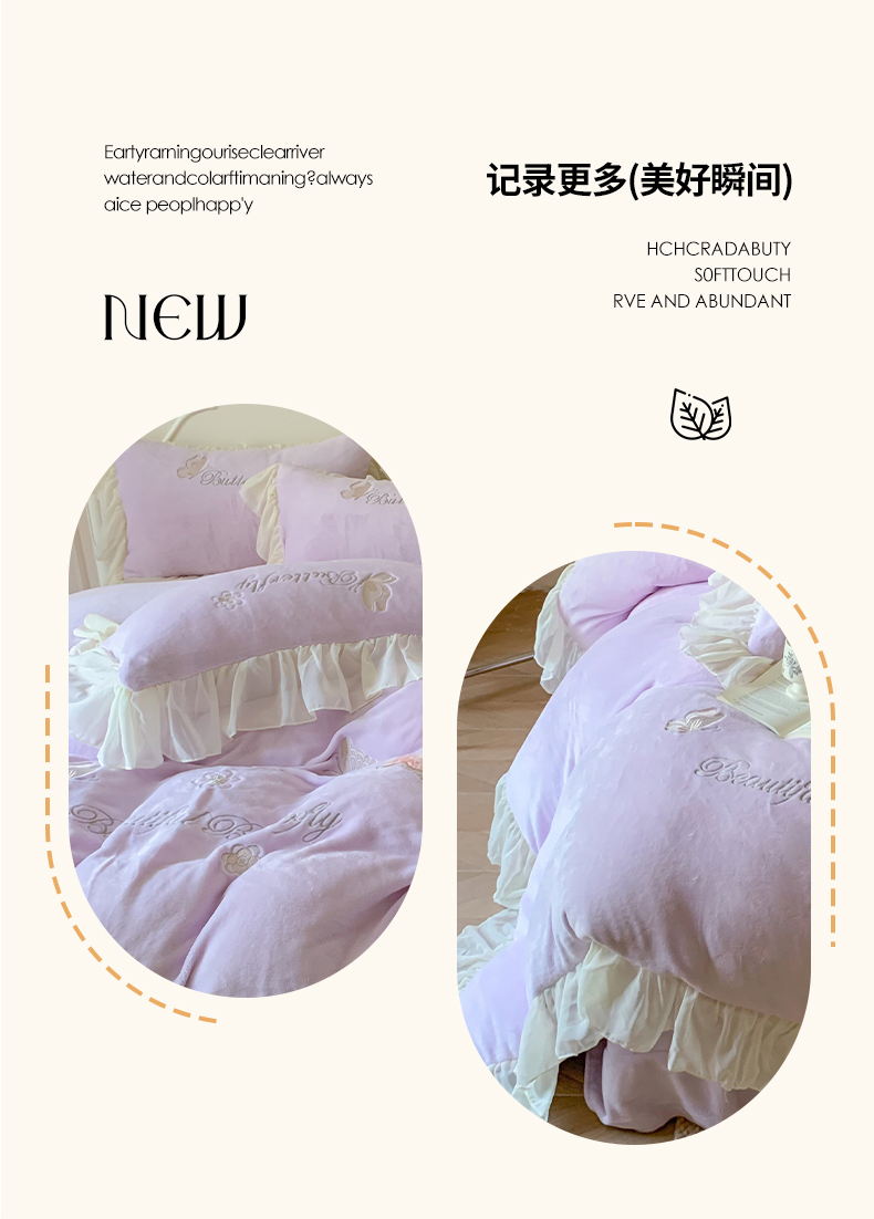 商品名称:富盛家纺 2024新款牛奶绒立体刺绣四件套韩版公主风四件套-翩翩起舞 4翩翩起舞—温柔紫