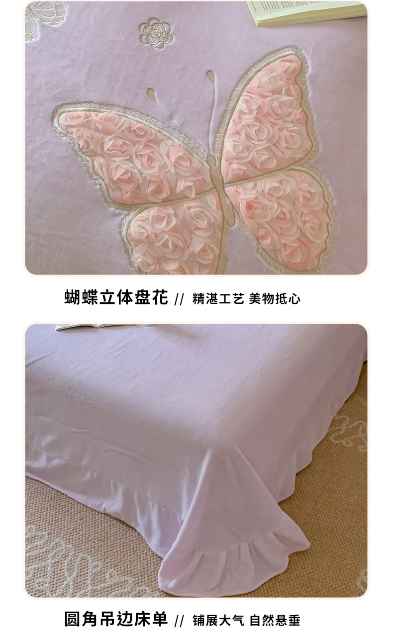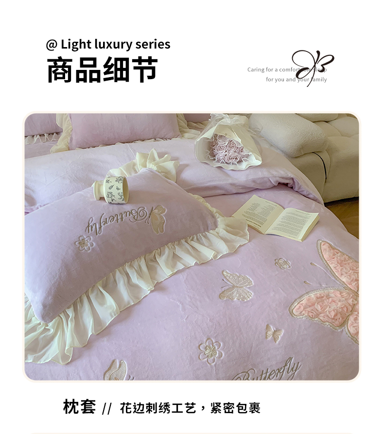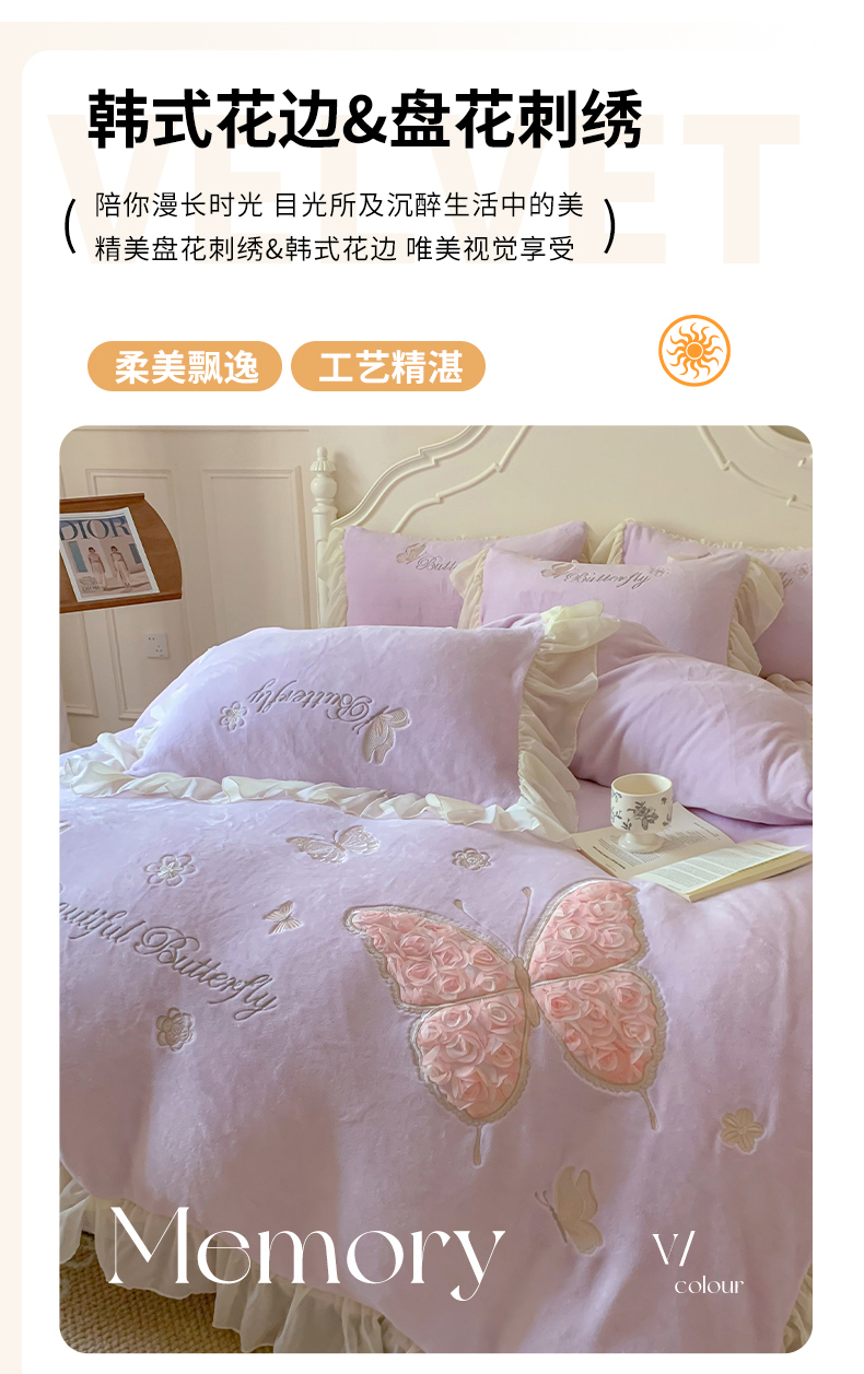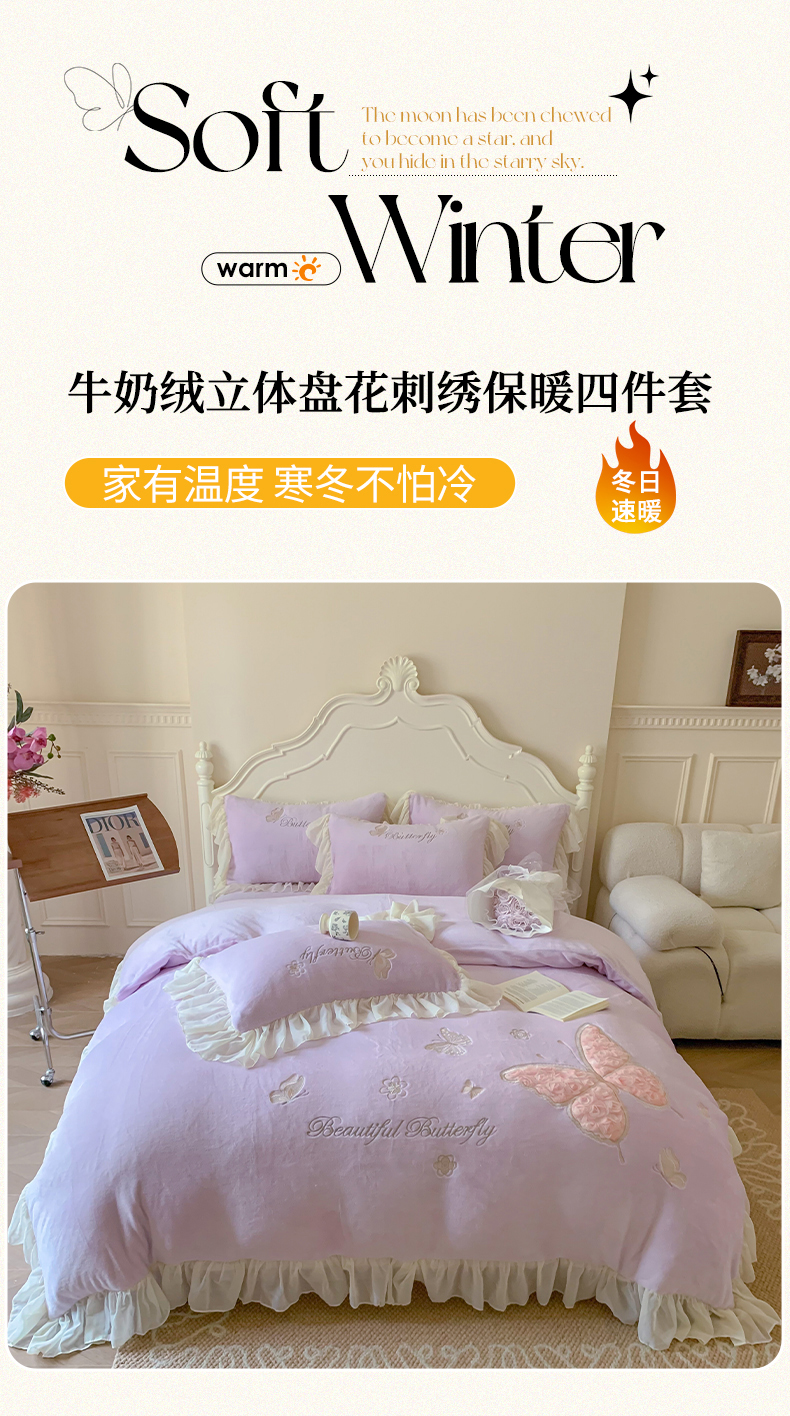 富盛家纺 2024新款牛奶绒立体刺绣四件套韩版公主风四件套-翩翩起舞 4翩翩起舞—温柔紫