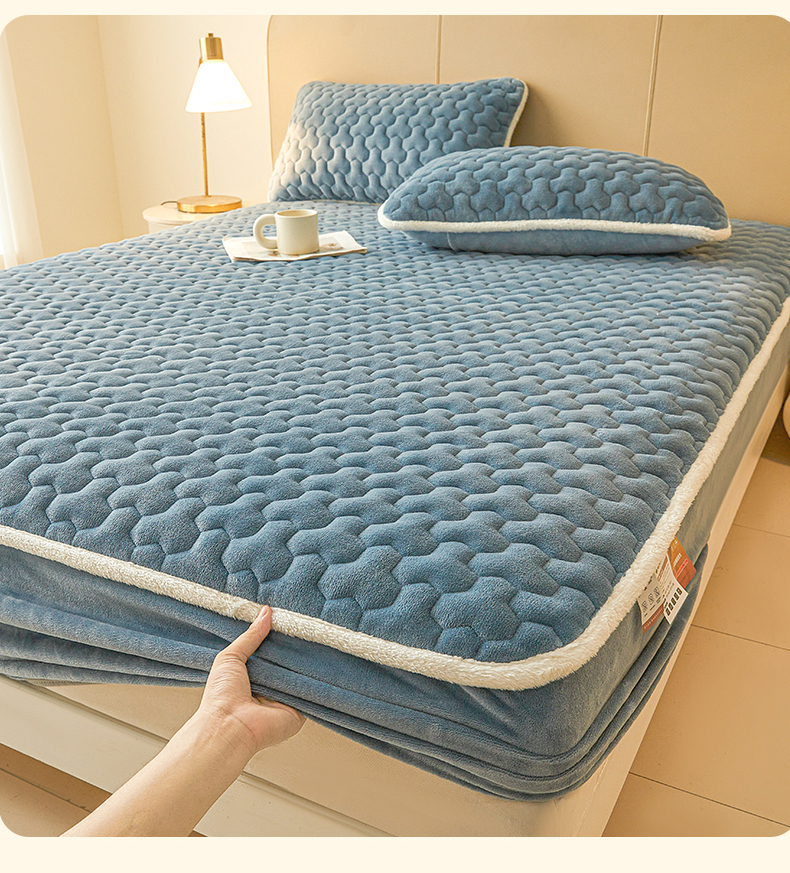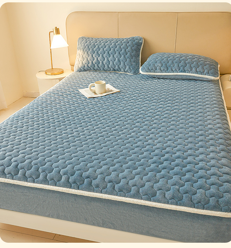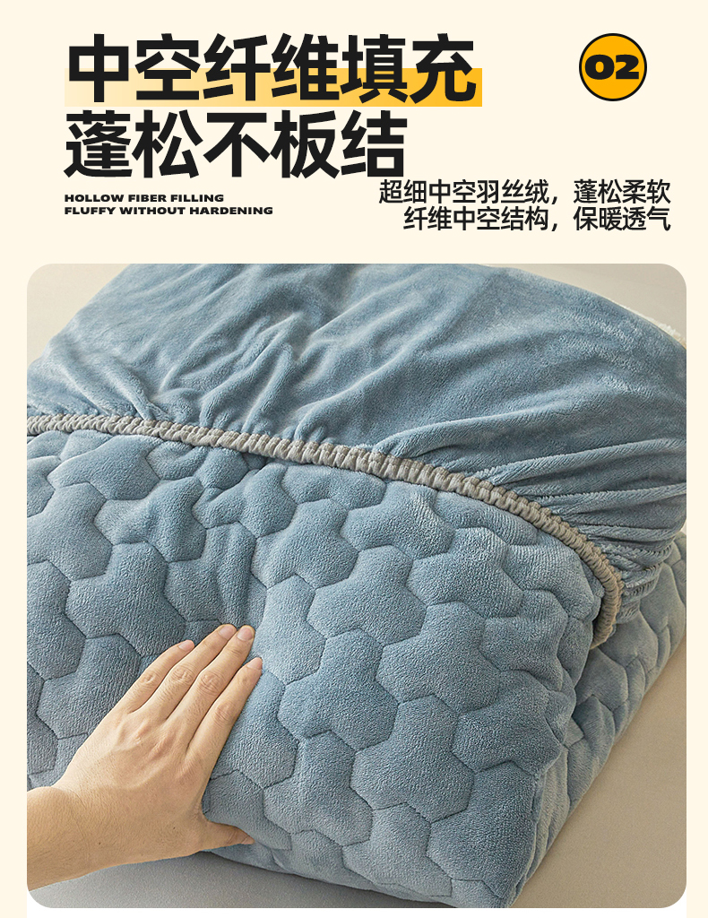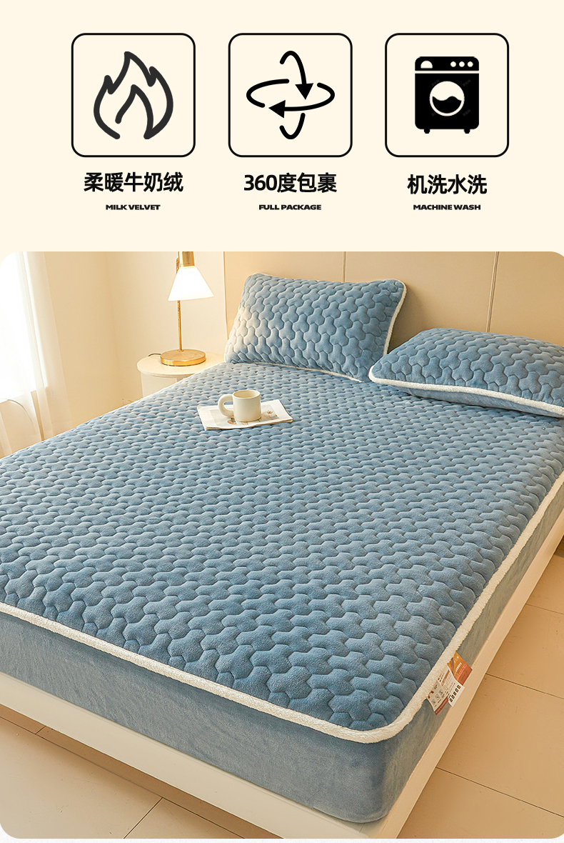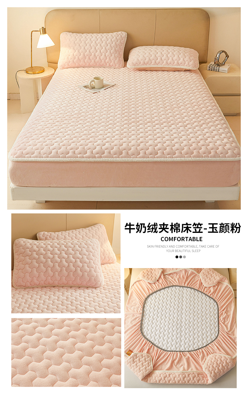 (总)雯豆家纺 2025冬季新款纯色素色牛奶绒夹棉床笠三件套保暖席梦思保护套