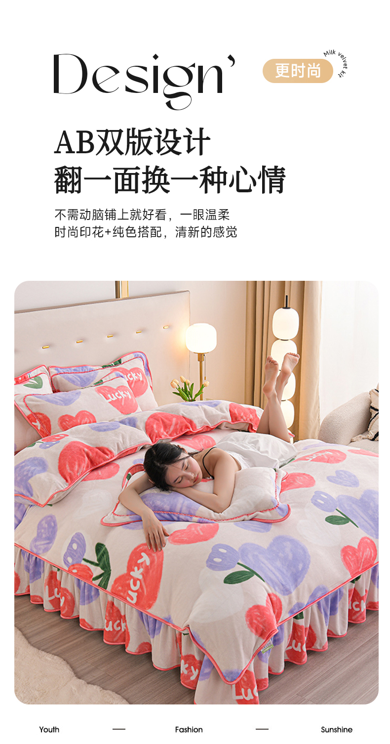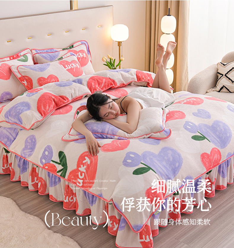 商品名称:赫本家纺 2025新品8-9斤爆品牛奶绒四件套床裙款金雕绒法莱绒四套件 幸运心