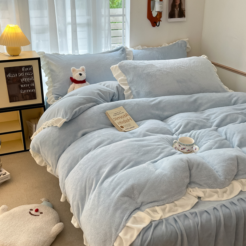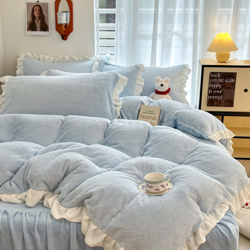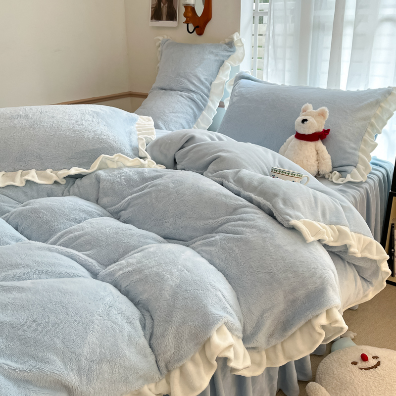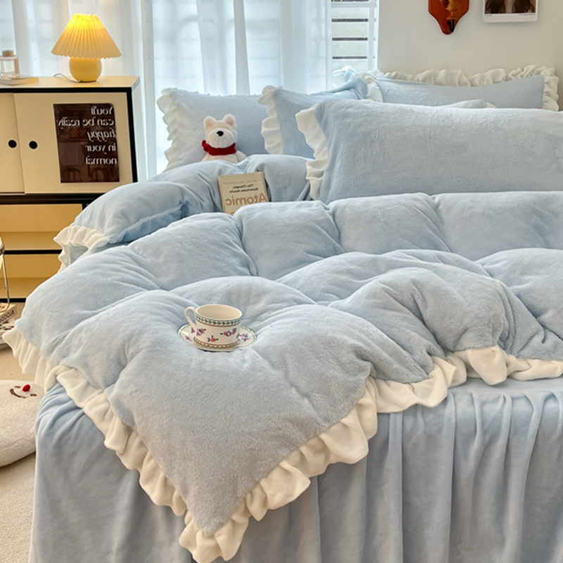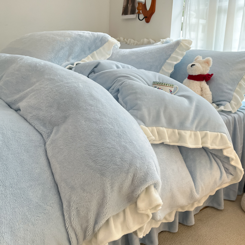 星座家纺 2025新款牛奶绒花边床裙款四件套 床裙款-天空蓝