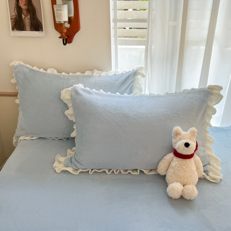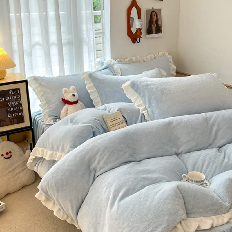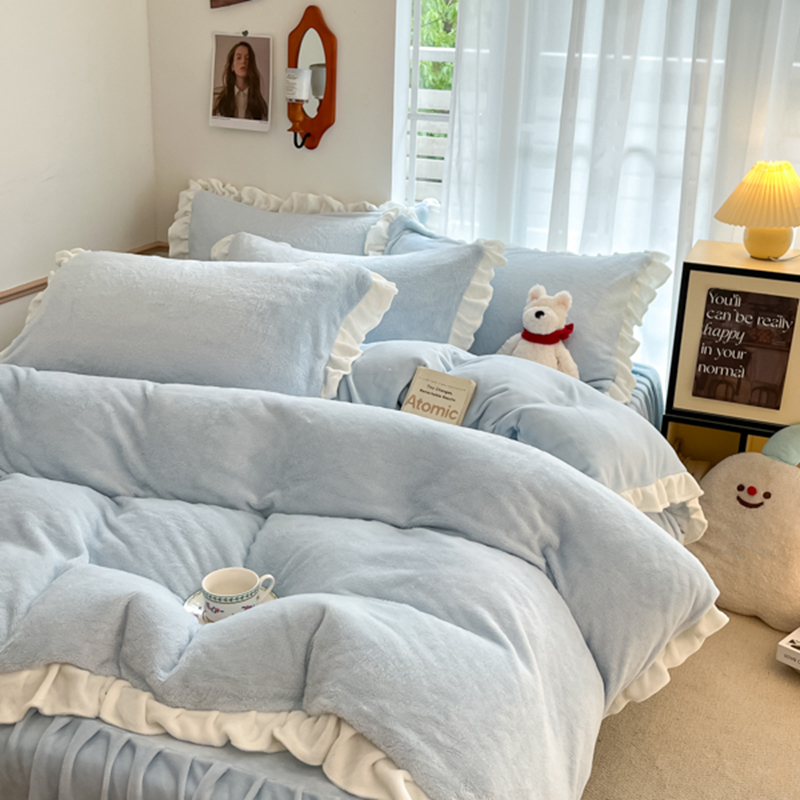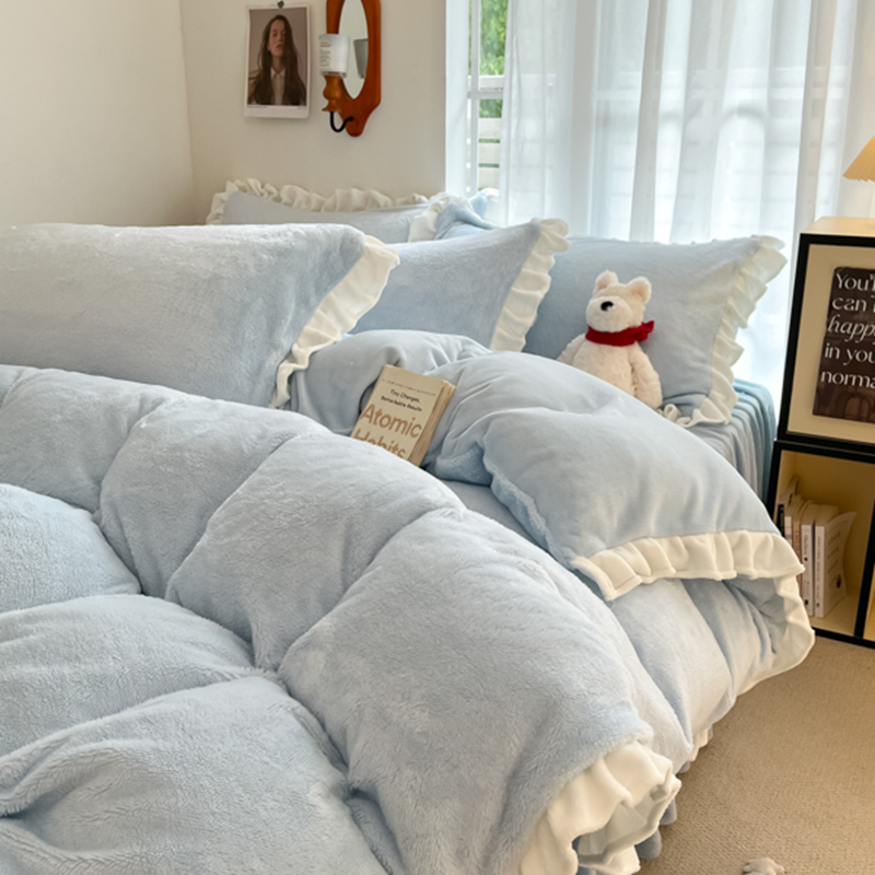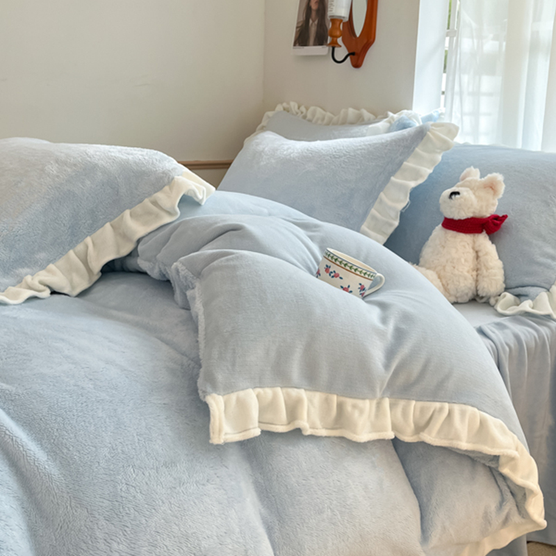 星座家纺 2025新款牛奶绒花边床裙款四件套 床裙款-天空蓝