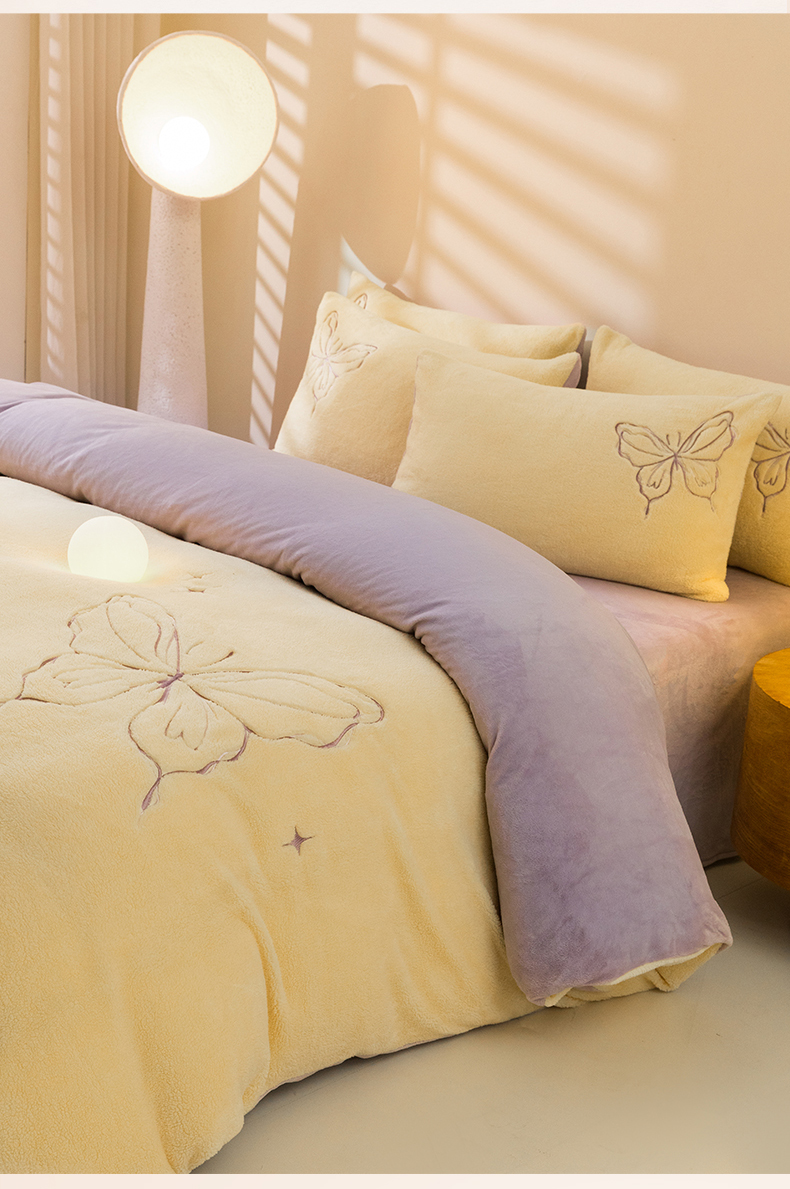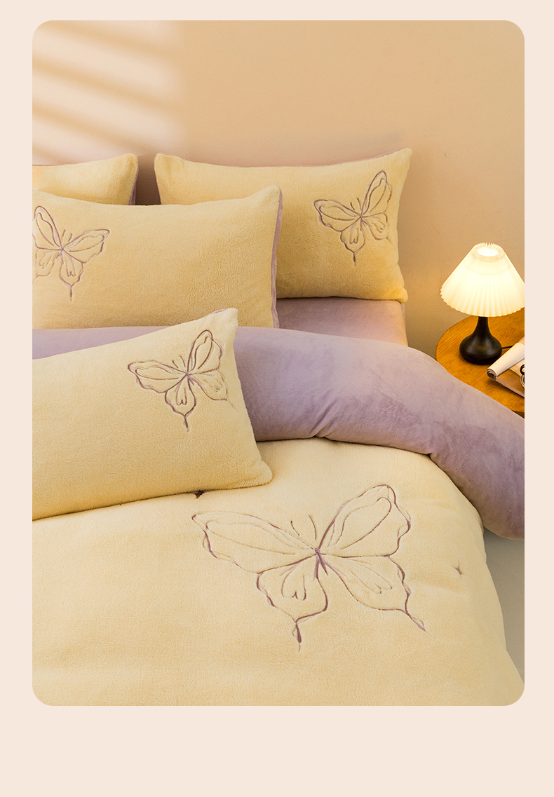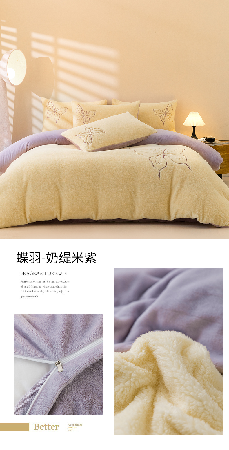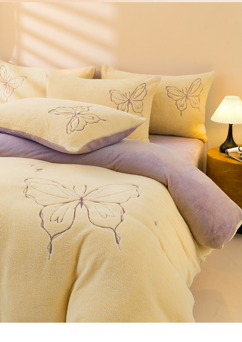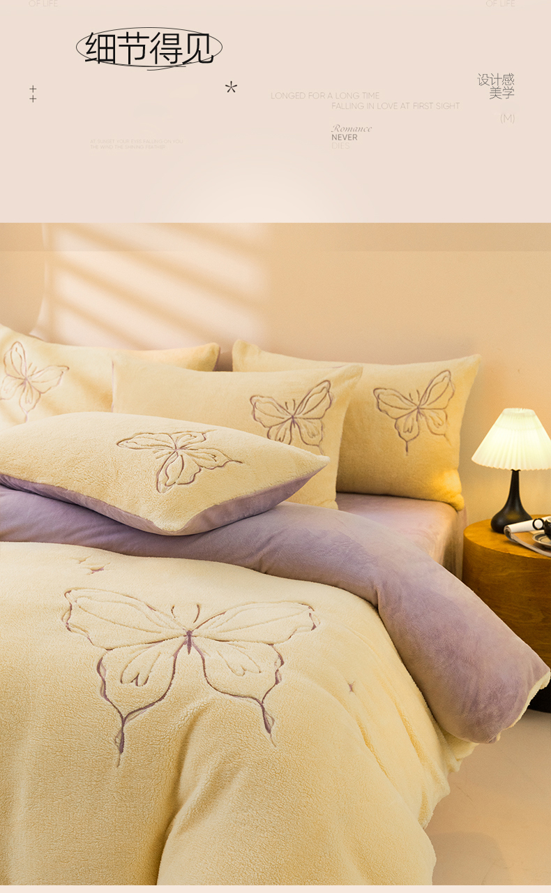 商品名称:2024新保暖-秋冬A类南极绒刺绣四件套-蝶羽系列 蝶羽-奶缇米紫