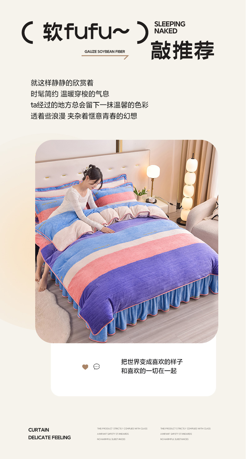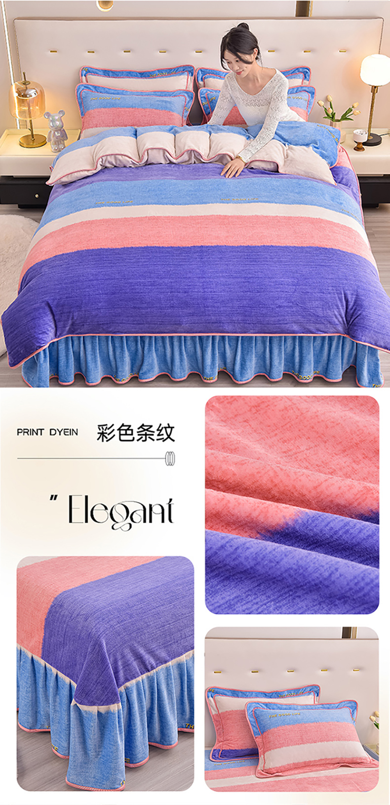 商品名称:晚静家纺 2024新款8.5斤牛奶绒金貂法莱绒床裙款保暖绒四件套 彩色条纹