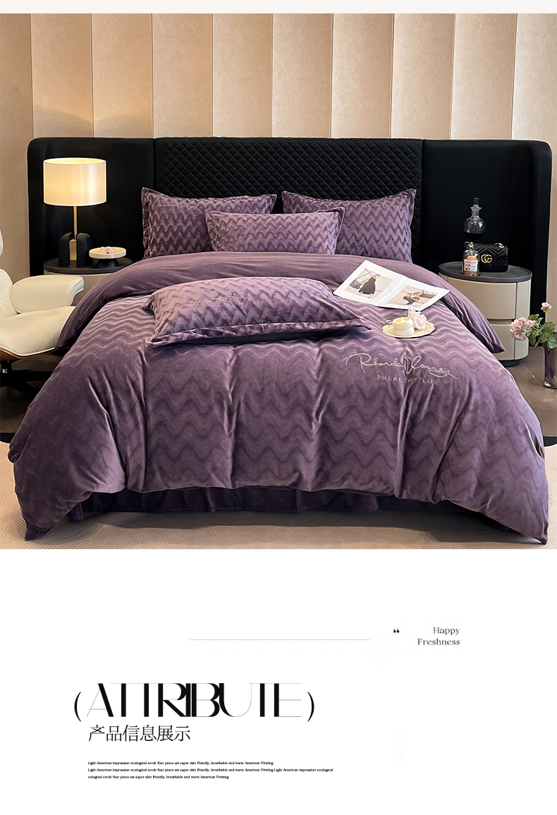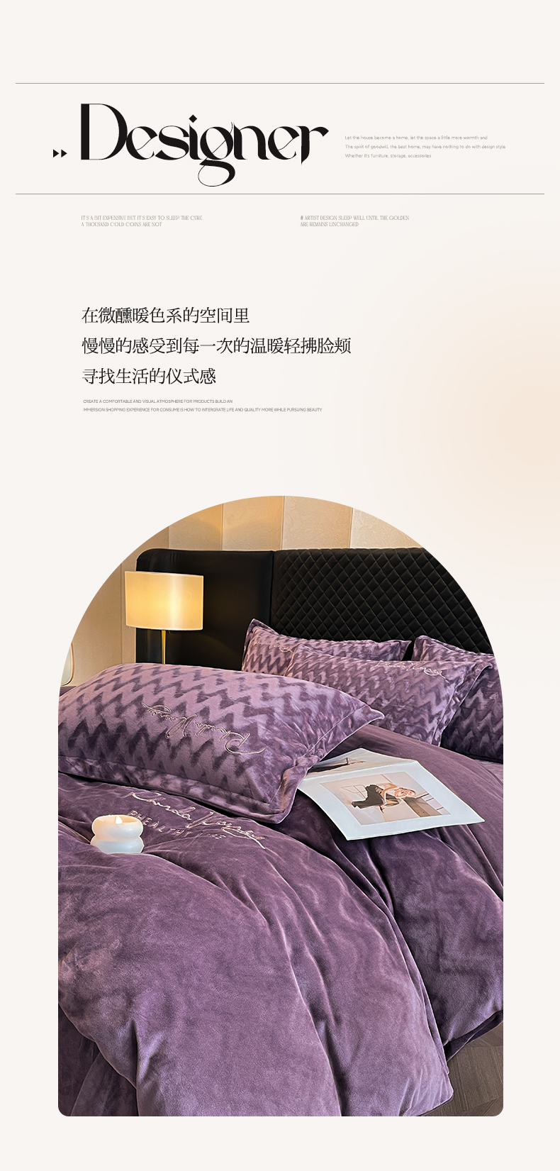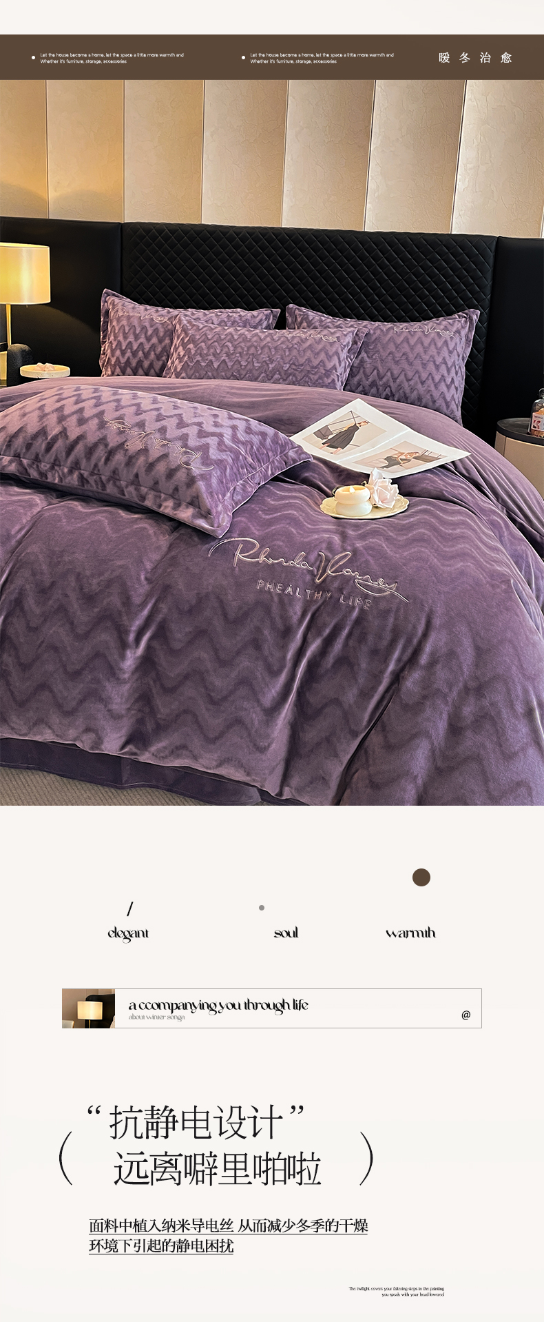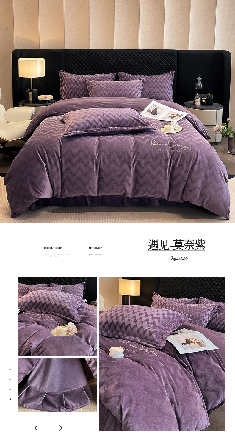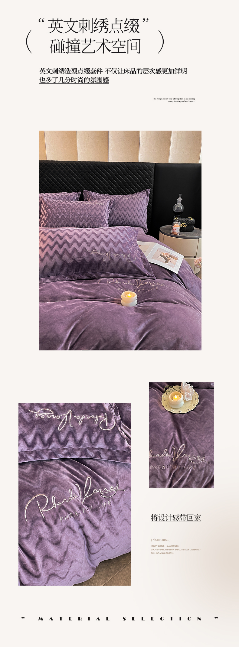 商品名称:2024新款高克重宝宝绒简奢风刺绣四件套系列-遇见 遇见-莫奈紫