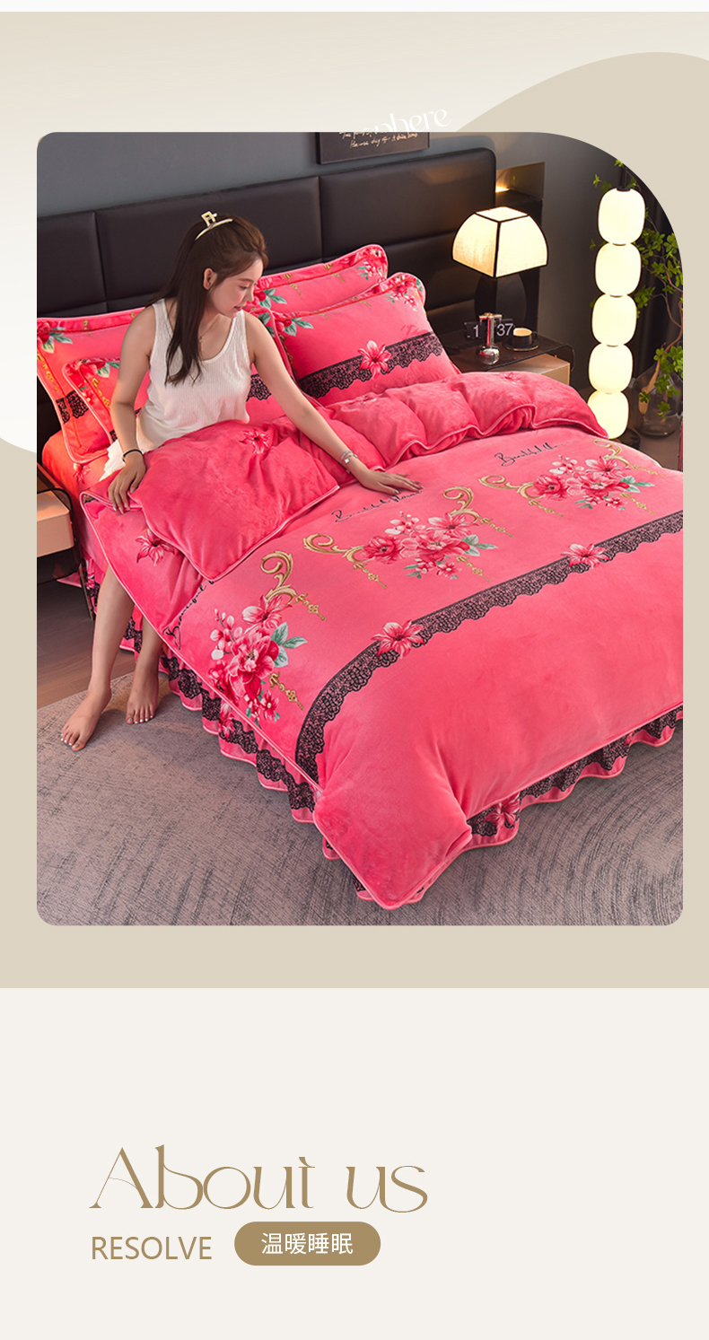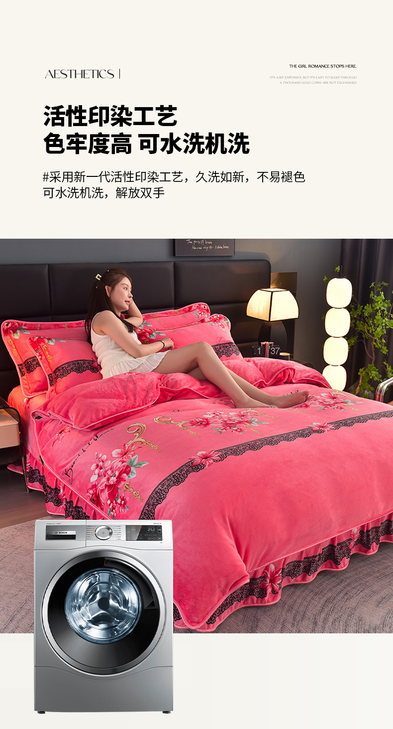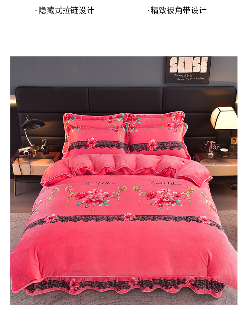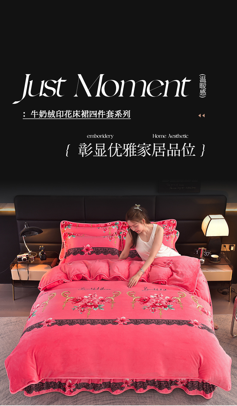 商品名称:2025新款牛奶绒印花床裙四件套系列-四件套 粉色佳人