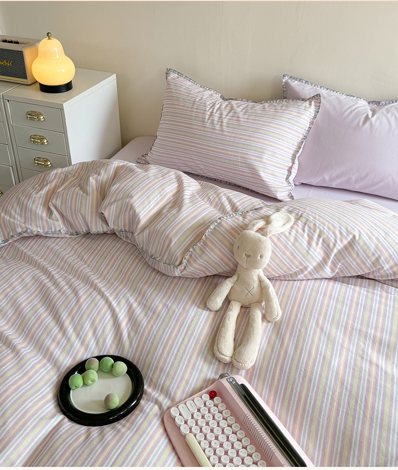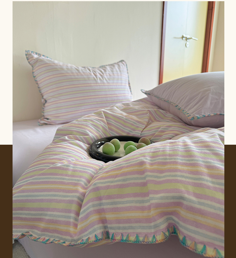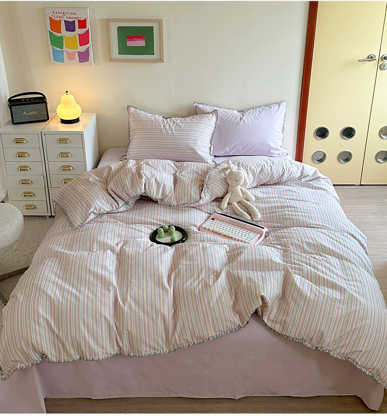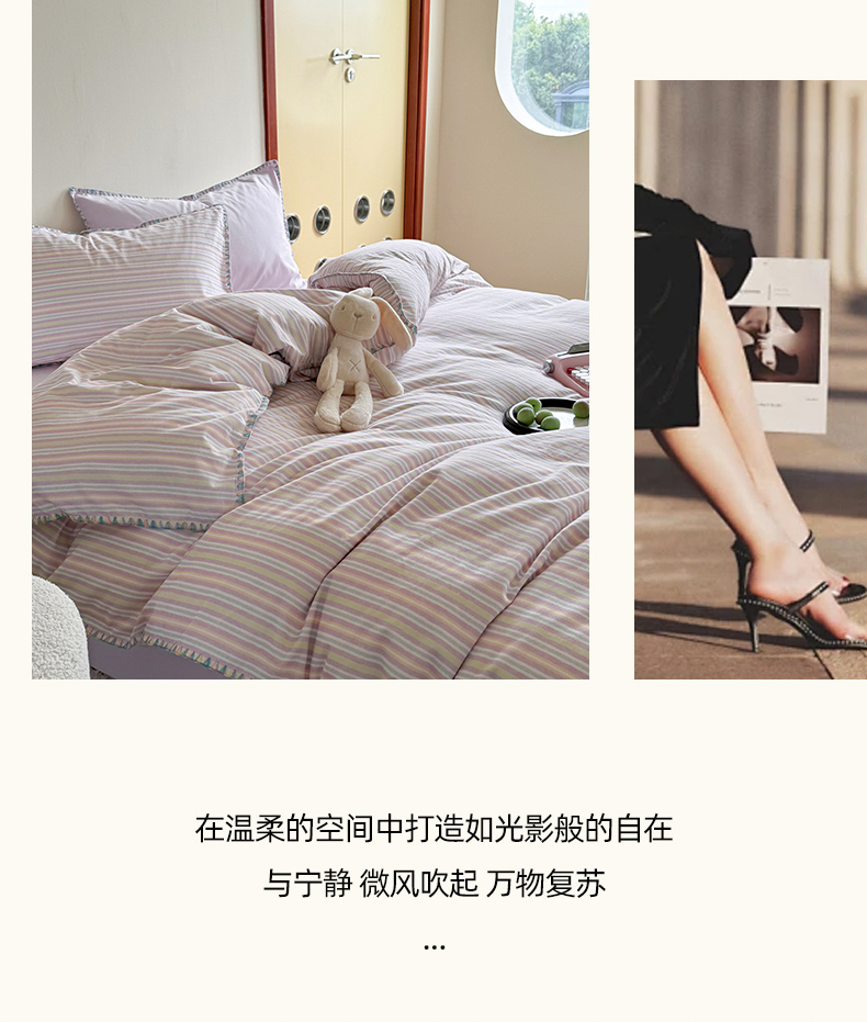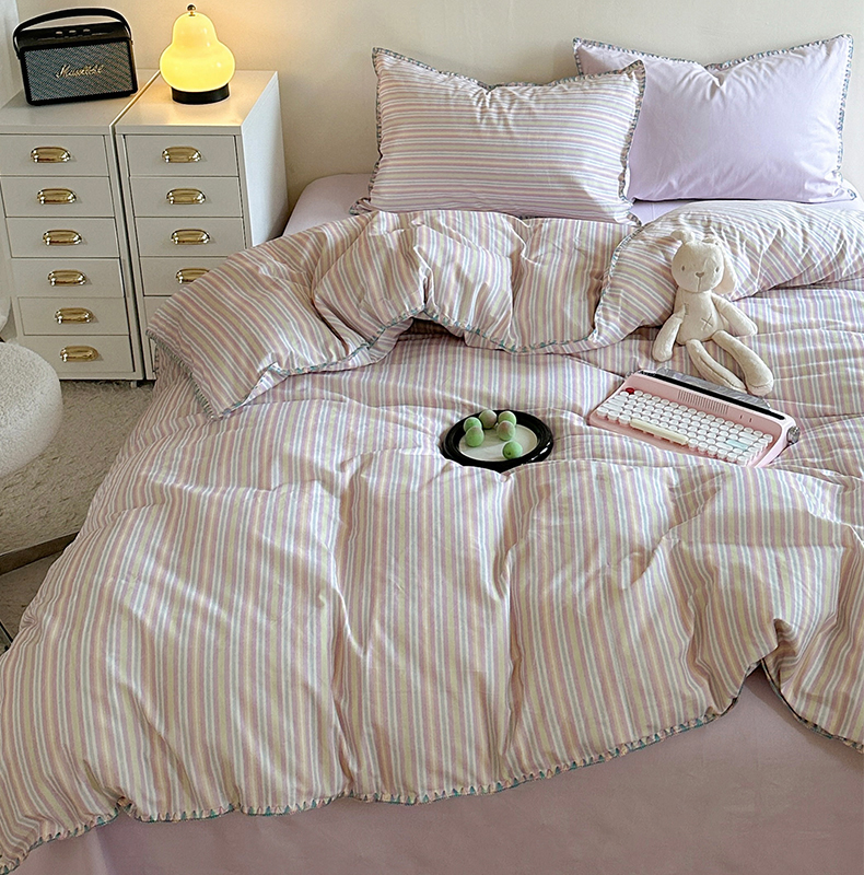 当前位置: 91家纺网 > 商品网购 > 床品套件 > 四件套 > 全棉普通四件套 > 艾莱家纺 2024新款七彩贝壳系列100S全棉柔顺加厚磨毛四件套 幻珊-紫细条