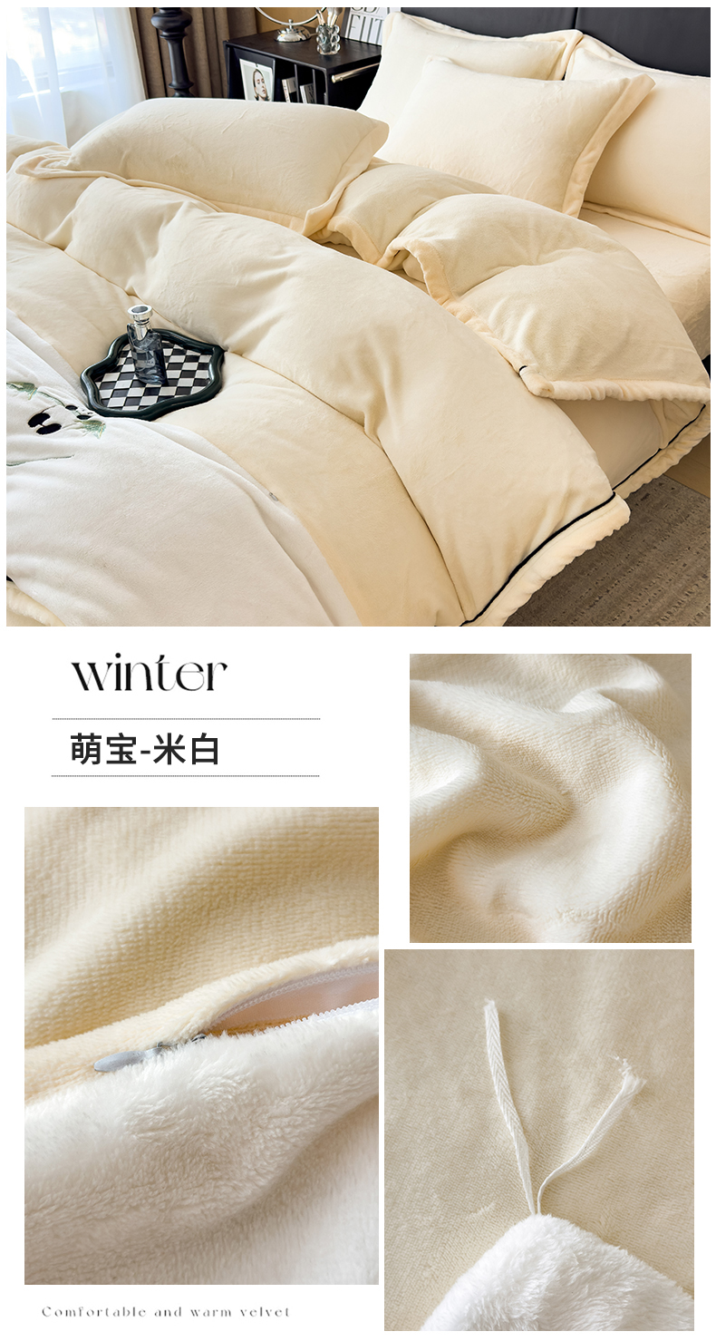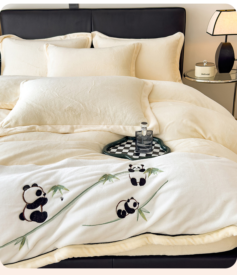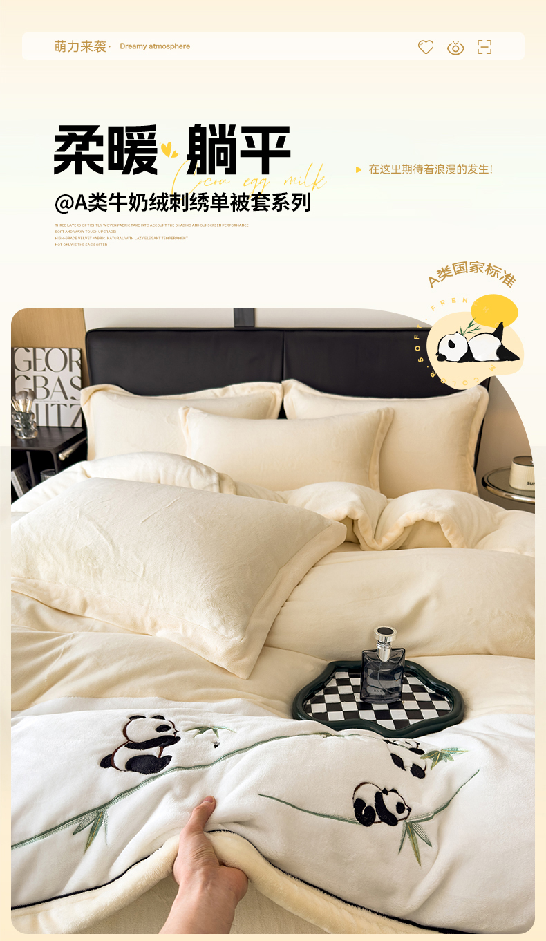 2024新款A类牛奶绒熊猫刺绣夹棉单被套 萌宝-米白