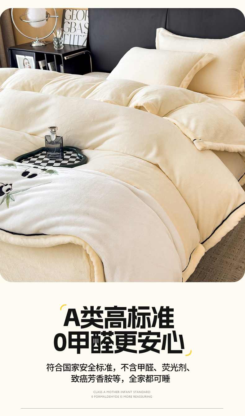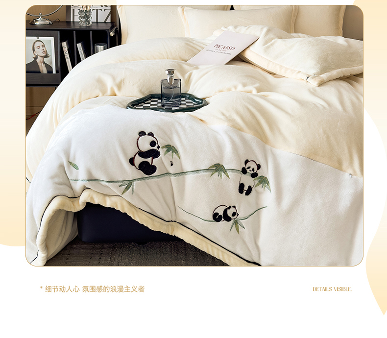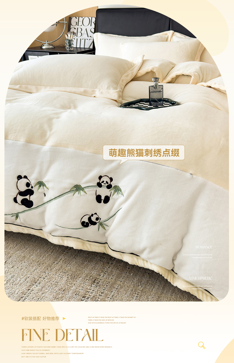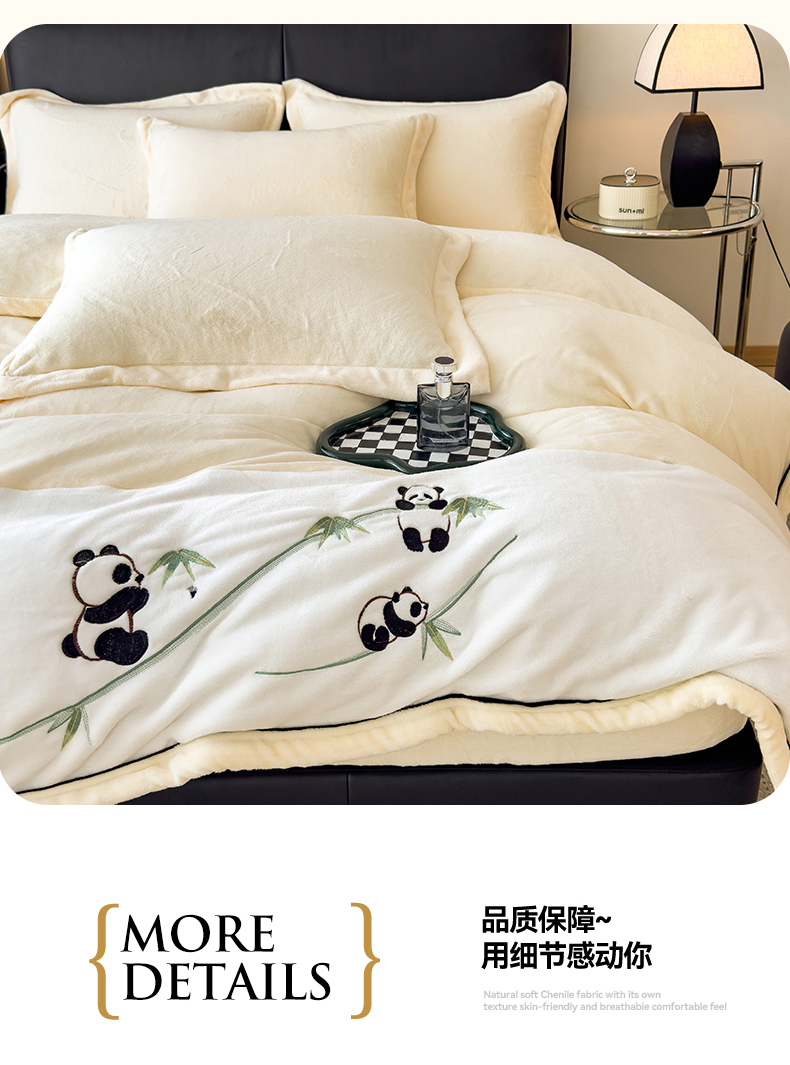 2024新款A类牛奶绒熊猫刺绣夹棉单被套 萌宝-米白