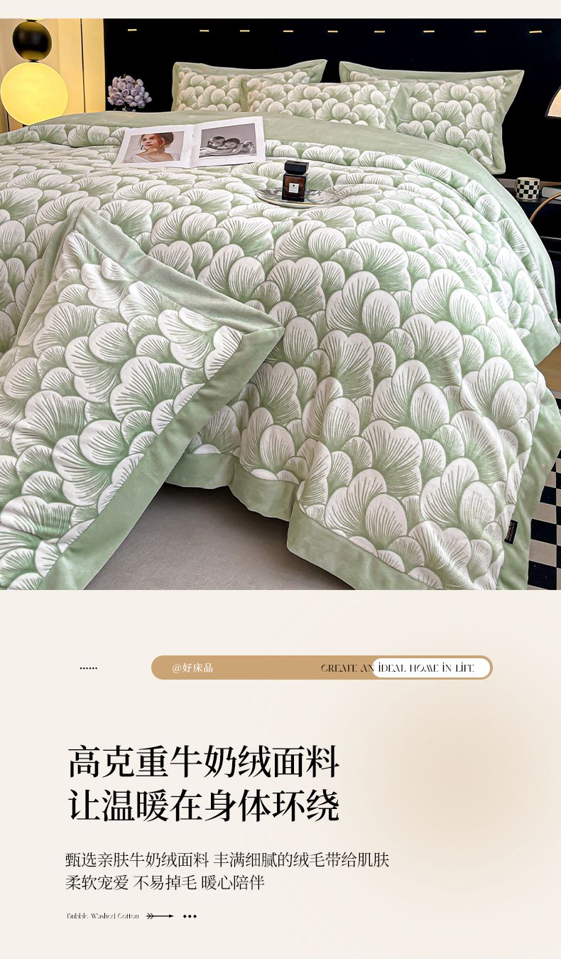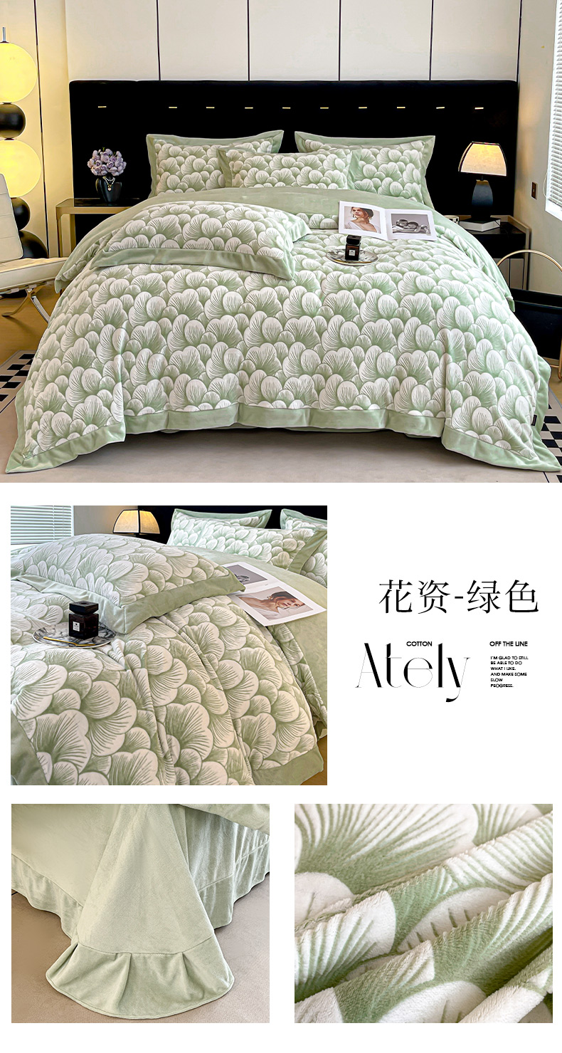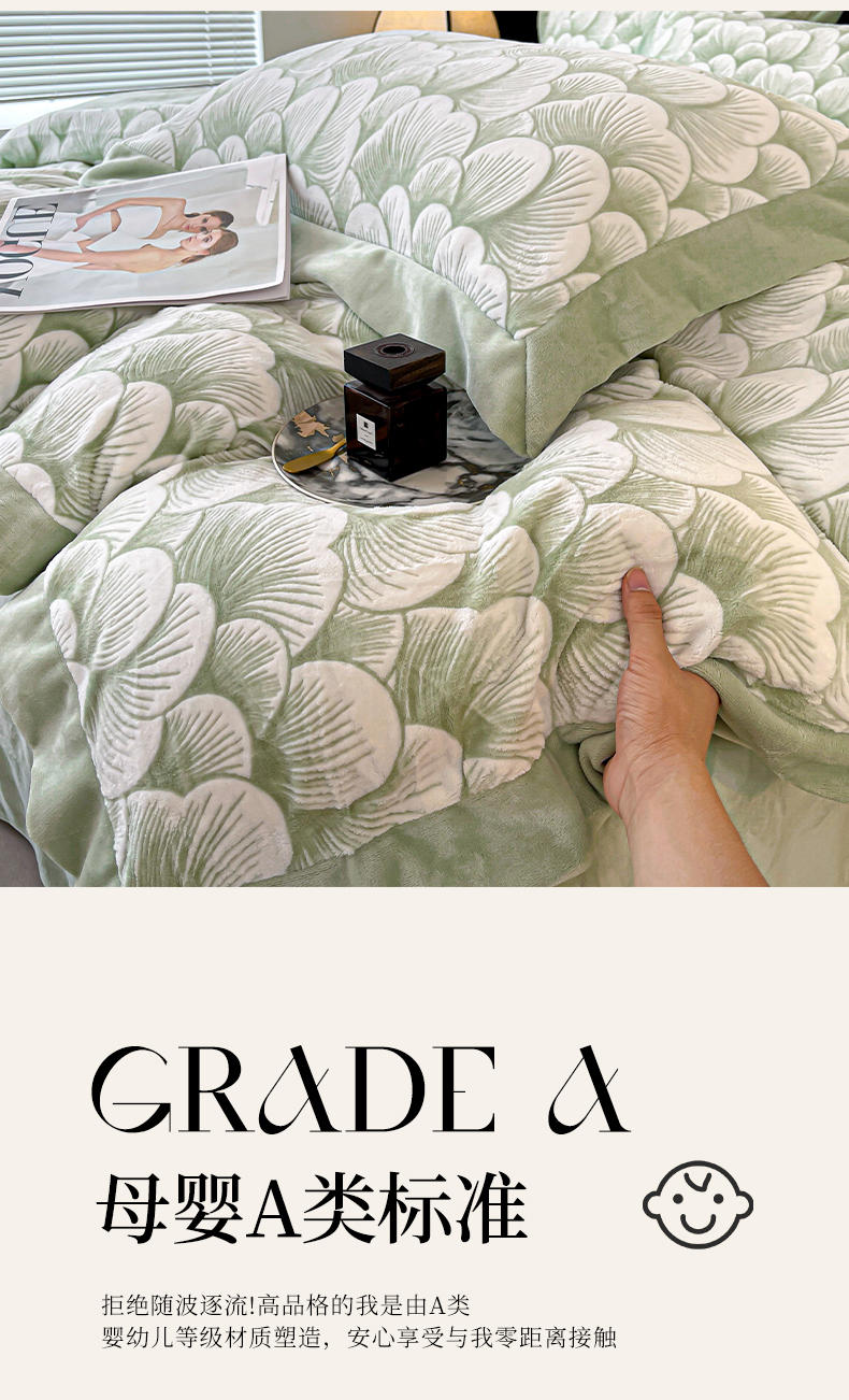 商品名称:芷卧 2025新款高克重A类全拼角立体雕花绒牛奶绒四件套 花资-绿色