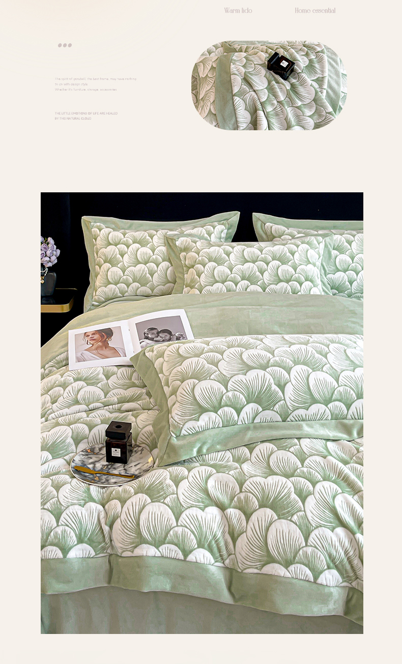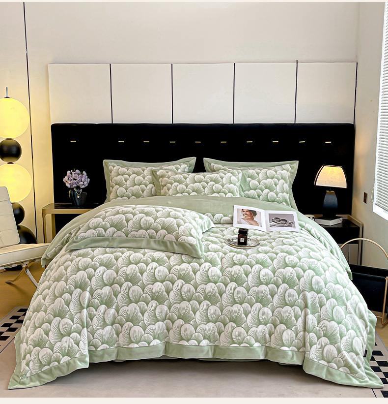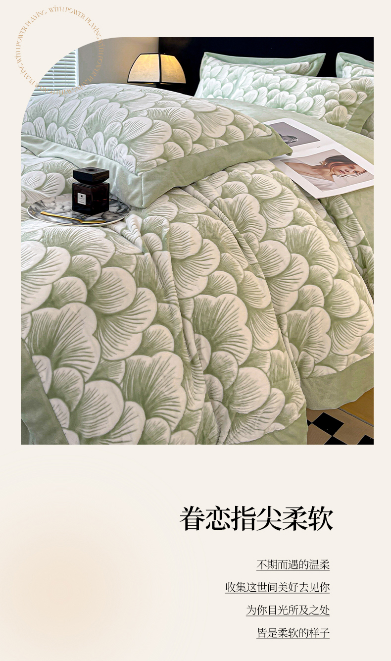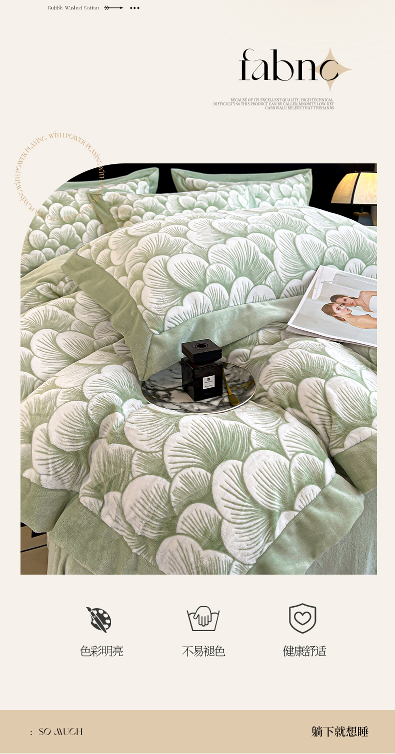 商品名称:芷卧 2025新款高克重A类全拼角立体雕花绒牛奶绒四件套 花资-绿色