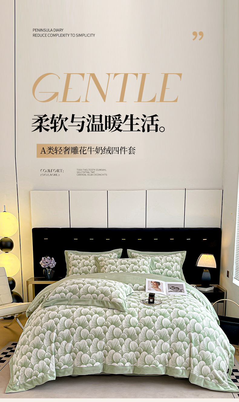 芷卧 2025新款高克重A类全拼角立体雕花绒牛奶绒四件套 花资-绿色