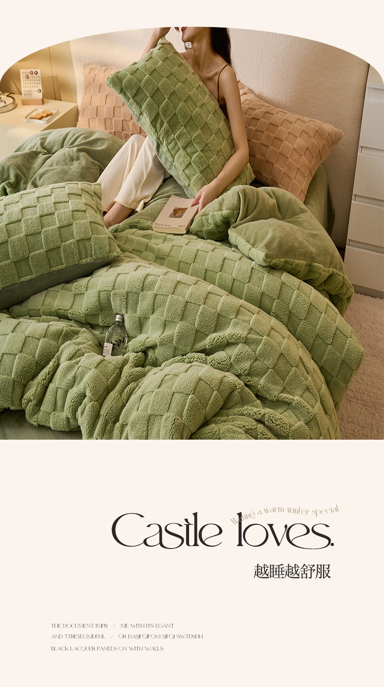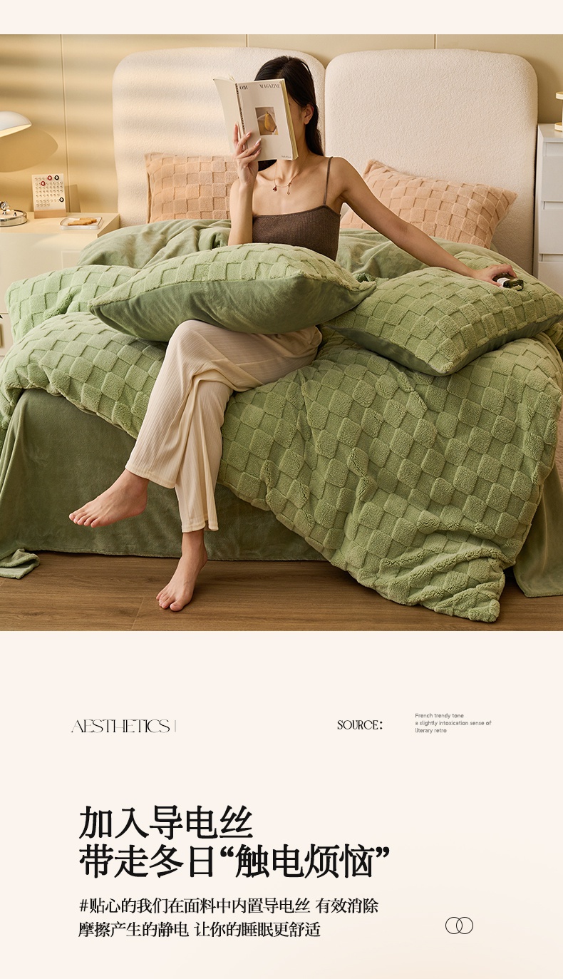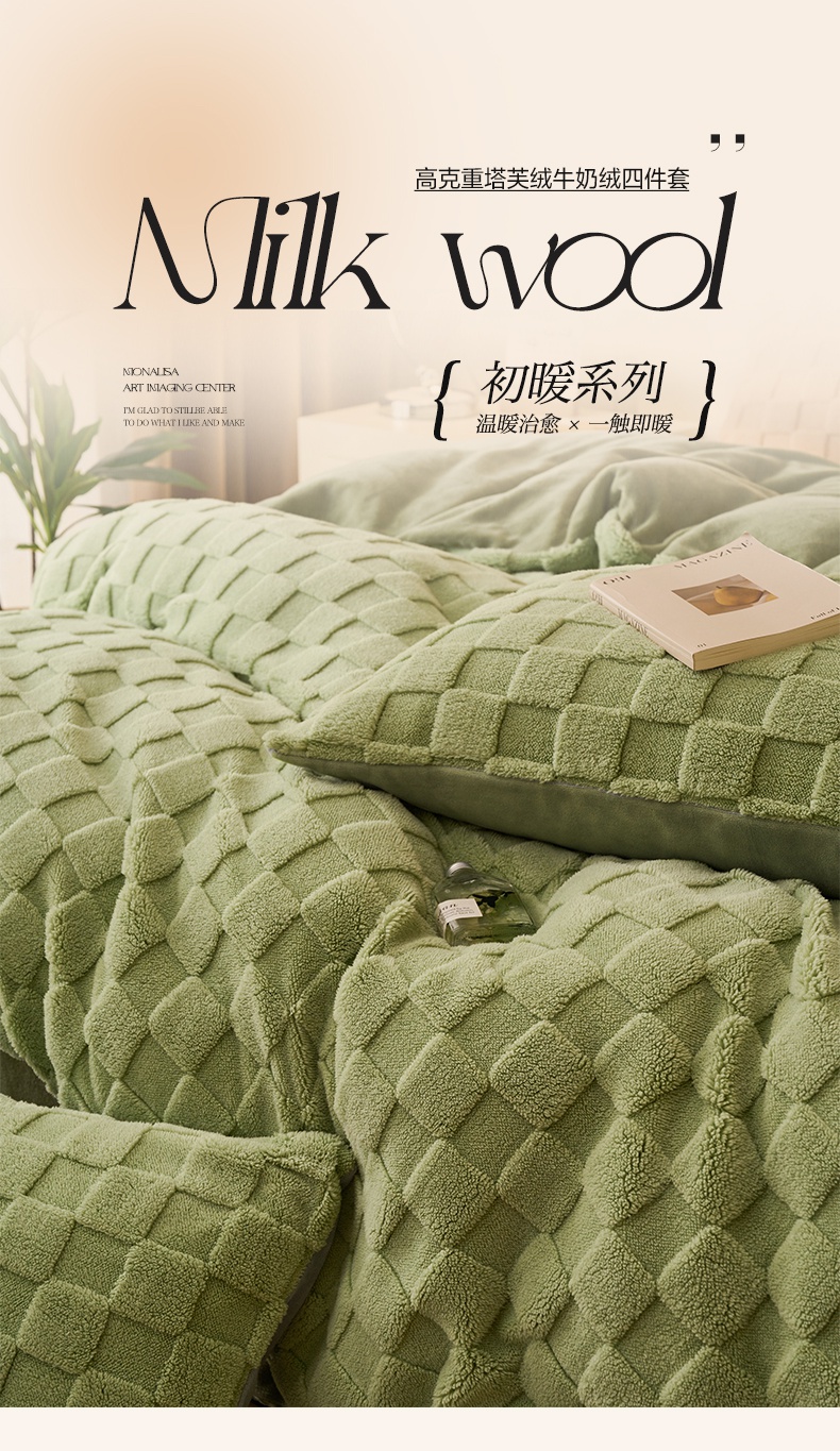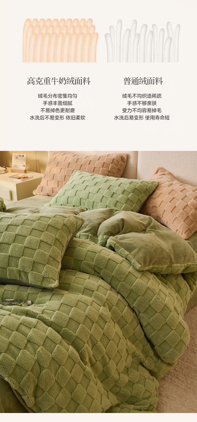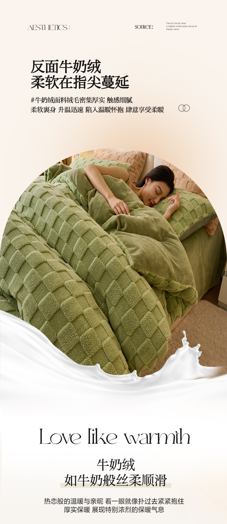 当前位置: 91家纺网 > 商品网购 > 床品套件 > 四件套 > 牛奶绒四件套 > 晨曦家纺 2024新款塔芙绒牛奶绒四件套-初暖系列 初暖-果绿