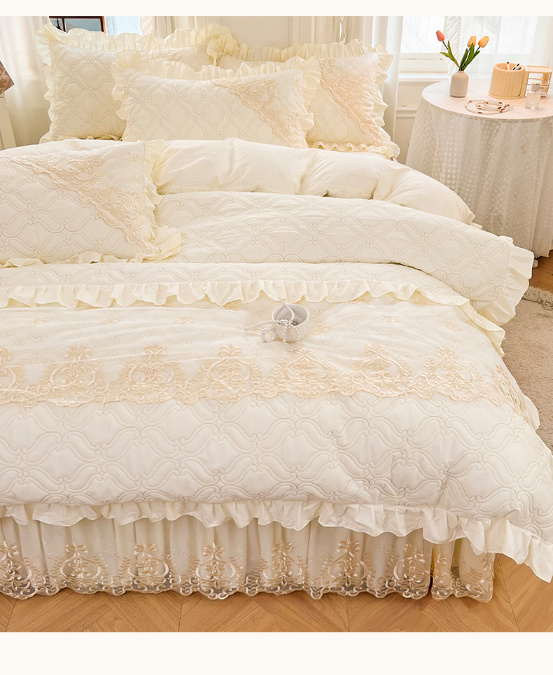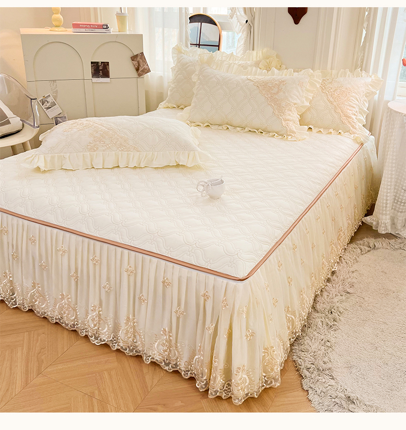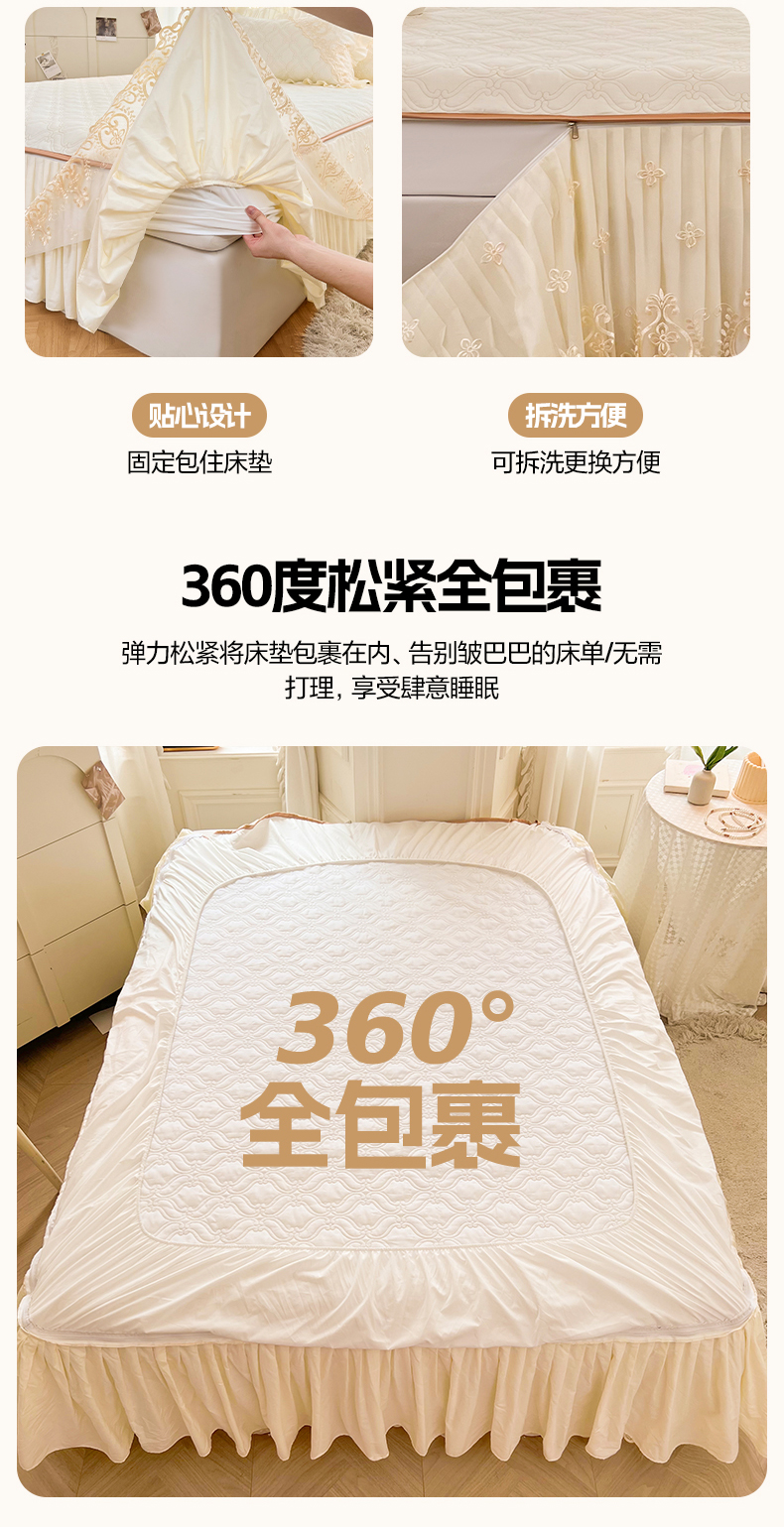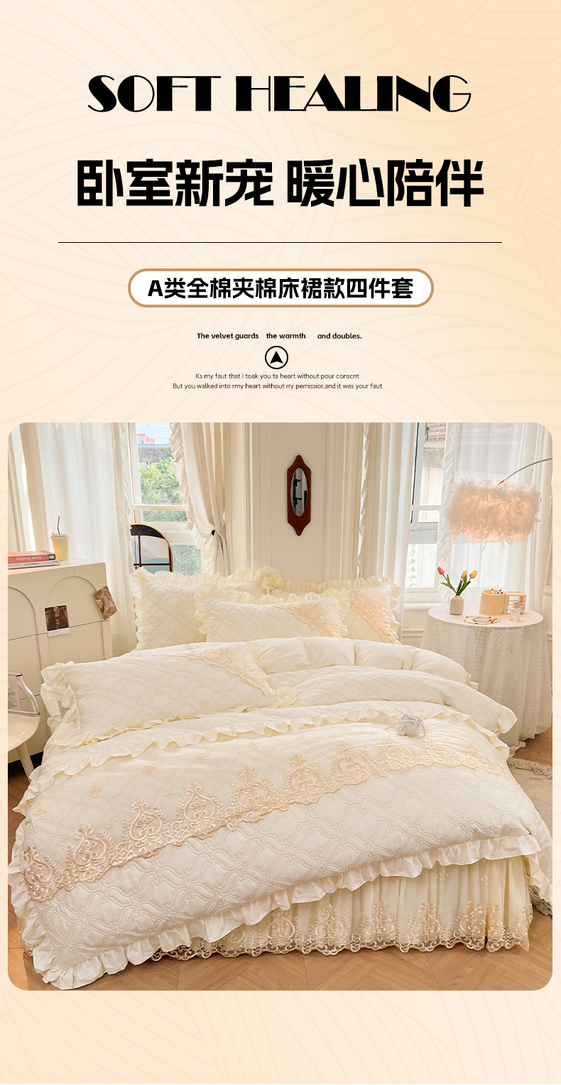 当前位置: 91家纺网 > 商品网购 > 床品套件 > 四件套 > 全棉普通四件套 > 罗艺轩 2024新款公主风全棉加厚可脱卸床笠式床裙四件套 慕雅-奶昔
