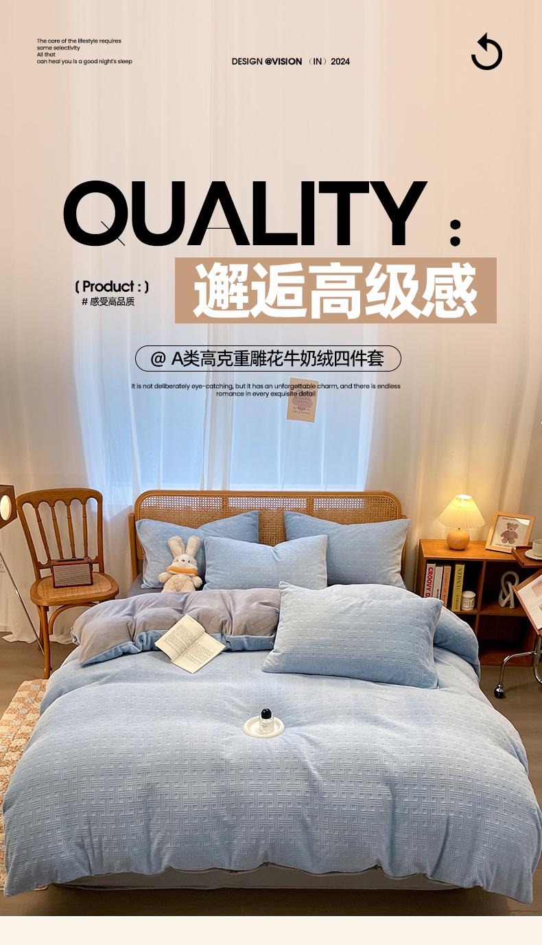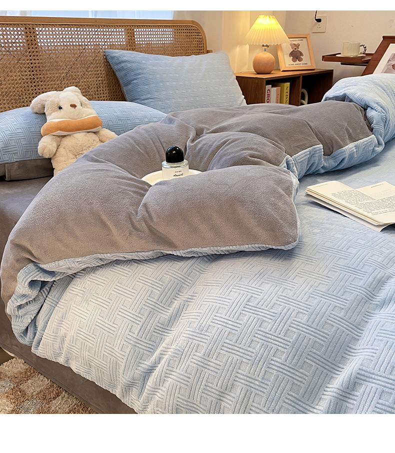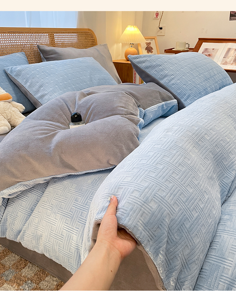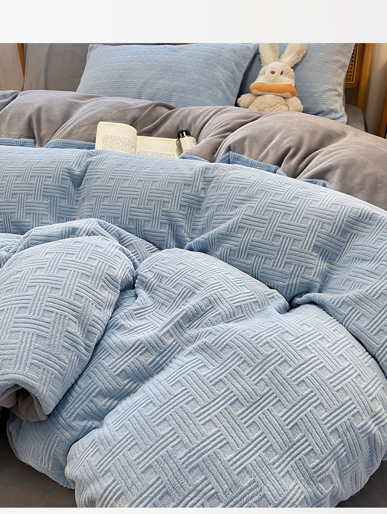 当前位置: 91家纺网 > 商品网购 > 床品套件 > 四件套 > 牛奶绒四件套 > 莱茵家居 2024新款A类高克重雕花牛奶绒四件套-糖果格 糖果格-蓝灰
