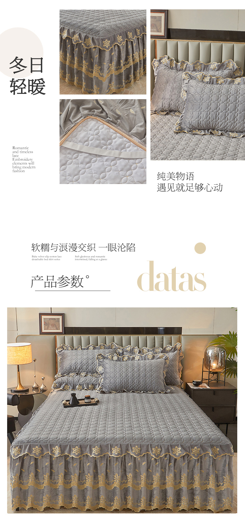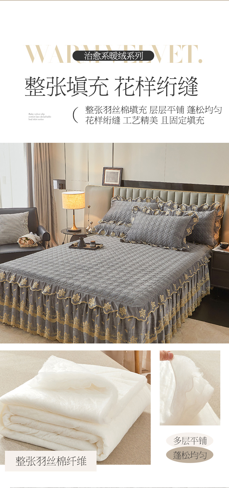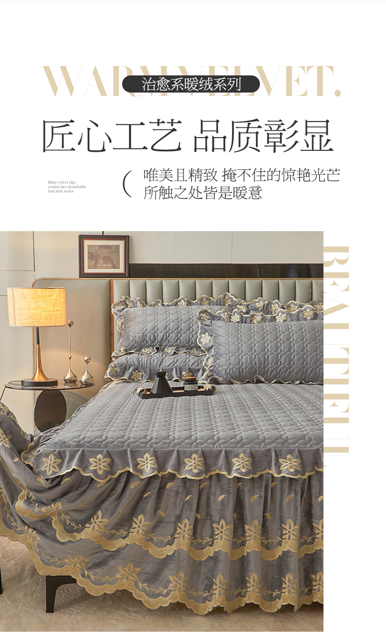 • 91家纺网 家纺一手货源 找家纺 虹星家纺 2024新款可拆卸宝宝绒夹棉床裙三件套-盛世芳华 盛世芳华 梦灰