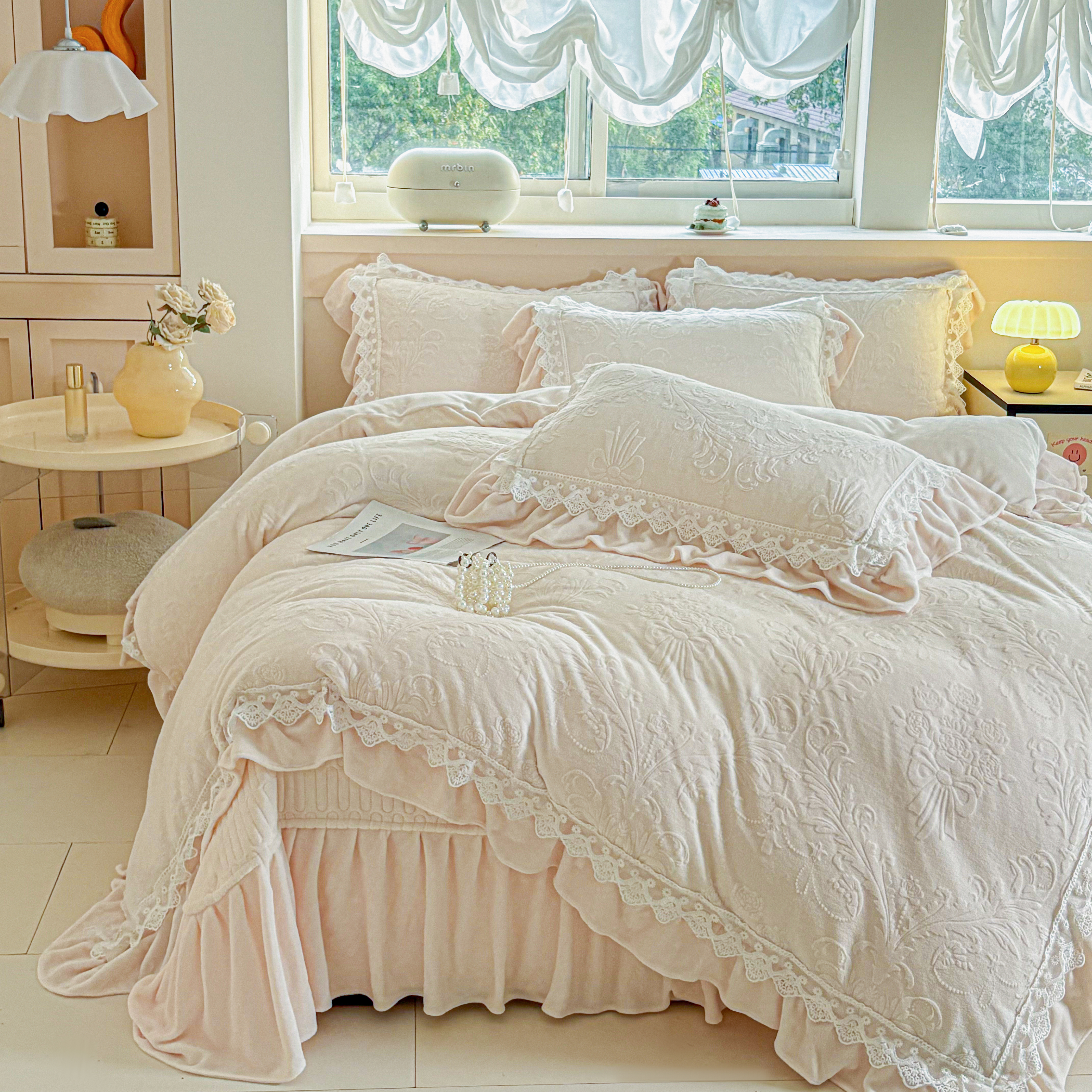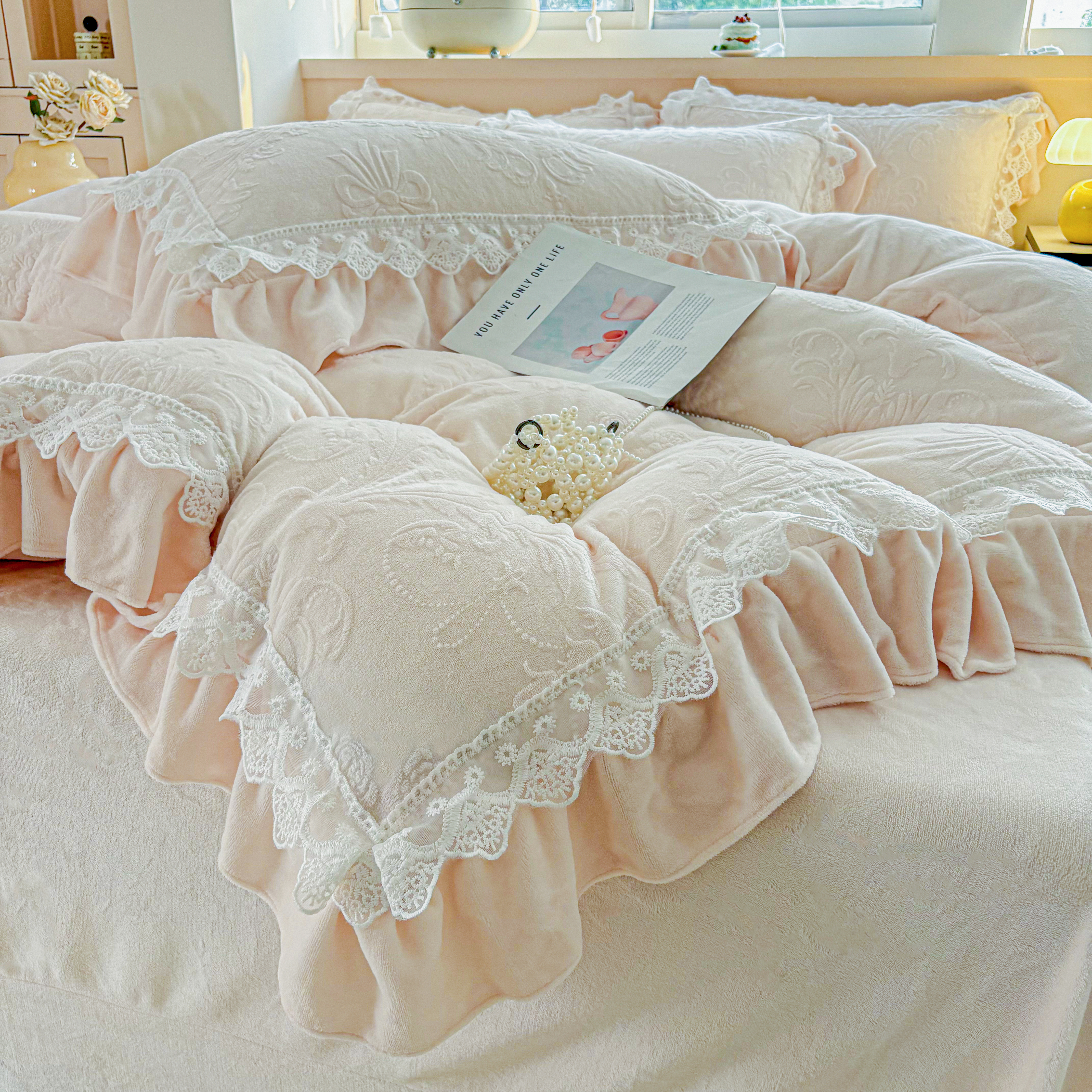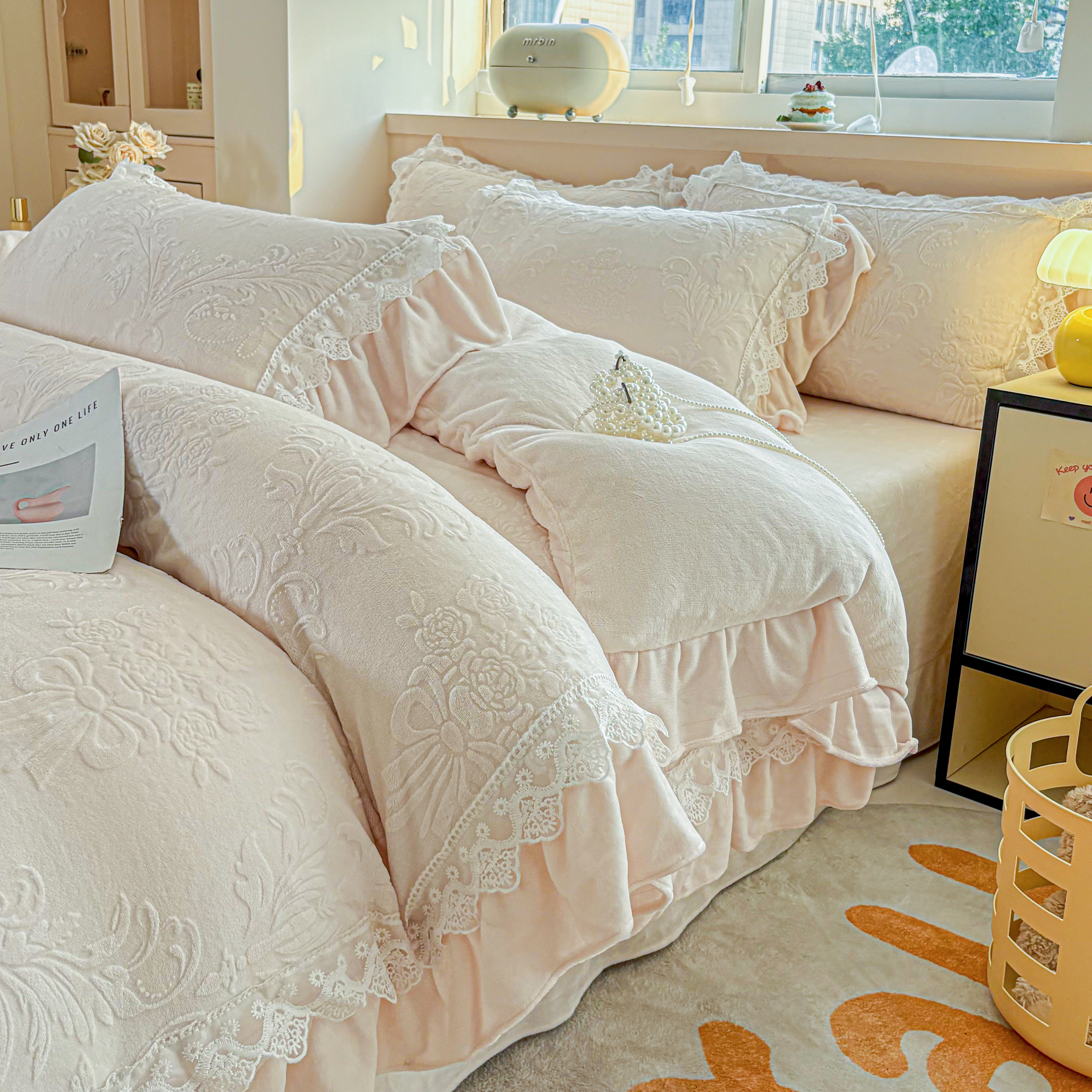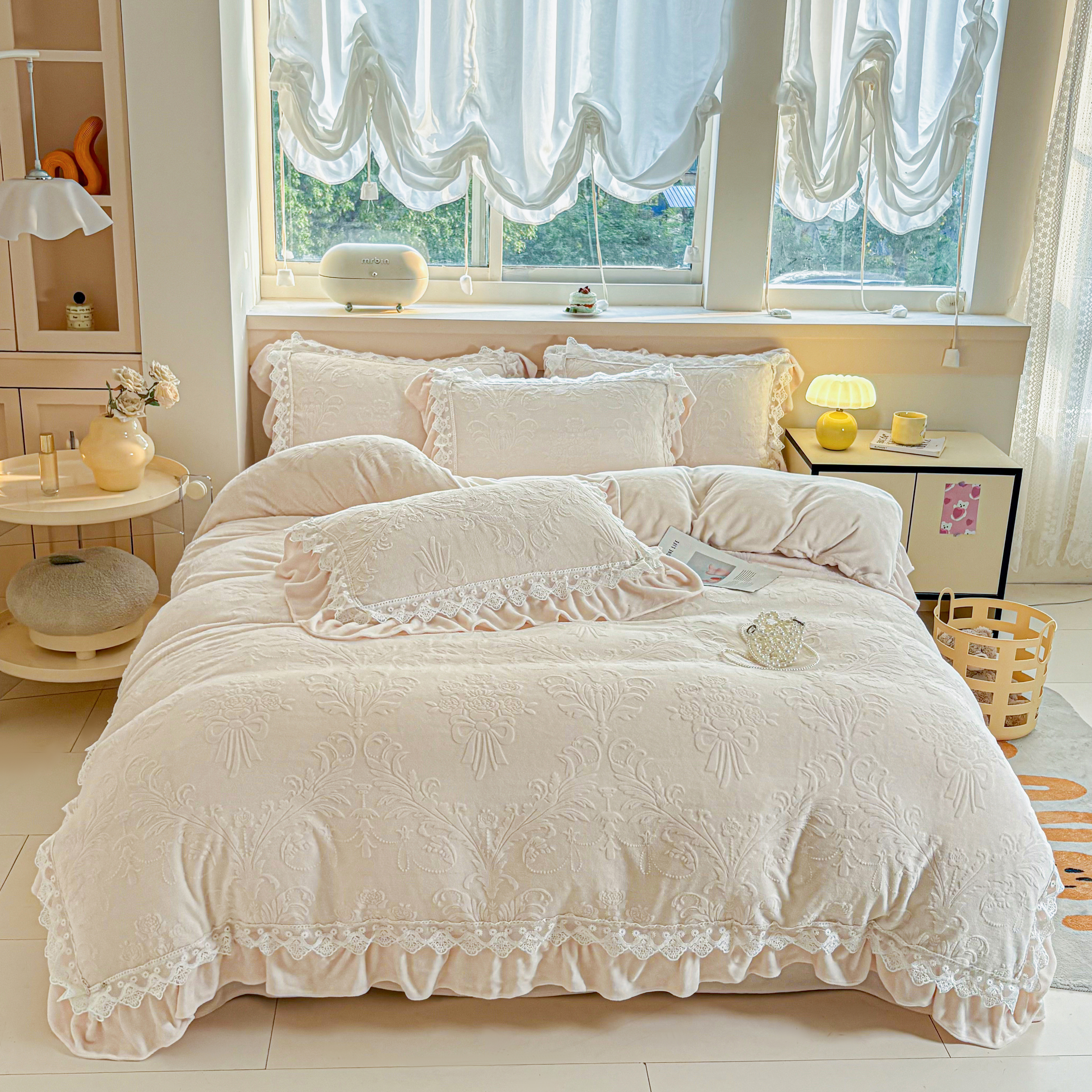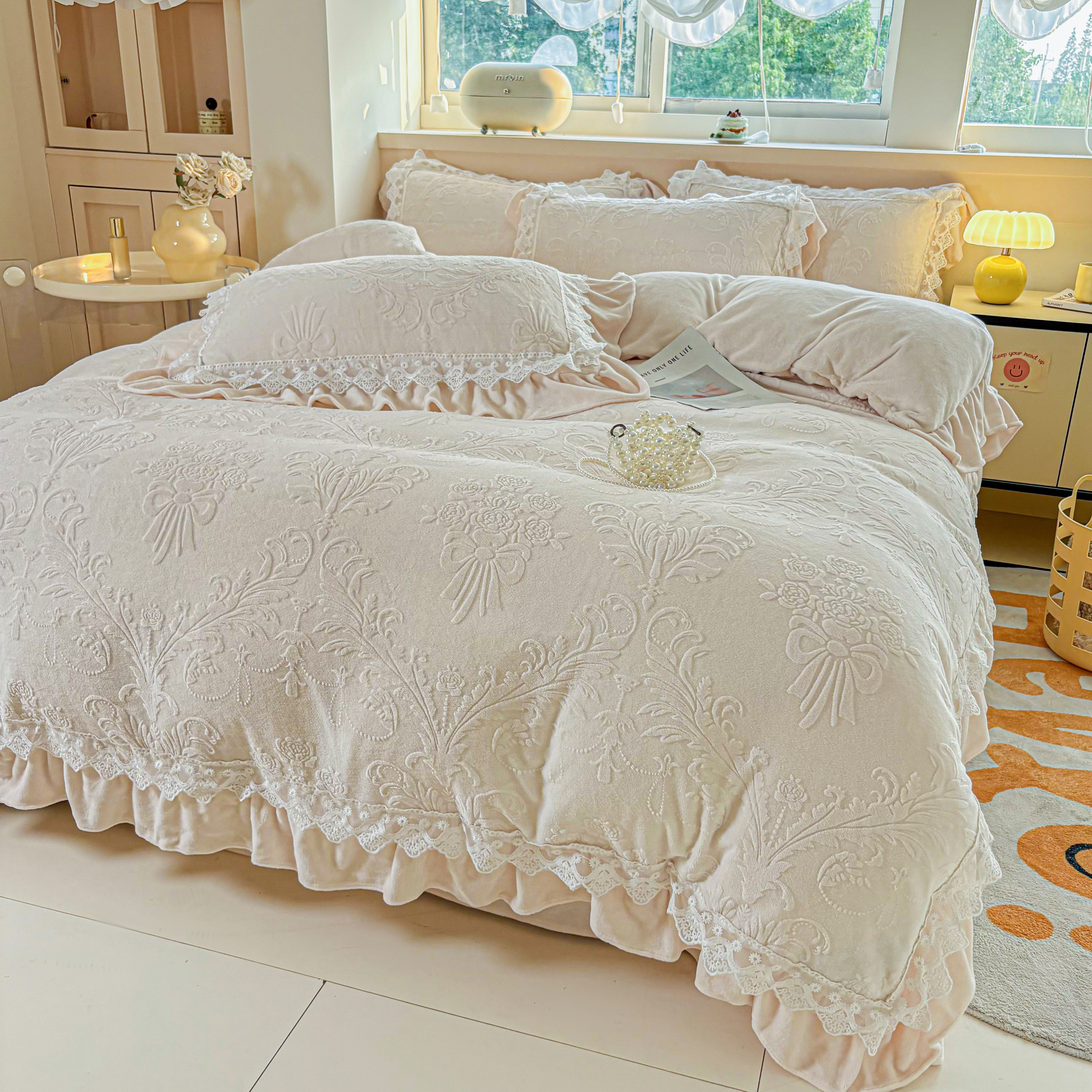 (总)锦格家纺 2025新款A类高克重雕花牛奶绒花边四件套,梦幻-玉粉,初薇-豆沙,初薇-绿,初薇-玉粉,幻梦-黄,幻梦-天蓝,蝶漫-奶白,蝶漫-天蓝