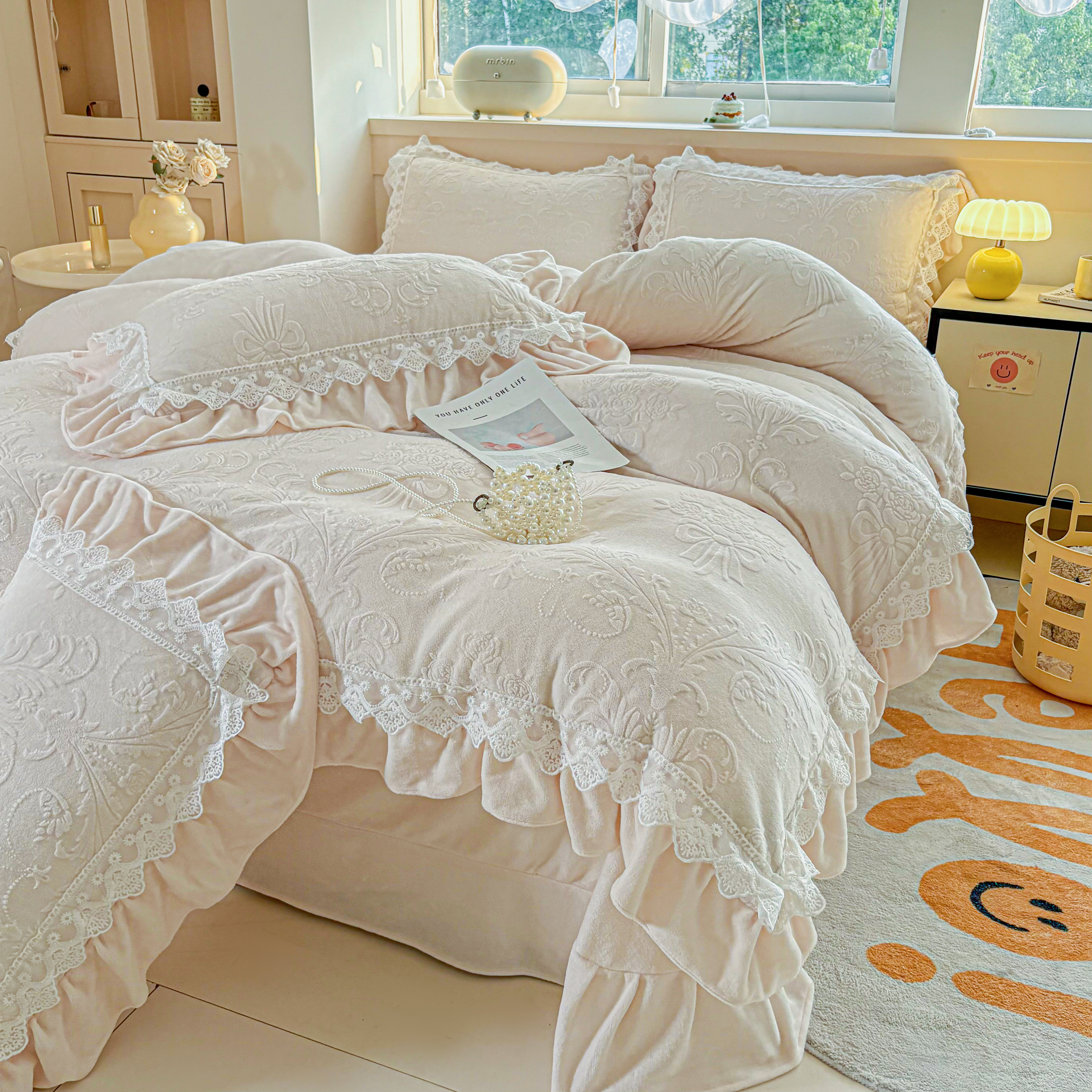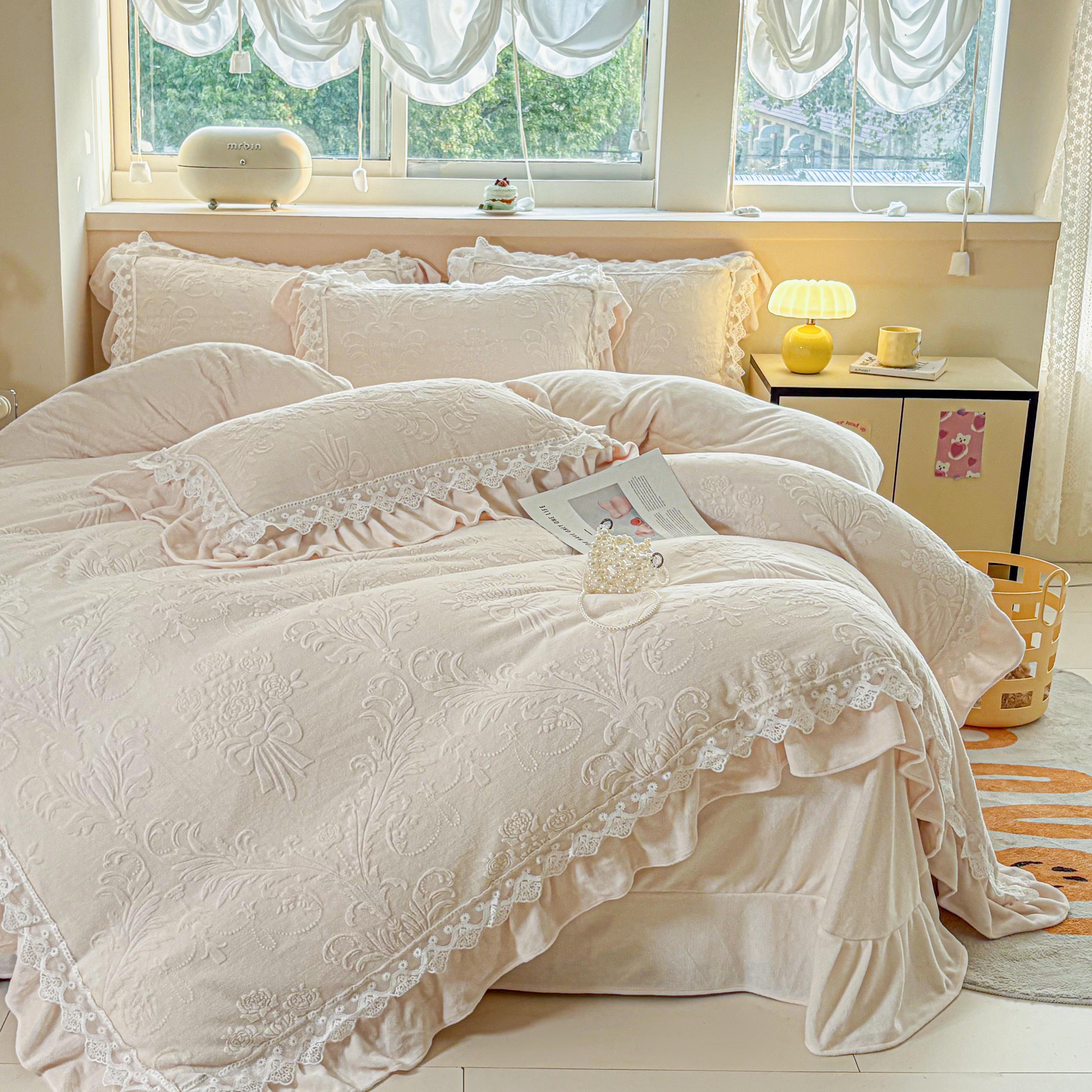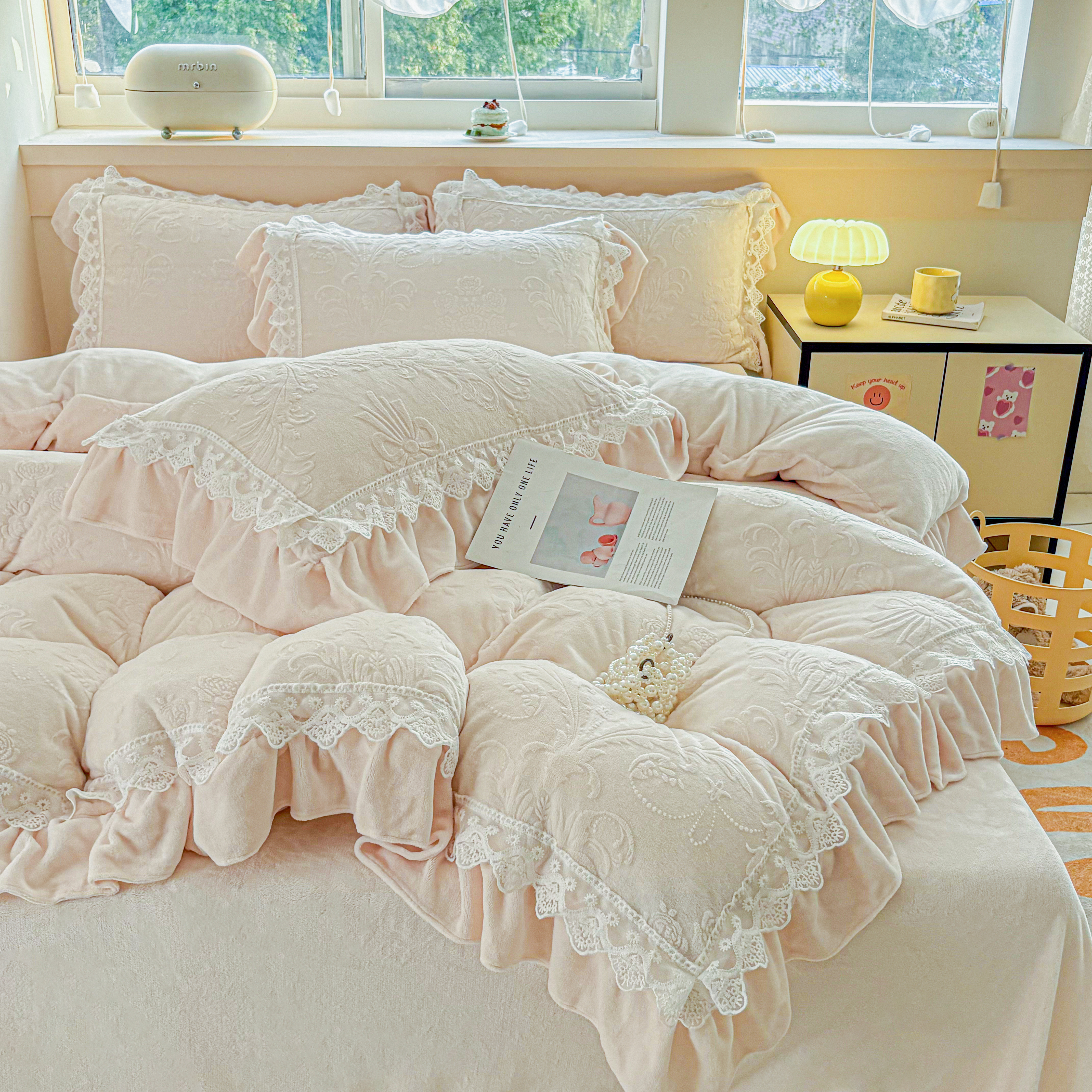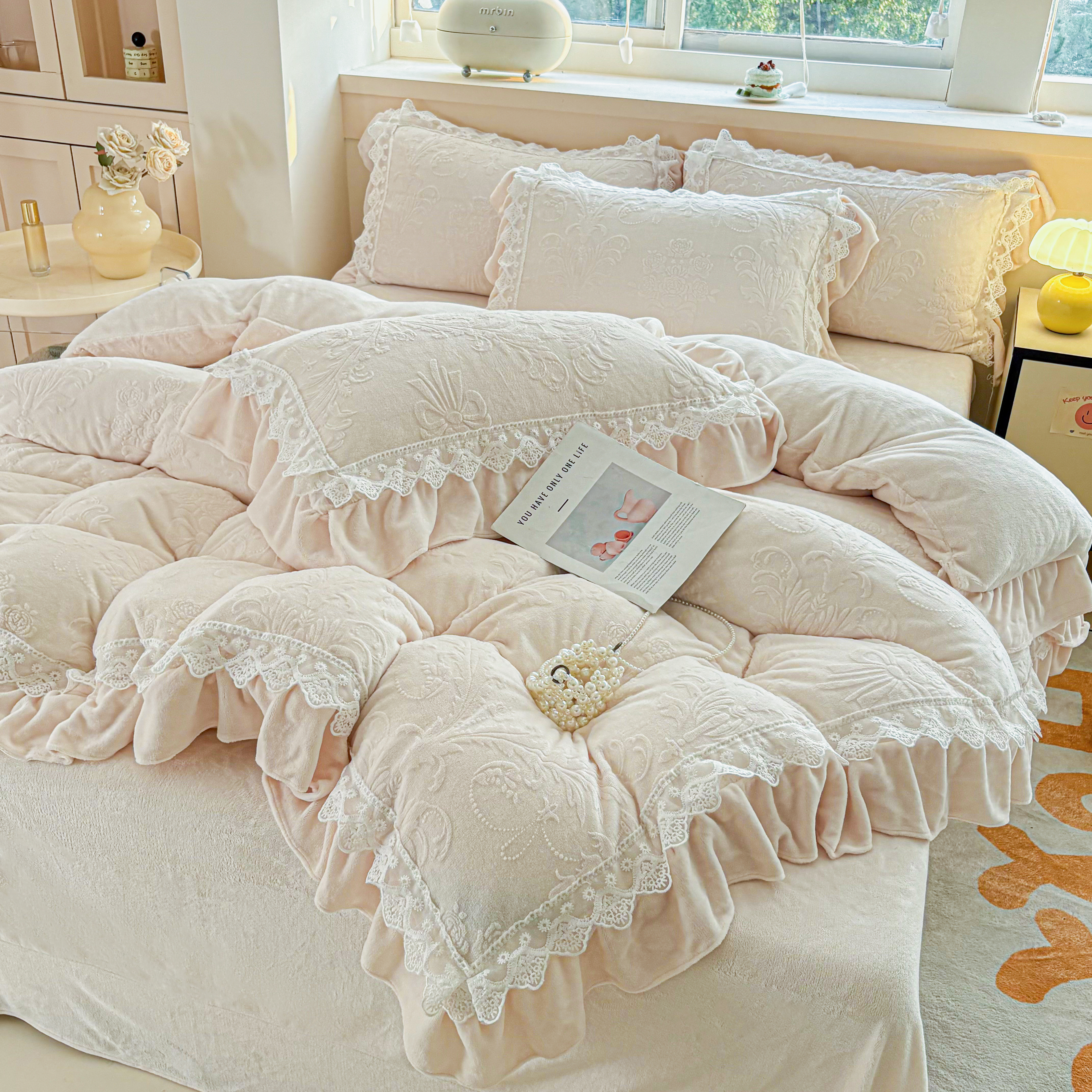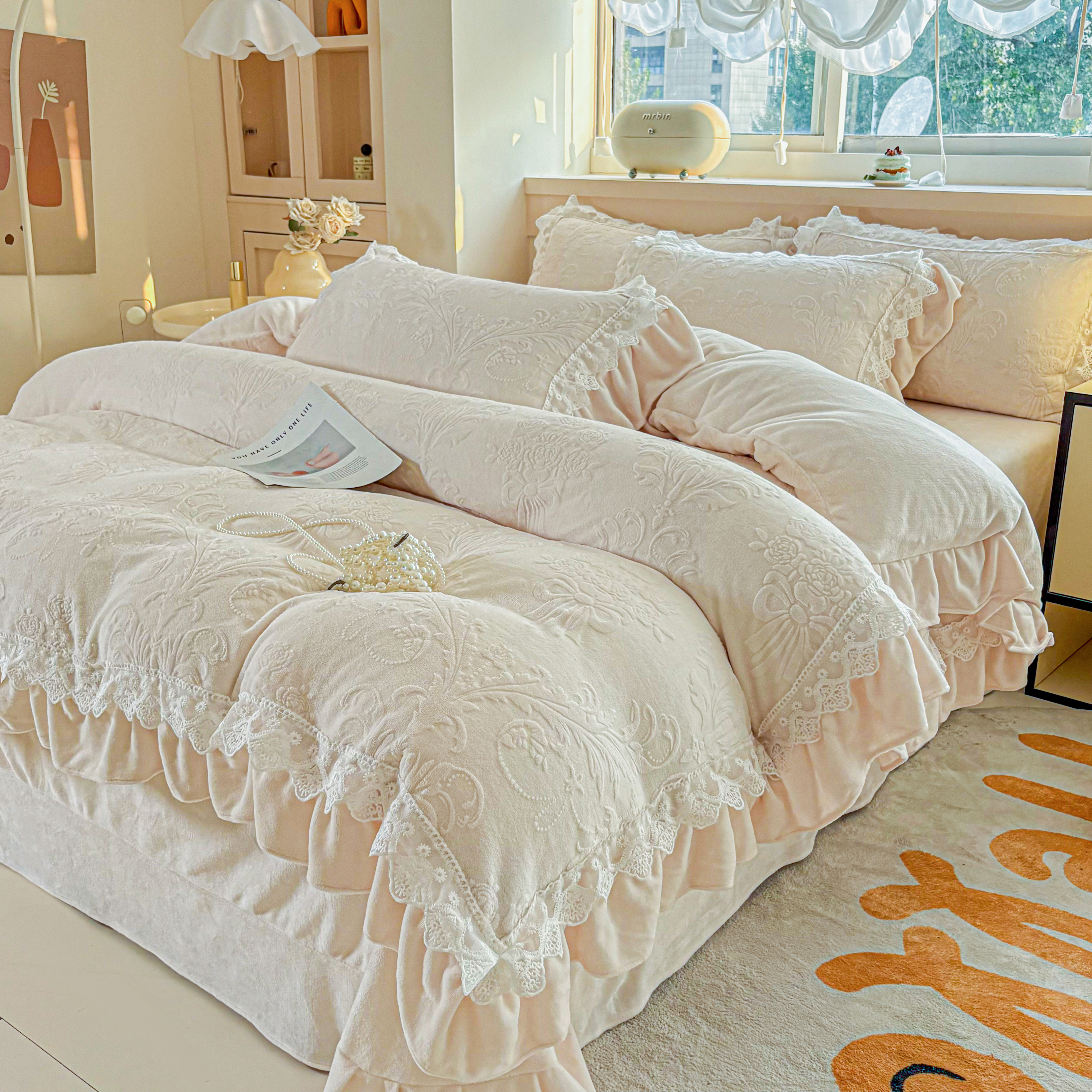 (总)锦格家纺 2025新款A类高克重雕花牛奶绒花边四件套,梦幻-玉粉,初薇-豆沙,初薇-绿,初薇-玉粉,幻梦-黄,幻梦-天蓝,蝶漫-奶白,蝶漫-天蓝