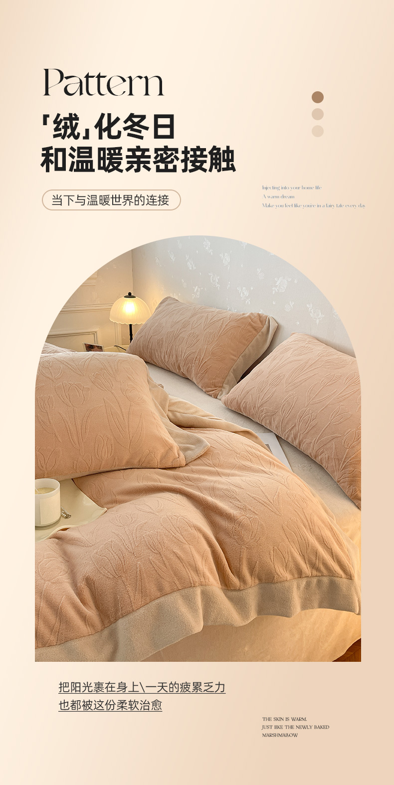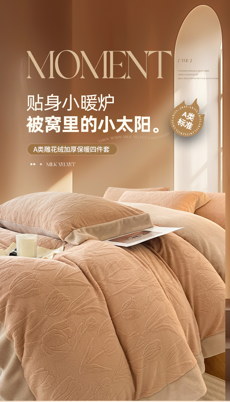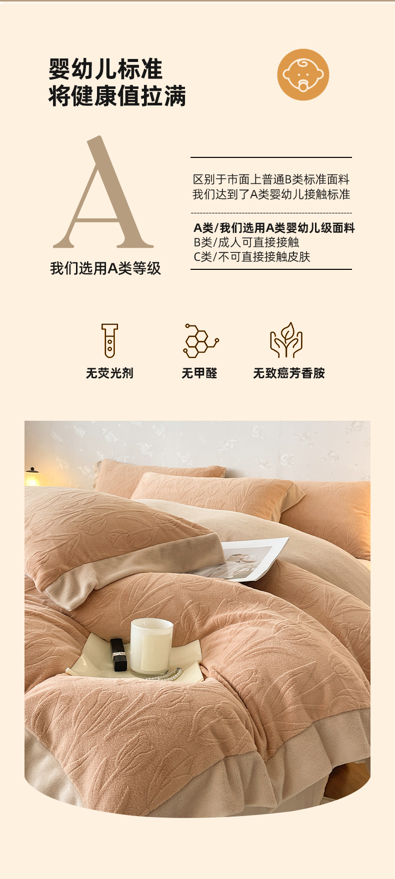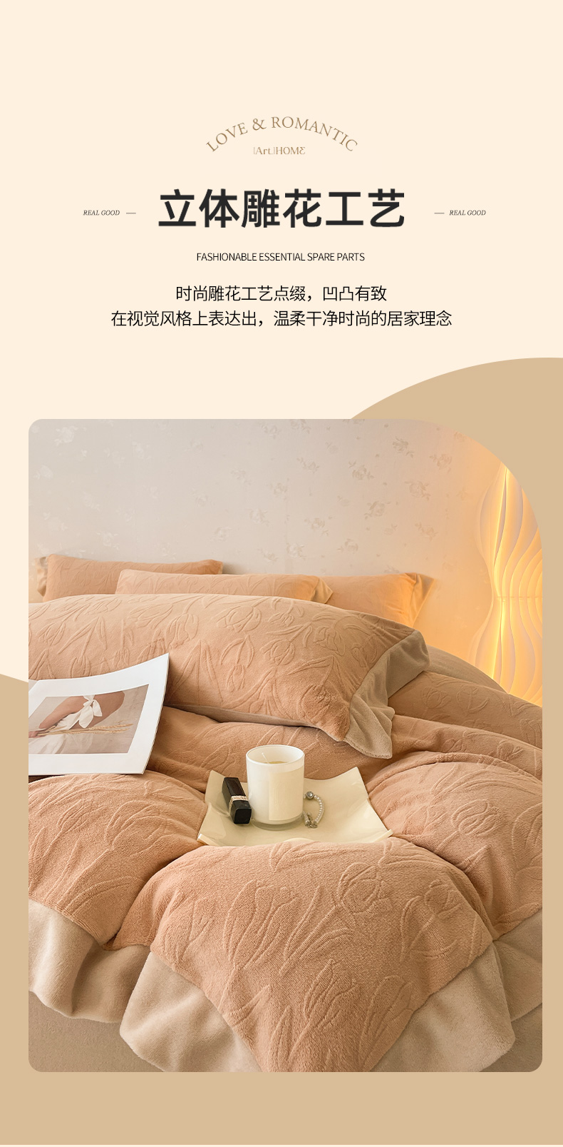 商品名称: 2024秋冬款9斤重高级感雕花牛奶绒四件套加厚珊瑚绒加绒被套床单床笠床上用品-郁金秘语 暖棕色