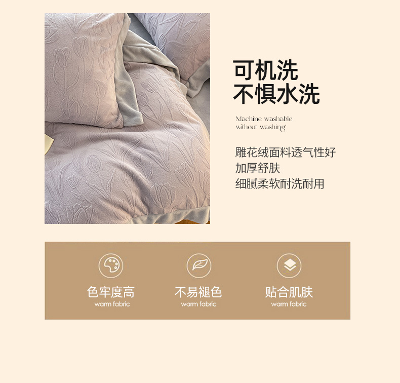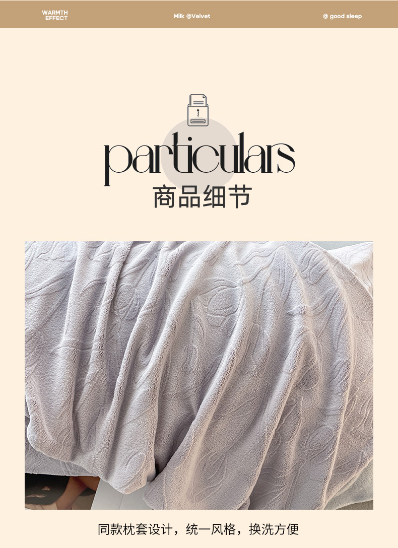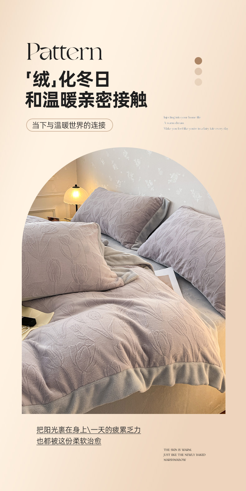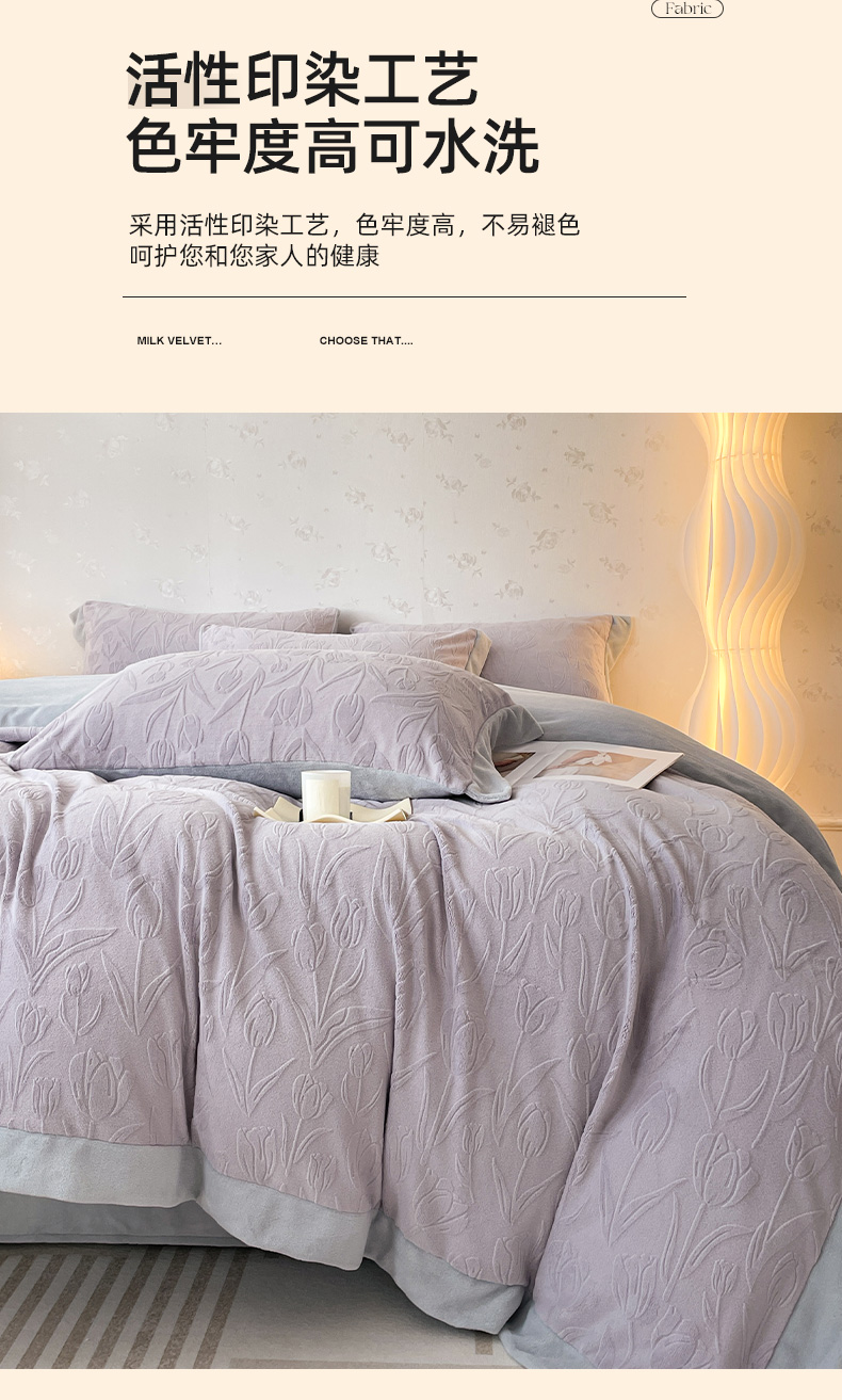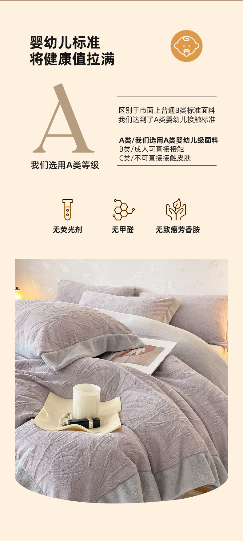 商品名称: 2024秋冬款9斤重高级感雕花牛奶绒四件套加厚珊瑚绒加绒被套床单床笠床上用品-郁金秘语 风信紫
