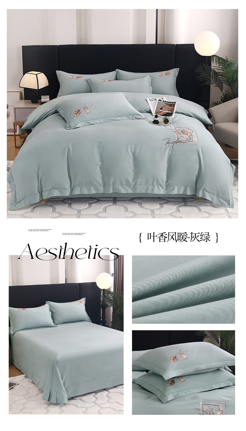 金纱玉纺家纺 2024新款素色加厚公艺绣花四件套 叶香风暖-灰绿