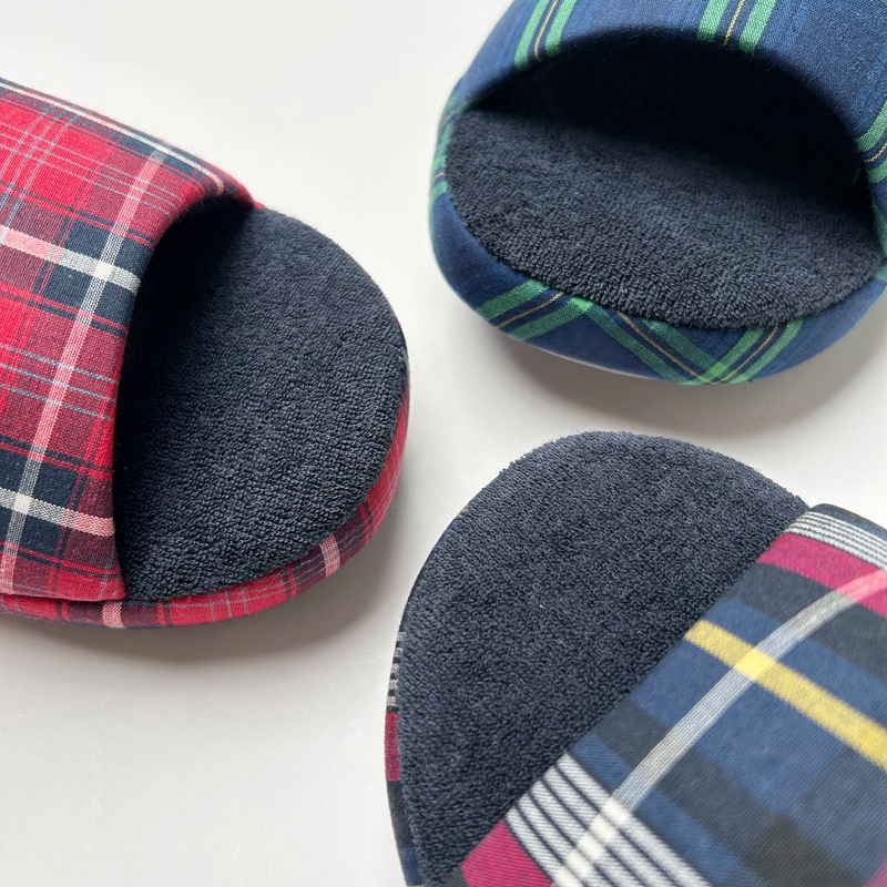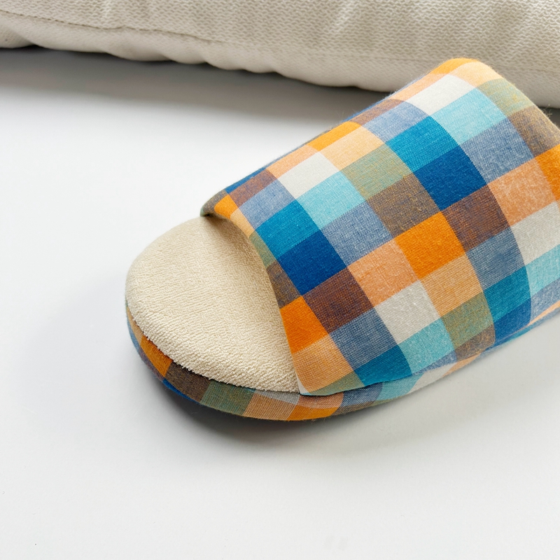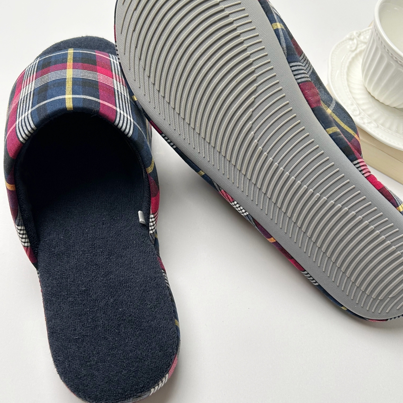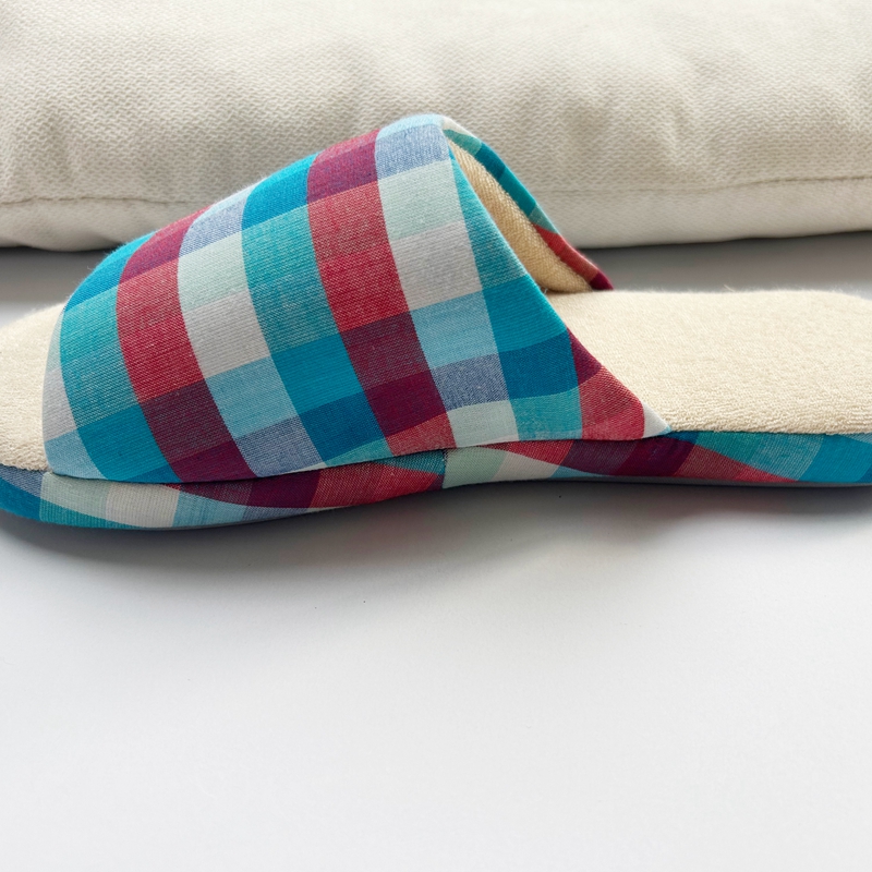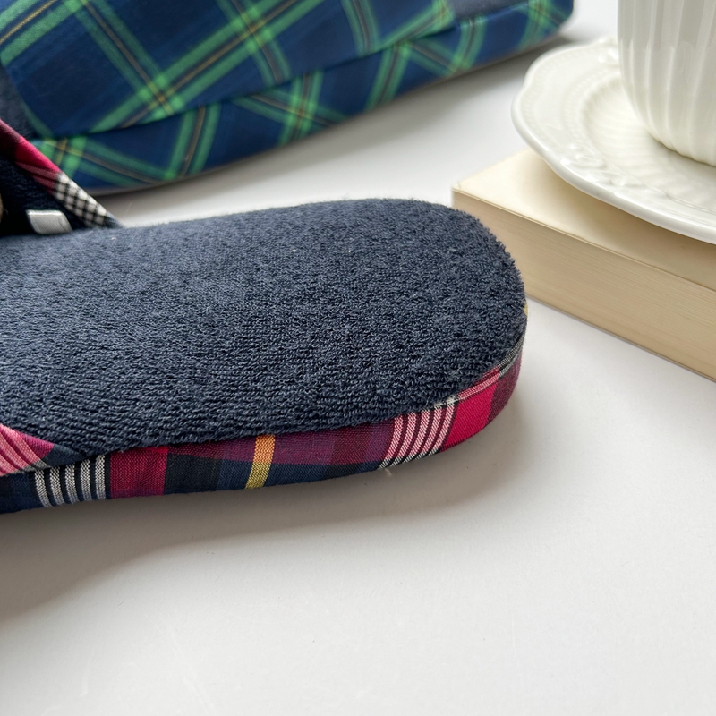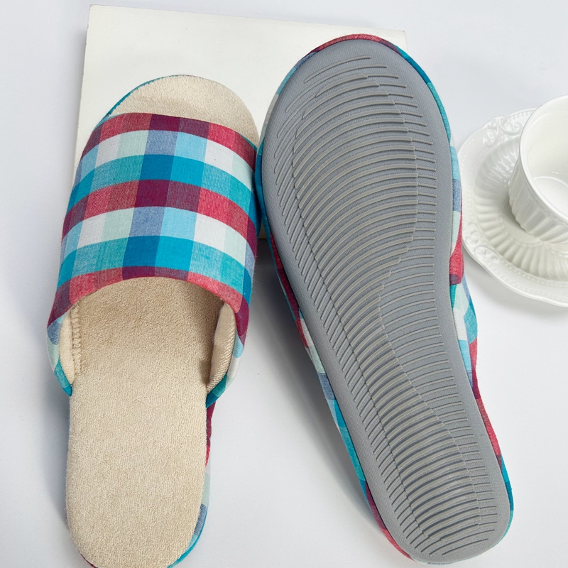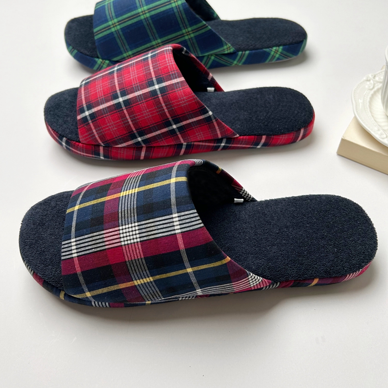 (总)南通盟生鞋业有限公司 2024新款日式开口经典色织格子配毛巾布TPR复布静音防滑大底家居拖鞋